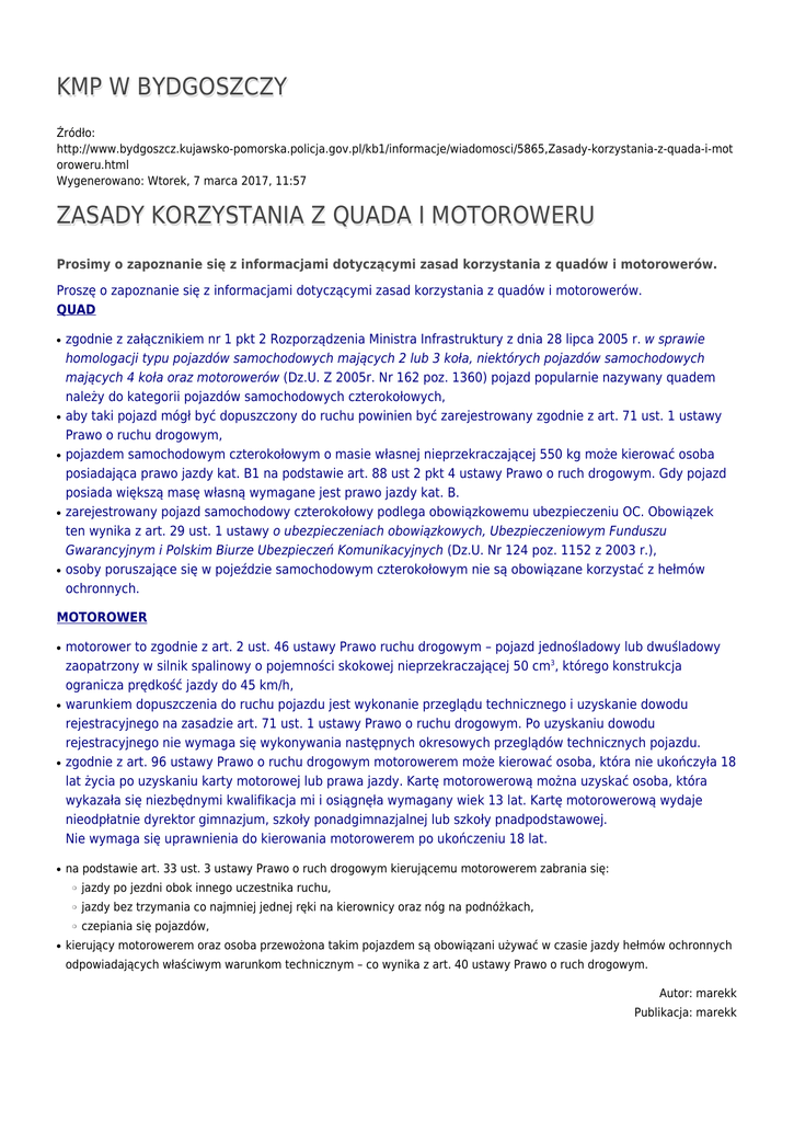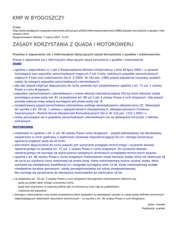 KMP W BYDGOSZCZY Źródło: http://www.bydgoszcz.kujawsko-pomorska.policja.gov.pl/kb1/informacje/wiadomosci/5865,Zasady-korzystania-z-quada-i-mot oroweru.html Wygenerowano: Wtorek, 7 marca 2017, 11:57 ZASADY KORZYSTANIA Z QUADA I MOTOROWERU Prosimy o zapoznanie się z informacjami dotyczącymi zasad korzystania z quadów i motorowerów. Proszę o zapoznanie się z informacjami dotyczącymi zasad korzystania z quadów i motorowerów. QUAD ● ● ● ● ● zgodnie z załącznikiem nr 1 pkt 2 Rozporządzenia Ministra Infrastruktury z dnia 28 lipca 2005 r. w sprawie homologacji typu pojazdów samochodowych mających 2 lub 3 koła, niektórych pojazdów samochodowych mających 4 koła oraz motorowerów (Dz.U. Z 2005r. Nr 162 poz. 1360) pojazd popularnie nazywany quadem należy do kategorii pojazdów samochodowych czterokołowych, aby taki pojazd mógł być dopuszczony do ruchu powinien być zarejestrowany zgodnie z art. 71 ust. 1 ustawy Prawo o ruchu drogowym, pojazdem samochodowym czterokołowym o masie własnej nieprzekraczającej 550 kg może kierować osoba posiadająca prawo jazdy kat. B1 na podstawie art. 88 ust 2 pkt 4 ustawy Prawo o ruch drogowym. Gdy pojazd posiada większą masę własną wymagane jest prawo jazdy kat. B. zarejestrowany pojazd samochodowy czterokołowy podlega obowiązkowemu ubezpieczeniu OC. Obowiązek ten wynika z art. 29 ust. 1 ustawy o ubezpieczeniach obowiązkowych, Ubezpieczeniowym Funduszu Gwarancyjnym i Polskim Biurze Ubezpieczeń Komunikacyjnych (Dz.U. Nr 124 poz. 1152 z 2003 r.), osoby poruszające się w pojeździe samochodowym czterokołowym nie są obowiązane korzystać z hełmów ochronnych. MOTOROWER ● ● ● ● ● motorower to zgodnie z art. 2 ust. 46 ustawy Prawo ruchu drogowym – pojazd jednośladowy lub dwuśladowy zaopatrzony w silnik spalinowy o pojemności skokowej nieprzekraczającej 50 cm3, którego konstrukcja ogranicza prędkość jazdy do 45 km/h, warunkiem dopuszczenia do ruchu pojazdu jest wykonanie przeglądu technicznego i uzyskanie dowodu rejestracyjnego na zasadzie art. 71 ust. 1 ustawy Prawo o ruchu drogowym. Po uzyskaniu dowodu rejestracyjnego nie wymaga się wykonywania następnych okresowych przeglądów technicznych pojazdu. zgodnie z art. 96 ustawy Prawo o ruchu drogowym motorowerem może kierować osoba, która nie ukończyła 18 lat życia po uzyskaniu karty motorowej lub prawa jazdy. Kartę motorowerową można uzyskać osoba, która wykazała się niezbędnymi kwalifikacja mi i osiągnęła wymagany wiek 13 lat. Kartę motorowerową wydaje nieodpłatnie dyrektor gimnazjum, szkoły ponadgimnazjalnej lub szkoły pnadpodstawowej. Nie wymaga się uprawnienia do kierowania motorowerem po ukończeniu 18 lat. na podstawie art. 33 ust. 3 ustawy Prawo o ruch drogowym kierującemu motorowerem zabrania się: ❍ jazdy po jezdni obok innego uczestnika ruchu, ❍ jazdy bez trzymania co najmniej jednej ręki na kierownicy oraz nóg na podnóżkach, ❍ czepiania się pojazdów, kierujący motorowerem oraz osoba przewożona takim pojazdem są obowiązani używać w czasie jazdy hełmów ochronnych odpowiadających właściwym warunkom technicznym – co wynika z art. 40 ustawy Prawo o ruch drogowym. Autor: marekk Publikacja: marekk Ocena: 0/5 (0) Tweetnij