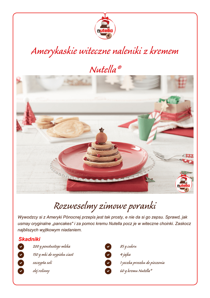 Amerykaskie witeczne naleniki z kremem Nutella® Rozweselmy zimowe poranki Wywodzcy si z Ameryki Pónocnej przepis jest tak prosty, e nie da si go zepsu. Sprawd, jak usmay oryginalne „pancakes" i za pomoc kremu Nutella pocz je w witeczne choinki. Zaskocz najbliszych wyjtkowym niadaniem. Skadniki 200 g penotustego mleka 85 g cukru 150 g mki do wypieku ciast 4 jajka szczypta soli 1 yeczka proszku do pieczenia olej rolinny 60 g kremu Nutella® Krok 1 • Przesiej przez sito mąkę, proszek do pieczenia i sól. • W oddzielnej misce wymieszaj jajka, mleko i cukier. Krok 2 • Dodaj przesianą mąkę do składników mokrych, aż ciasto będzie miało jednolitą konsystencję. Krok 3 • Podgrzej odrobinę oleju roślinnego na patelni z powłoką nieprzywierającą i wylewaj ciasto do ułożonych na niej różnej wielkości okrągłych wykrawarek do ciasta. W ten sposób powstaną naleśniki o różnych rozmiarach. • Pamiętaj, że przed wykorzystaniem wykrawarki do ciastek, należy ją posmarować tłuszczem. Krok 4 • Posmaruj naleśniki Nutellą® i poukładaj je jeden na drugim (zaczynając od największego i kończąc na najmniejszym), tak by powstały cztery świąteczne naleśnikowe choinki. Do każdego drzewka dodaj 15 g Nutelli®. • Udekoruj każdą warstwę kilkoma porzeczkami.
