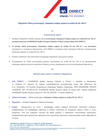 Regulamin Oferty promocyjnej „Ubezpiecz kolejny pojazd ze zniżką 50 lub 100 zł” §1 Postanowienia ogólne 1. Niniejszy Regulamin określa zasady oferty promocyjnej „Ubezpiecz kolejny pojazd ze zniżką 50 lub 100 zł”, prowadzonej przez AVANSSUR Spółka Akcyjna Oddział w Polsce (zwaną dalej AXA DIRECT). 2. W ramach oferty promocyjnej „Ubezpiecz kolejny pojazd ze zniżką 50 lub 100 zł” i na warunkach określonych w niniejszym Regulaminie, AXA DIRECT umożliwia swoim Aktualnym Klientom ubezpieczenie kolejnego pojazdu ze zniżką 50 lub 100 zł. 3. Prawem właściwym dla stosowania niniejszego Regulaminu jest prawo polskie. 4. Przystąpienie do Oferty promocyjnej poprzez skorzystanie ze zniżki 50 lub 100 zł na ubezpieczenie kolejnego pojazdu podczas zawierania Kolejnej umowy ubezpieczenia oznacza akceptację Regulaminu. §2 Definicje pojęć użytych w niniejszym Regulaminie 1. AXA DIRECT – AVANSSUR Spółka Akcyjna Oddział w Polsce, z siedzibą w Warszawie, ul. Chłodna 51, wpisany do rejestru przedsiębiorców prowadzonego przez Sąd Rejonowy dla m.st. Warszawy, XII Wydział Gospodarczy Krajowego Rejestru Sądowego, KRS 0000249486, REGON 140408155; NIP 107-000-33-23. AVANSSUR Spółka Akcyjna należy do Grupy AXA. Kapitał zakładowy AVANSSUR Spółka Akcyjna wynosi 67 155 752, 86 EUR - w całości wpłacony. 2. Oferta promocyjna – Oferta promocyjna „Ubezpiecz kolejny pojazd ze zniżką 50 lub 100 zł”. 3. Regulamin – niniejszy Regulamin Oferty promocyjnej. 4. Pojazd – dopuszczony do ruchu i posiadający ważne badania techniczne samochód osobowy, zarejestrowany lub podlegający rejestracji w Polsce, stosownie do przepisów ustawy Prawo o ruchu drogowym. Pod tym pojęciem rozumie się także pojazdy z nadwoziem samochodów osobowych, zarejestrowane jako samochody ciężarowe oraz samochody terenowe o dopuszczalnej masie całkowitej do 3,5 tony. 5. Kolejny pojazd – Pojazd Aktualnego Klienta, nieubezpieczony w AXA DIRECT w chwili zawierania Kolejnej Umowy ubezpieczenia . 6. Umowa ubezpieczenia – umowa ubezpieczenia zawarta pomiędzy AXA DIRECT a Aktualnym Klientem, obejmująca swoim zakresem ubezpieczenie odpowiedzialności mechanicznych wraz z dowolnymi rozszerzeniami („Pakiet OC”) cywilnej posiadaczy pojazdów lub ubezpieczenie odpowiedzialności cywilnej posiadaczy pojazdów mechanicznych (OC) oraz ubezpieczenie dobrowolne autocasco (AC) wraz z dowolnymi rozszerzeniami („Pakiet OC+AC”). Za Umowę ubezpieczenia w rozumieniu Regulaminu nie są uważane umowy ubezpieczenia zawierane na okres krótszy niż 12 miesięcy (tzw. krótkoterminowe umowy ubezpieczenia). 7. Kolejna Umowa ubezpieczenia – Umowa ubezpieczenia zawarta pomiędzy AXA DIRECT a Aktualnym Klientem dotycząca Kolejnego pojazdu. 8. Aktualny Klient – osoba fizyczna będąca właścicielem lub współwłaścicielem Kolejnego pojazdu objętego Ofertą promocyjną, która w chwili przystąpienia do Oferty promocyjnej posiada zawartą z AXA DIRECT Umowę ubezpieczenia o dowolnym zakresie, na pojazd inny niż Kolejny pojazd objęty Ofertą promocyjną i która spełnia wymogi określone w § 3 niniejszego Regulaminu. Aktualnym Klientem może być również osoba fizyczna prowadząca działalność gospodarczą lub jednostka organizacyjna nieposiadająca osobowości prawnej, o ile Kolejny pojazd objęty Ofertą promocyjną nie służy jej do prowadzenia działalności gospodarczej. 9. Call Center – Centrum telefoniczne AXA DIRECT dostępne pod numerem telefonu 22 599 95 22. 10. Doradca – pracownik AXA DIRECT w Call Center lub osoba świadcząca w imieniu i na rzecz AXA DIRECT usługi w Call Center, na podstawie umowy cywilnoprawnej. 11. Agent - osoba fizyczna lub prawna wykonująca czynności agencyjne na rzecz AXA DIRECT, wpisana do Rejestru Agentów Ubezpieczeniowych. 12. Strona internetowa – strona internetowa AXA DIRECT, zamieszczona pod adresem internetowym www.axadirect.pl. 13. Czas trwania Oferty promocyjnej – okres, w którym Aktualny Klient może skorzystać z Oferty promocyjnej, określony w § 6 niniejszego Regulaminu. 14. Zniżka - jednorazowa zniżka dla Aktualnego Klienta w wysokości: 1) 50 zł w przypadku zawarcia Kolejnej Umowy ubezpieczenia w Pakiecie OC, 2) 100 zł w przypadku zawarcia Kolejnej Umowy ubezpieczenia w Pakiecie OC + AC. liczona od całości składki należnej z tytułu zawarcia Kolejnej Umowy ubezpieczenia §3 Zasady korzystania z Oferty promocyjnej 1. Z Oferty promocyjnej mogą skorzystać Aktualni Klienci, którzy spełnią wszystkie warunki określone w Regulaminie. 2. Oferta promocyjna nie jest przeznaczona jest dla Aktualnych Klientów, którzy w Czasie trwania Oferty promocyjnej składają wniosek o zawarcie Kolejnej Umowy ubezpieczenia przez Internet lub poprzez Agenta. 3. Oferta promocyjna ma zastosowanie do Aktualnych Klientów, którzy w Czasie trwania Oferty promocyjnej wyliczą składkę na ubezpieczenie kolejnego pojazdu należną z tytułu Kolejnej Umowy ubezpieczenia za pośrednictwem Call Center, a następnie na tej podstawie złożą wniosek o zawarcie Kolejnej umowy ubezpieczenia za pośrednictwem Call Center. 4. Ze zniżki w ramach Oferty promocyjnej Aktualny Klient może skorzystać, o ile Kolejna Umowa ubezpieczenia zostanie zawarta nie później niż w terminie 30 dni kalendarzowych od dnia złożenia u Doradcy wniosku o zawarcie Kolejnej Umowy ubezpieczenia. 5. Aktualny Klient, który w terminie do 30 dni przed datą rozpoczęcia czasu trwania Oferty promocyjnej otrzymał od AXA DIRECT propozycję zawarcia Kolejnej Umowy ubezpieczenia, może skorzystać z Oferty promocyjnej pod warunkiem, że ponownie złoży wniosek o zawarcie Kolejnej Umowy ubezpieczenia przez Call Center, co oznacza że zagwarantowany w dotychczasowej propozycji zawarcia Kolejnej Umowy ubezpieczenia zakres ochrony oraz wysokość składki mogą ulec zmianie. 6. Z Oferty promocyjnej nie mogą skorzystać osoby nie będące Aktualnym Klientem oraz Aktu