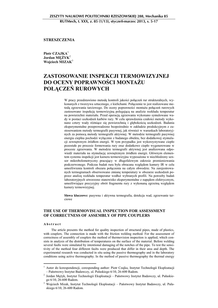 ZESZYTY NAUKOWE POLITECHNIKI RZESZOWSKIEJ 288, Mechanika 85 RUTMech, t. XXX, z. 85 (1/13), styczeń-marzec 2013, s. 5-17 STRESZCZENIA Piotr CZAJKA1 Jordan MĘŻYK2 Wojciech MIZAK3 ZASTOSOWANIE INSPEKCJI TERMOWIZYJNEJ DO OCENY POPRAWNOŚCI MONTAŻU POŁĄCZEŃ RUROWYCH W pracy przedstawiono metodę kontroli jakości połączeń rur strukturalnych, wykonanych z tworzywa sztucznego, z kielichami. Połączenie to jest realizowane metodą zgrzewania tarciowego. Do oceny poprawności montażu połączeń rurowych zastosowano inspekcję termowizyjną polegającą na analizie rozkładu temperatur na powierzchni materiału. Przed operacją zgrzewania wykonano symulowane wady w postaci uszkodzeń karbów rury. W celu sprawdzenia czułości metody wykonano cztery wady różniące się powierzchnią i głębokością uszkodzeń. Badania eksperymentalne przeprowadzono bezpośrednio w zakładzie produkcyjnym z zastosowaniem metody termografii pasywnej, jak również w warunkach laboratoryjnych za pomocą metody termografii aktywnej. W metodzie termografii pasywnej energia cieplna pochodzi wyłącznie z badanego obiektu, bez dodatkowej stymulacji zewnętrznym źródłem energii. W tym przypadku jest wykorzystywane ciepło pozostałe po procesie formowania rury oraz dodatkowo ciepło wygenerowane w procesie zgrzewania. W metodzie termografii aktywnej jest analizowana odpowiedź materiału na stymulację zewnętrznym źródłem energii. Głównym elementem systemu inspekcji jest kamera termowizyjna wyposażona w niechłodzony sensor mikrobolometryczny pracujący w długofalowym zakresie promieniowania podczerwonego. Podczas badań rura była obracana względem kamery IR w celu umożliwienia kontroli obszaru połączenia na całym obwodzie. Na zarejestrowanych termogramach obserwowano zmianę temperatury w obszarze uszkodzeń poprzez analizę rozkładu temperatur wzdłuż wybranych profili. Na potrzeby badań laboratoryjnych utworzono stanowisko eksperymentalne z napędem elektrycznym, umożliwiające precyzyjny obrót fragmentu rury z wykonaną zgrzeiną względem kamery termowizyjnej. Słowa kluczowe: pasywna i aktywna termografia, detekcja wad, zgrzewanie tarciowe THE USE OF THERMOVISUAL INSPECTION FOR ASSESSMENT OF CORRECTNESS OF ASSEMBLY OF PIPE COUPLERS Abstract The article presents the method for quality inspection of structural pipes, made of plastics, with couplers. The connection is made with the friction welding method. For the assessment of correctness of assembly of couplers the method of thermovision inspection is applied, which consists in analysis of the distribution of temperatures on the surface of the material. Before welding several faults were simulated by intentional damaging of the notches of the pipe. To test the sensitivity of the method four different faults were produced that differ in their area and depth. The experimental research was conducted in situ using the passive thermography and in the laboratory conditions using active thermography. In the method of passive thermography the thermal energy 1 2 3 Autor do korespondencji, coresponding author: Piotr Czajka, Instytut Technologii Eksploatacji – Państwowy Instytut Badawczy, ul. Pułaskiego 6/10, 26-600 Radom. Jordan Mężyk, Instytut Technologii Eksploatacji – Państwowy Instytut Badawczy, ul. Pułaskiego 6/10, 26-600 Radom. Wojciech Mizak, Instytut Technologii Eksploatacji – Państwowy Instytut Badawczy, ul. Pułaskiego 6/10, 26-600 Radom. comes only from the object under test, without additional stimulation with external heat source. In such case the heat remaining after the pipe forming process is used as well as the heat generated during the welding process. In the method of active thermography the response of the material to the stimulation with external heat source is analysed. The main element of the inspection system is an infrared camera, equipped with non-cooled microbolometric sensor working in long-wave band of the infrared radiation. During tests the pipe was turned in relation to the IR camera to allow measurements of the weld along the whole circumference of the coupler. The variation of the temperature along selected profiles was observed on the recorded thermograms and analysed. To make the laboratory research possible, a special experimental test stand with electric motor was made, that allows precise rotation of the part of the pipe with welded coupler in relation to the infrared camera. Keywords: passive and active thermography, defect detection, friction welding DOI: 10.7862/rm.2013.1 -----------------------------------------------------------------------------------------------Roman KIELEC4 Jarosław NOWACZYK5 ANALIZA I OCENA JAKOŚCI PROCESU SPAWANIA URZĄDZEŃ GRZEWCZYCH W pracy przeprowadzono analizę nieciągłości połączeń spawanych i ich wpływu na nieszczelność urządzeń grzewczych. Prawidłowy wymiar i szczelność są najważniejszymi cechami zarówno w przypadku sprzęgła hydraulicznego, kolektora, rozdzielacza kotłowego, jak i dla każdego innego produktu wytwarzanego przez przedsiębiorstwo, ze względu na ich zastosowanie w instalacjach grzewczych. Mimo że produkty firmy charakteryzują się wysoką jakością, to pod względem realizacji procesu wytwórczego pewne obowiązki zostały zlekceważone. Brak odpowiedniego systemu kontroli między operacjami technologicznymi oraz wadliwe wyroby są najczęściej identyfikowane na końcu procesu, podczas kontroli oraz testów szczelności. Konsekwencją tego jest wykonywanie dodatkowej pracy, a co za tym idzie ograniczenie zdolności produkcyjnej firmy. Dzięki wykorzystaniu wybranych narzędzi badawczych zidentyfikowano wady złączy spawanych oraz oszacowano ich wpływ na jakość produktu. Defekty zaobserwowane w ciągu okresów badawczych poddano analizie mapowania procesu produkcyjnego oraz FMEA. Przeprowadzono szacunkową kalkulację strat przedsiębiorstwa. Na podstawie wyników badań podano propozycje działań naprawczy