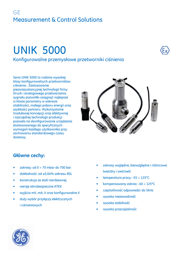 GE Measurement & Control Solutions UNIK 5000 Konfigurowalne przemysłowe przetworniki ciśnienia Seria UNIK 5000 to rodzina wysokiej klasy konfigurowalnych przetworników ciśnienia. Zastosowanie piezorezystancyjnej technologii firmy Druck i analogowego przetwarzania sygnału pozwoliło osiągnąć najlepsze w klasie parametry w zakresie stabilności, małego poboru energii oraz szybkości pomiaru. Wykorzystanie modułowej koncepcji oraz efektywnej i oszczędnej technologii produkcji pozwala na skonfigurowanie urządzenia dostosowanego do specyficznych wymagań każdego użytkownika przy zachowaniu standardowego czasu dostawy. Główne cechy: • zakresy: od 0 ÷ 70 mbar do 700 bar • dokładność: od ±0.04% zakresu BSL • konstrukcja ze stali nierdzewnej • wersje iskrobezpieczne ATEX • wyjścia mV, mA, V oraz konfigurowalne V • duży wybór przyłączy elektrycznych i ciśnieniowych • zakresy względne, bezwzględne i różnicowe (wet/dry i wet/wet) • temperatura pracy: -55 ÷ 125°C • kompensowany zakres: -40 ÷ 125°C • częstotliwość odpowiedzi: do 5kHz • wysoka niezawodność • wysoka stabilność • wysoka przeciążalność Parametry techniczne: Zakresy (FS*) Zasilanie oraz wyjścia elektryczne Opcja Opis Zasilanie [V] Wyjście Pobór prądu [mA] 2,5-12 10 mV/V ^ <2 przy 10V 7-12 10 mV/V ^ <3 Ciśnienie względne 0 mV pasywne dowolny zakres od 0 ÷ 70 mbar do 0 ÷ 70 bar 1 mV linearyzowane Ciśnienie względne (izolowane) 2 mA 7-28** 4-20 mA <30 dowolny zakres od 0 ÷ 10 bar do 0 ÷ 700 bar 3 0-5 V (4 przewody) 7-16** 0-5 V <3 Ciśnienie bezwzględne (absolutne) 4 0-5 V (3 przewody) 7-16** 0-5 V* <3 dowolny zakres od 0 ÷ 100 mbar do 0 ÷ 700 bar 5 1-6 V (3 przewody) 7-16** 1-6 V <3 Ciśnienie różnicowe 6 0-10 V (4 przewody) 12-16** 0-10 V <3 wersje Wet/Dry Jedno- lub dwukierunkowe 70 mbar do 35 bar 7 0,5-4,5 V ratiometryczne 5,0 ± 0,5 0,5-4,5 V 8 izolowane/konfigurowalne wersje Wet/Wet Jedno- lub dwukierunkowe: 350 mbar do 35 bar 7-36 patrz niżej <3 patrz niżej zakresy barometryczne dostępne są od minimalnej rozpiętości zakresu równej 350 mbar ^ przy zasilaniu 10 V czujniki z wyjściem mV dają sygnał 100mV dla pełnej wartości zakresu pomiarowego (FS). • wyjście jest ratiometryczne w stos. do napięcia zasilania • wartość sygnału wyjściowego zmniejsza się proporcjonalnie poniżej 350 bar * wyjście 3 przewodowe 0-5 V nie osiąga wartości zerowej dla zerowej wartości ciśnienia. Minimalna wartość sygnału jest mniejsza niż 50mV. ** 7-32 V przy pracy w strefach bezpiecznych Zakresy niestandardowe Wyjście izolowane/konfigurowalne (opcja 8) Dostępne są zakresy pomiarowe nie zaczynające się w zerze. Proszę o kontakt z GE aby dowiedzieć się więcej. Możliwa jest dowolna konfiguracja sygnału wyjściowego z uwzględnieniem następujących ograniczeń: • minimalna rozpiętość zakresu: 2V • maksymalna rozpiętość zakresu: 20 V • dolna/górna granica sygnału na wyjściu: ±10V • maksymalne przesunięcie zera: ± zakres Dostępne jest wyjście o odwróconej charakterystyce. Sygnał wyjściowy reaguje na zmiany sygnału wejściowego do wartości 110% zakresu, np. przy wybraniu wyjścia 0-10V, sygnał wyjściowy będzie rosnąć proporcjonalnie co najmniej do 11 V. Przy zasilaniu 7 V DC pobór prądu wynosi <20mA, zmniejszając się do <5mA przy zasilaniu 32 V DC. W trakcie uruchomienia pobór prądu (typowy) < 100mA przez 10 s. Uwaga: ograniczenie do 80⁰C dla tej opcji. Ciśnienie statyczne: maksymalnie 70 bar Zakresy barometryczne Przeciążalność • • • • 10 x FS dla zakresów do 150mbar 6 x FS dla zakresów do 700 mbar 2 x FS dla zakresów barometrycznych 4 x FS dla pozostałych zakresów: (do 200 bar dla zakresów ≤ 70 bar, do 1200 bar dla zakresów >70 bar) Dla zakresów różnicowych ciśnienie ujemne nie może przekraczać ciśnienia dodatniego o więcej niż: • 6 x FS dla zakresów do 150 mbar • 4 x FS dla zakresów do 700 mbar • 2 x FS dla pozostałych zakresów do max 15 bar Ciśnienie niszczące Przykłady konfiguracji Dozwolone zakresy -10 do 0 V 0-12 V (poza granicami ±10V) 0 do 5 V 6-10 V (za duże przesunięcie zera) -5 do +5 V 0 do 0,5 V (za mała rozpiętość zakresu) Niedozwolone zakresy Ciśnienie względne, absolutne i różnicowe (wejście +ve): • 10 x FS dla zakresów do 150 bar • 6 x FS dla zakresów do 70 bar (200 bar maks.) • 200 bar (ciśnienie bezwzględne) dla zakresów do 70 bar • 1200 bar dla zakresów powyżej 70 bar Różnica ciśnień miedzy stroną niską (-ve) a wysoką (+ve) nie powinna byś większa niż 6 x FS (15 bar). Czas gotowości urządzenia *FS – zakres, pełna skala (ang. FS = Full Scale) • wersje z wyjściem mV, V i mA: 10 ms • wersje z wyjściem izolowanym/konfigurowalnym: 500 ms -2 do 10V 1 do 6 V 10 do 0 V Izolacja • 500 V DC: 100 MΩ • 500 V AC: prądu upływu: < 5 mA (tylko wersje mV i mA). Funkcja diagnostyczna obwodu Wyjście mV pasywne Funkcja testowania obwodu, która po zwarciu odpowiednich styków (Shunt Cal) daje na wyjściu sygnał równy wartości 80% zakresu symulując zadanie ciśnienia o podobnej wartości. Modele z wyjściem mV oraz izolowanym/konfigurowalnym standardowo wyposażone są w tą funkcję. Nie jest ona dostępna dla modeli z przyłączem DIN lub M12 x 1 (opcja 7, D i G). ≤ 70 bar Standardowa/podwyższona Premium > 70 bar standardowa/podwyższona Premium Sposób aktywowania funkcji diagnostycznej zależy od wersji przetwornika oraz typu przyłącza elektrycznego: • wyjście mV: należy połączyć zacisk testowy (Shunt Cal) do zacisku zasilania -ve lub (jeśli dostępne) połączyć ze sobą oba zaciski testowe. • wyjście izolowane/konfigurowalne: należy połączyć zacisk testowy (Shunt Cal) do zacisku wyjścia -ve lub (jeśli dostępne) połączyć ze sobą oba zaciski testowe. Parametry metrologiczne ±0,2% FS BSL niedostępna ±0,5% FS BSL niedostępna Przesunięcie zera i zakresu Wyjścia mA