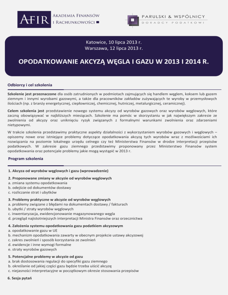Katowice, 10 lipca 2013 r. Warszawa, 12 lipca 2013 r. OPODATKOWANIE AKCYZĄ WĘGLA I GAZU W 2013 I 2014 R. Odbiorcy i cel szkolenia Szkolenie jest przeznaczone dla osób zatrudnionych w podmiotach zajmujących się handlem węglem, koksem lub gazem ziemnym i innymi wyrobami gazowymi, a także dla pracowników zakładów zużywających te wyroby w przemysłowych ilościach (np. z branży energetycznej, ciepłowniczej, chemicznej, hutniczej, metalurgicznej, ceramicznej). Celem szkolenia jest przedstawienie nowego systemu akcyzy od wyrobów gazowych oraz wyrobów węglowych, które zaczną obowiązywać w najbliższych miesiącach. Szkolenie ma pomóc w skorzystaniu w jak największym zakresie ze zwolnienia od akcyzy oraz uniknięciu ryzyk związanych z formalnymi warunkami zwolnienia oraz zdarzeniami nietypowymi. W trakcie szkolenia przedstawimy praktyczne aspekty działalności z wykorzystaniem wyrobów gazowych i węglowych – opiszemy nowe oraz istniejące problemy dotyczące opodatkowania akcyzą tych wyrobów wraz z możliwościami ich rozwiązania na poziomie lokalnego urzędu celnego czy też Ministerstwa Finansów w drodze interpretacji przepisów podatkowych. W zakresie gazu ziemnego przedstawimy proponowany przez Ministerstwo Finansów system opodatkowania oraz potencjale problemy jakie mogą wystąpić w 2013 r. Program szkolenia 1. Akcyza od wyrobów węglowych i gazu (wprowadzenie) 2. Proponowane zmiany w akcyzie od wyrobów węglowych a. zmiana systemu opodatkowania b. odejście od dokumentów dostawy c. rozliczanie strat i ubytków 3. Problemy praktyczne w akcyzie od wyrobów węglowych a. problemy związane z błędami na dokumentach dostawy / fakturach b. ubytki / straty wyrobów węglowych c. inwentaryzacja, ewidencjonowanie magazynowanego węgla d. przegląd najistotniejszych interpretacji Ministra Finansów oraz orzecznictwa 4. Założenia systemu opodatkowania gazu podatkiem akcyzowym a. opodatkowanie gazu w UE b. mechanizm opodatkowania zawarty w obecnym projekcie ustawy akcyzowej c. zakres zwolnień i sposób korzystania ze zwolnień d. ewidencje i inne wymogi formalne e. straty wyrobów gazowych 5. Potencjalne problemy w akcyzie od gazu a. brak dostosowania regulacji do specyfiki gazu ziemnego b. określanie od jakiej części gazu będzie trzeba uiścić akcyzę c. niejasności interpretacyjne w początkowym okresie stosowania przepisów 6. Sesja pytań Wykładowcy Szymon Parulski – jest doradcą podatkowym, prowadzącym kancelarię doradztwa podatkowego Parulski & Wspólnicy. Posiada wieloletnie doświadczenie uzyskane w największych międzynarodowych firmach doradczych: PricewaterhouseCoopers (2003–2004) oraz Ernst & Young (2004–2009). Szymon specjalizuje się w podatkach pośrednich – akcyzie, podatku VAT oraz należnościach celnych. Współpracuje z organizacjami branżowymi oraz największymi podmiotami z branży petrochemicznej, energetycznej, alkoholowej i tytoniowej. W 2006 r. jako zewnętrzny ekspert w Ministerstwie Finansów Szymon Parulski pracował nad zmianą przepisów akcyzowych. Jest autorem komentarza do ustawy o podatku akcyzowym oraz współautorem komentarza „Opodatkowanie podatkiem akcyzowym wyrobów węglowych”. W rankingu „Rzeczpospolitej” Szymon jako pierwszy doradca podatkowy w Polsce został uznany za eksperta rekomendowanego w zakresie podatku akcyzowego. Szymon jako ekspert podatkowy aktywnie uczestniczył w procesie tworzenia / opiniowania nowych przepisów akcyzowych dotyczących wyrobów węglowych i gazowych. Wojciech Krok – jest doradcą podatkowym, prowadzącym kancelarię doradztwa podatkowego Parulski & Wspólnicy. W latach 2004-2005 zdobywał doświadczenie w kancelarii prawnej, a następnie – od roku 2005 – w zespole postępowań podatkowych i sądowych Ernst & Young, gdzie doradzał największym spółkom polskim i zagranicznym w kontrowersyjnych kwestiach podatkowych. Wojtek jest także specjalistą w zakresie postępowań podatkowych i sądowo-administracyjnych, podatku akcyzowego, podatku od nieruchomości oraz podatków dochodowych. Podczas swojej kariery zawodowej zajmował się wieloma precedensowymi sporami akcyzowymi. W ramach prowadzonych postępowań, Wojtek zajmował się również problematyką konstytucyjną i zagadnieniami związanymi z prawem wspólnotowym. Szereg prowadzonych przez niego spraw jest obecnie rozpatrywanych przez Trybunał Konstytucyjny i Komisję Europejską. Wojtek jest redaktorem naukowym komentarza „Opodatkowanie podatkiem akcyzowym wyrobów węglowych”. Wojtek jako ekspert podatkowy aktywnie uczestniczył w procesie tworzenia / opiniowania nowych przepisów akcyzowych dotyczących wyrobów węglowych i gazowych. Informacje organizacyjne Koszt uczestnictwa: 750 zł + 23% VAT Przy zgłoszeniu 2 lub więcej osób z jednej firmy : 690 zł + 23% VAT Płatności prosimy dokonać po otrzymaniu potwierdzenia na konto: ALIOR BANK S.A. 32 2490 0005 0000 4500 9428 6906, Uprzejmie prosimy na przelewie umieścić temat, datę szkolenia oraz nazwiska uczestników. Cena obejmuje: uczestnictwo w szkoleniu, autorskie materiały szkoleniowe, obiad, przerwy kawowe, certyfikat. Godziny zajęć: 10.00- 15.00 Miejsce zajęć: Centrum w/w miast. Szczegółowych informacji udziela Dział Szkoleń pod numerem tel. 22 254 70 74 Zgłoszenia prosimy przesyłać faksem pod numer 22 203 48 22 lub mailem [email protected] Szczegółowych informacji udziela: Monika Cicha tel. 22 254 70 74 fax 22 203 48 22 kom. 506 335 666 email: [email protected] Akademia Finansów i Rachunkowości Al. Solidarności 117 00-140 Warszawa [email protected] www.afir.com.pl