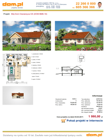 sprzedaż projektów: IMO Sp. z o.o., ul. Grupy AK Północ 4 lok. 9, 00-713 Warszawa pracujemy: pn-pt 8:00 - 20:00 sb-nd 9:00 - 15:00 22 266 0 800 tel. 605 366 366 Projekt Mój Dom Ciecierzyca CE (DOM BM6-16) 1. przedsionek: 3.35m2 2. hall: 5.15m2 3. pokój: 13.75m2 4. pokój: 13.80m2 5. łazienka: 4.55m2 6. kotłownia: 3.20m2 7. kuchnia: 7.45m2 8. pokój dzienny: 21.95m2 razem: 73.2m2 9. garaż: 19.20m2 Informacje Wysokość budynku: Liczba pokoi: 6,04 m Typ zabudowy: parterowy 3 Pow. całkowita: 127,40 m2 127,40 m2 Pow. mieszkalna: 73,20 m2 Pow. zabudowy: Pow. dachu: 183,80 m2 Pow. użytkowa: 73,20 m2 548,50 m3 Kubatura: Kąt nachylenia dachu: 35,00 0 Min. szerokość działki: 19,95 m Min. długość działki: Cena projektu na dzień 03.03.2017: 21,85 m 1 990,00 zł Pokaż projekt w internecie Działamy na rynku od 15 lat. Zaufało nam już kilkadziesiąt tysięcy osób.