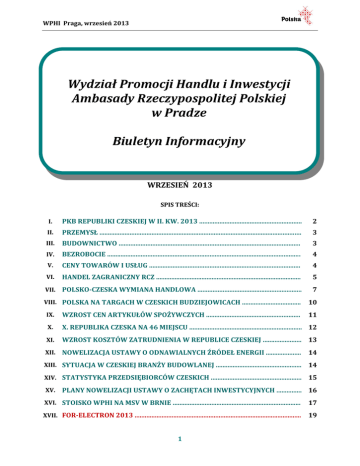 WPHI Praga, wrzesień 2013 Wydział Promocji Handlu i Inwestycji Ambasady Rzeczypospolitej Polskiej w Pradze Biuletyn Informacyjny WRZESIEŃ 2013 SPIS TREŚCI: I. PKB REPUBLIKI CZESKIEJ W II. KW. 2013 ............................................................. 2 II. PRZEMYSŁ ........................................................................................................................ 3 III. BUDOWNICTWO ............................................................................................................ 3 IV. BEZROBOCIE ................................................................................................................... 4 V. CENY TOWARÓW I USŁUG .......................................................................................... 4 VI. HANDEL ZAGRANICZNY RCZ ...................................................................................... 5 VII. POLSKO-CZESKA WYMIANA HANDLOWA .............................................................. 7 VIII. POLSKA NA TARGACH W CZESKICH BUDZIEJOWICACH ................................... 10 IX. WZROST CEN ARTYKUŁÓW SPOŻYWCZYCH ........................................................ 11 X. X. REPUBLIKA CZESKA NA 46 MIEJSCU ................................................................... 12 XI. WZROST KOSZTÓW ZATRUDNIENIA W REPUBLICE CZESKIEJ ....................... 13 XII. NOWELIZACJA USTAWY O ODNAWIALNYCH ŹRÓDEŁ ENERGII ..................... 14 XIII. SYTUACJA W CZESKIEJ BRANŻY BUDOWLANEJ ................................................... 14 XIV. STATYSTYKA PRZEDSIĘBIORCÓW CZESKICH ...................................................... 15 XV. PLANY NOWELIZACJI USTAWY O ZACHĘTACH INWESTYCYJNYCH ............... 16 XVI. STOISKO WPHI NA MSV W BRNIE ............................................................................ 17 XVII. FOR-ELECTRON 2013 ................................................................................................... 19 1 WPHI Praga, wrzesień 2013 I. Czeski PKB w drugim kwartale 2013 r. Według danych Czeskiego Urzędu Statystycznego, PKB Republiki Czeskiej w drugim kwartale 2013 roku, oczyszczony od wpływów sezonowych, w stosunku międzyrocznym był niższy o 1,3%. Ogółem w pierwszym półroczu br. wartość PKB była niższa o 1,9% w stosunku do takiego samego okresu roku ubiegłego. W stosunku do poprzedniego kwartału wartość PKB wzrosła o 0,6%. Wpływ na tempo wzrostu PKB Republiki Czeskiej w ostatnich kwartałach, miały różne krótkotrwałe i długotrwałe czynniki, do tych najważniejszych zalicza się: długookresowe obniżenie aktywności inwestycyjnej, powodujące spadek zamówień w przemyśle i budownictwie, spadek lub stagnacja gospodarcza na rynkach głównych partnerów handlowych Republiki Czeskiej, długa i chłodna zima, która wywarła negatywny wpływ na wytworzoną wartość dodaną brutto, w tym głównie w budownictwie, nierównomierne rozłożenie wpływów z akcyzy z wyrobów tytoniowych pomiędzy ostatnim kwartałem ubiegłego roku, a pierwszym kwartałem roku bieżącego. W drugim kwartale br., w porównaniu z analogicznym okresem roku poprzedniego, odnotowano zarówno wzrost konsumpcji indywidualnej (o 0,8%), jak też wzrost wydatków gospodarstw domowych (o 0,5%). Kupowano więcej artykułów konsumpcji długookresowej związanych z wyposażeniem mieszkań i transportem, a mniej artykułów konsumpcji krótkookresowej. W stosunku międzyrocznym wyraźnie spadły nakłady inwestycyjne (o 12,6%), w tym również na środki trwałe (o 6,2%). Negatywnie wpłynęło to na zapasy, których warność w okresie II kwartału obniżyła się o 6,4 mld CZK. Wyraźną zmianę odnotowano w zakresie wpływu eksportu na PKB. Po spadku wartości eksportu w I kwartale, w II kw. jego wyższa niż w imporcie dynamika, oddziaływała pozytywnie na warność PKB. Biorąc pod uwagę stronę podażową, dane statystyczne wskazują na międzyroczny spadek wartości dodanej brutto w gospodarce czeskiej ogółem o 1,2%; w tym w przemyśle przetwórczym o 1,3%, w budownictwie o 3,7%, w handlu o 1,4%, a w dziale wynajmu nieruchomości o 1,5%. Wyraźnie pozytywne wyniki uzyskał sektor finansów i ubezpieczeń, gdzie wzrost wartości dodanej brutto wyniósł ok. 20%. II. Przemysł Produkcja przemysłowa w Republice Czeskiej w lipcu 2013 r. w stosunku międzyrocznym wzrosła się o 2,1%, a w stosunku do miesiąca poprzedniego o 0,4%. Największy międzyroczny wzrost odnotowano w produkcji wyrobów i konstrukcji metalowych (o 11,2%), w produkcji maszyn i urządzeń (o 8,3%) oraz w produkcji wyrobów z gumy i tworzyw sztucznych (o 8,0%). Największy spadek odnotowano w produkcji i dystrybucji energii elektrycznej, gazu i ciepła (o 5,9%), w sektorze wydobywczym (o 11,2%) oraz w produkcji pojazdów motorowych (o 2,7%). 2 WPHI Praga, wrzesień 2013 Przychody z działalności przemysłowej w lipcu 2013 r. w cenach bieżących w stosunku międzyrocznym wzrosły o 3,7%, a przychody z eksportu bezpośredniego przedsiębiorstw przemysłowych o 6,6%. Wartość nowych zamówień w przemyśle międzyrocznie była wyższa o 9,0%; w tym wartość zamówień zagranicznych o 10,2%, a zamówień krajowych o 6,6%. Średnia liczba zatrudnionych w przemyśle czeskim w lipcu 2013 r. (bez pracowników agencyjnych), w przedsiębiorstwach zatrudniających co najmniej 50 pracowników, była międzyrocznie niższa o 1,3%. Średnie wynagrodzenie miesięczne w przedsiębiorstwach przemysłowych wzrosło nominalnie o 3,3% i wyniosło 27.303 CZK (ok. 1.060 EUR). Przemysł (wskaźniki międzyroczne – dane wstępne) Dynamika w cenach stałych (analogiczny okres roku poprzedniego = 100) Wyszczególnienie styczeńmaj 2013 czerwiec 2013 lipiec 2013 Przemysł Republiki Czeskiej (B+C+D) 97,8 95,1 102,1 96,8 B) Wydobycie 74,7 78,8 88,8 84,7 C) Przemysł przetwórczy 98,8 96,0 104,1 97,7 D) Produkcja i dystrybucja energii elektrycznej, gazu i ciepła 101,1 94,7 94,1 96,0 lipiec 2013 III. Budo