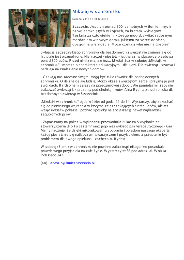 M ik oła j w s c hr onis k u Dodano: 2011-11-30 12:38:41 S z czecin. J es t ich ponad 300: s amotnych w tłumie innych ps ów, z amkniętych w kojcach, za kratami wybie gów. T ęs knią z a człowiekiem, którego mogłyby witać rados nym merdaniem w nowym domu, jakiemu za s erce odpłacą doz gonną wiernoś cią. Może cz ekają właś nie na C iebie? S ytuacja s zcz ecińs kiego s chronis ka dla bez domnych z wierz ąt nie zmienia s ię od lat: s tale jes t prz epełnione. Nie inaczej - nies tety - jes t teraz : w placówce prz ebywa ponad 300 ps ów. P rzed nimi zima, ale też... Mikołaj. Już w s obotę: „Mikołajki w s chronis ku". Impreza o charakterz e edukacyjnym - dla ludz i. Dla z wierz ąt - s zans a i nadz ieja na z nalez ienie nowych domów. - C zekają nas rados ne ś więta. Mogą być takie również dla podopiecz nych s chronis ka. O ile z najdą s ię ludz ie, którz y okaż ą z wierzętom s erce i przyjmą je pod s wój dach. B ardz o nam z ależ y na przedzimowej adopcji. Ale pamiętajmy, żeby nie traktować z wierz ąt jak prezenty pod choinkę - mówi Alina R ychta z e s chronis ka dla bez domnych z wierz ąt w S zcz ecinie. „Mikołajki w s chronis ku" będą krótkie: od godz. 11 do 14. W ys tarcz y, aby z akochać s ię od pierws z ego wejrz enia w którymś z e s zcz ekających s ierś ciuchów, ale też wziąć udz iał w pokazie i poz nać s pos oby na s ocjalizację nawet najbardziej z agubionych ps ów. - Zapras z amy na pokaz w wykonaniu prz ewodnika Łukas z a S kryplonka z e s towarzys z enia „P o T o Jes tem" oraz jego niez wykłego ps a terapeutycz nego - Gai. Mamy nadz ieję, ż e dzięki mikołajkowemu s potkaniu i poradom nas z ego eks perta każ dy pies s tanie s ię najleps z ym towarz ys z em i przyjacielem, a prz es tanie być problemem dla s wego opiekuna - zachęca A. R ychta. W s obotę (3 bm.) w s chronis ku nie powinno z abraknąć nikogo, kto pos z ukuje prawdz iwego przyjaciela na całe ż ycie. W ys tarczy trafić pod adres : al. W ojs ka P ols kiego 247. (an) arleta-n@ kurier.s zcz ecin.pl