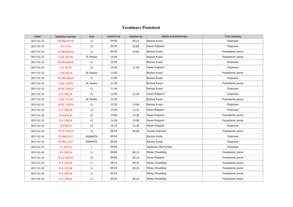 Terminarz Posiedzeń Dzień Sygnatura sprawy Sala Godzina od Godzina do Sędzia przewodniczący Tryb rozprawy 2017-01-23 III Nkd 67/16 12 09:00 09:15 Bartosz Kusyk Rozprawa 10:00 Paweł Pośpiech Rozprawa 10:00 Bartosz Kusyk Posiedzenie jawne 2017-01-23 II K 7/16 15 09:30 2017-01-23 III Nkd 64/16 12 09:40 2017-01-23 I Cps 101/16 ZK Wołów 10:00 Bartosz Kusyk Posiedzenie jawne 2017-01-23 III Nkd 66/16 12 10:20 Bartosz Kusyk Rozprawa 2017-01-23 II K 78/16 15 10:30 Bartosz Kusyk Posiedzenie jawne 11:00 Paweł Pośpiech Rozprawa 2017-01-23 I Cps 95/16 ZK Wołów 11:00 2017-01-23 III Nkd 68/16 12 11:00 Bartosz Kusyk Rozprawa 2017-01-23 I Cps 110/16 ZK Wołów 11:30 Bartosz Kusyk Posiedzenie jawne 2017-01-23 III RC 134/16 12 11:40 Bartosz Kusyk Rozprawa 2017-01-23 II K 202/16 15 12:00 Paweł Pośpiech Rozprawa 12:30 2017-01-23 I Cps 111/16 ZK Wołów 12:30 Bartosz Kusyk Posiedzenie jawne 2017-01-23 III RC 130/16 12 12:30 13:00 Bartosz Kusyk Rozprawa 2017-01-23 II K 226/16 15 13:00 13:45 Paweł Pośpiech Rozprawa 2017-01-23 II Kop 9/16 15 14:00 14:30 Paweł Pośpiech Posiedzenie jawne 2017-01-23 II K 238/16 15 14:30 15:00 Paweł Pośpiech Posiedzenie jawne 2017-01-23 II K 94/15 15 15:15 15:30 Paweł Pośpiech 2017-01-24 VII K 232/14 15 08:45 09:00 Tomasz Paprocki 2017-01-24 III RNs 9/17 WSdNiPCh 08:50 Bartosz Kusyk Rozprawa 2017-01-24 III RNs 11/17 WSdNiPCh 09:00 Bartosz Kusyk Rozprawa 2017-01-24 I C 622/15 1 09:00 Agnieszka Marczyńska Rozprawa 2017-01-24 II K 189/16 11 09:00 09:15 Miłosz Chwalibóg Posiedzenie jawne 09:15 Paweł Pośpiech Posiedzenie jawne Rozprawa Posiedzenie jawne 2017-01-24 II Ko 616/16 15 09:00 2017-01-24 II K 225/16 11 09:15 09:30 Miłosz Chwalibóg Posiedzenie jawne 2017-01-24 II K 312/16 11 09:20 09:25 Miłosz Chwalibóg Posiedzenie jawne 2017-01-24 II K 287/16 11 09:25 Miłosz Chwalibóg Posiedzenie jawne 2017-01-24 II K 148/16 11 09:30 Miłosz Chwalibóg Posiedzenie jawne 09:45 Terminarz Posiedzeń Dzień Sygnatura sprawy Sala Godzina od Godzina do Sędzia przewodniczący Tryb rozprawy 2017-01-24 II Ko 310/16 15 09:30 09:45 Paweł Pośpiech Posiedzenie jawne 10:00 Paweł Pośpiech Posiedzenie jawne 10:00 Miłosz Chwalibóg Rozprawa 2017-01-24 II Ko 312/16 15 09:45 2017-01-24 II K 149/16 11 09:45 2017-01-24 I C 276/16 14 10:00 Anna Garbera Rozprawa 2017-01-24 I C 692/15 1 10:00 Agnieszka Marczyńska Rozprawa 2017-01-24 II Ko 311/16 15 10:00 10:15 Paweł Pośpiech Posiedzenie jawne 10:30 Paweł Pośpiech Posiedzenie jawne 11:15 Paweł Pośpiech Posiedzenie jawne 2017-01-24 II Ko 313/16 15 10:15 2017-01-24 II Ko 673/16 15 10:30 2017-01-24 I C 646/15 1 11:00 2017-01-24 II Ko 753/16 15 11:00 11:15 Paweł Pośpiech Posiedzenie jawne 2017-01-24 II Ko 675/16 15 11:15 11:30 Paweł Pośpiech Posiedzenie jawne 2017-01-24 II Ko 674/16 15 11:30 11:45 Paweł Pośpiech Posiedzenie jawne 2017-01-24 II K 151/16 11 11:30 12:00 Miłosz Chwalibóg 2017-01-24 II Ko 696/16 15 12:00 12:20 Paweł Pośpiech 2017-01-24 II K 159/16 11 12:15 12:30 Miłosz Chwalibóg 2017-01-24 II Ko 700/16 15 12:20 12:40 Paweł Pośpiech 2017-01-24 I Ns 6/15 14 12:30 2017-01-24 II Ko 698/16 15 12:50 2017-01-24 III RC 132/16 12 13:20 2017-01-24 II Ko 676/16 15 13:30 13:45 Paweł Pośpiech Posiedzenie jawne 2017-01-24 II K 168/16 11 13:30 13:45 Miłosz Chwalibóg Posiedzenie jawne 2017-01-24 II Ko 663/16 15 13:45 14:00 Paweł Pośpiech Posiedzenie jawne 14:15 Paweł Pośpiech Posiedzenie jawne Agnieszka Marczyńska Anna Garbera 13:00 Paweł Pośpiech Bartosz Kusyk 2017-01-24 II Ko 643/16 15 14:00 2017-01-24 II K 172/16 11 14:00 14:25 Miłosz Chwalibóg 2017-01-24 II Ko 597/16 15 14:15 14:30 Paweł Pośpiech 2017-01-24 I Ns 4/15 14 14:30 2017-01-24 II K 306/16 11 14:30 Anna Garbera 14:45 Miłosz Chwalibóg Rozprawa Rozprawa Posiedzenie jawne Rozprawa Posiedzenie jawne Rozprawa Posiedzenie jawne Rozprawa Rozprawa Posiedzenie jawne Rozprawa Posiedzenie jawne Terminarz Posiedzeń Dzień Sygnatura sprawy Sala Godzina od Godzina do Sędzia przewodniczący Tryb rozprawy 2017-01-24 II Ko 598/16 15 14:30 14:45 Paweł Pośpiech Posiedzenie jawne 15:00 Paweł Pośpiech Posiedzenie jawne 2017-01-24 II Ko 664/16 15 14:45 2017-01-24 II Ko 656/16 15 15:00 15:10 Paweł Pośpiech Posiedzenie jawne 2017-01-24 II Ko 655/16 15 15:10 15:20 Paweł Pośpiech Posiedzenie jawne 2017-01-24 II Ko 644/16 15 15:20 15:40 Paweł Pośpiech Posiedzenie jawne 2017-01-25 III RC 121/16 12 09:00 09:20 Bartosz Kusyk Rozprawa 10:10 Bartosz Kusyk Rozprawa 2017-01-25 III RNs 186/16 12 10:00 2017-01-25 III RNs 140/16 12 10:40 10:50 Bartosz Kusyk Posiedzenie jawne 2017-01-25 III RNs 111/16 12 11:20 11:30 Bartosz Kusyk Posiedzenie jawne 2017-01-25 III Nsm 235/16 12 12:00 12:10 Bartosz Kusyk Rozprawa 2017-01-25 III Nkd 58/16 12 12:40 12:55 Bartosz Kusyk Rozprawa 2017-01-25 III RNs 298/16 12 13:20 13:30 Bartosz Kusyk Rozprawa 2017-01-25 III RNs 314/16 12 14:00 Bartosz Kusyk Rozprawa 2017-01-26 I Ns 443/15 1 09:00 Agnieszka Marczyńska Rozprawa 2017-01-26 III Nsm 253/16 12 09:00 09:20 Bartosz Kusyk Rozprawa 2017-01-26 II W 337/16 15 09:00 10:00 Paweł Pośpiech Rozprawa 2017-01-26 II K 61/16 15 09:30 10:00 Paweł Pośpiech Rozprawa 2017-01-26 I C 29/16 1 10:30 Agnieszka Marczyńska Rozprawa 2017-01-26 II K 178/16 15 10:30 10:55 Paweł Pośpiech Posiedzenie jawne 2017-01-26 II K 178/16 15 11:00 11:55 Paweł Pośpiech Rozprawa 2017-01-26 I C 159/16 1 12:00 Agnieszka Marczyńska Rozprawa 2017-01-26 II W 101/15 15 12:00 13:00 Paweł Pośpiech Rozprawa 13:00 Paweł Pośpiech Rozprawa Agnieszka Marczyńska Rozprawa Paweł Pośpiech Rozprawa 2017-01-26 II K 173/16 15 12:30 2017-01-26 I C 554/15 1 13:00 2017-01-26 II K 155/16 15 13:30 2017-01-26 I Ns 29/15 14 14:00 Anna Garbera Posiedzenie jawne 2017-01-26 I C 26/16 14 14:30 Anna Garbera Posiedzenie jawne 14:00 Terminarz Posiedzeń Dzień Sygnatura sprawy Sala Godzina od Godzina do Sędzia przewodniczący Tryb rozprawy 2017-01-27 III Nkd 57/16 12 09:00 09:15 Bartosz Kusyk Rozprawa Bartosz Kusyk Rozprawa 2017-01-27 