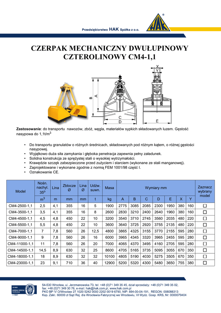 CZERPAK MECHANICZNY DWUŁUPINOWY CZTEROLINOWY CM4-1,1 Zastosowanie: do transportu nawozów, zbóż, węgla, materiałów sypkich składowanych luzem. Gęstość nasypowa do 1,1t/m3 • • • • • • Do transportu granulatów o różnych średnicach, składowanych pod różnym kątem, o różnej gęstości nasypowej. Wyjątkowo duża siła zamykania i głęboka penetracja zapewnia pełny załadunek. Solidna konstrukcja ze sprężystej stali o wysokiej wytrzymałości. Krawędzie szczęk zabezpieczone przed zużyciem i starciem (wykonane ze stali manganowej). Zaprojektowane i wykonane zgodnie z normą FEM 1001/98 część I. Oznakowanie CE. Model Nośn. nachyl. Lina 35o Zblocze Ø Lina Udźw. Ø suwn. Masa Wymiary mm m3 m mm mm t kg CM4-2500-1,1 2,5 4,1 355 16 5 1900 2775 3085 2085 2300 1950 380 160 CM4-3500-1,1 3,5 4,1 355 16 8 2600 2830 3210 2400 2640 1960 380 160 CM4-4500-1,1 4,5 4,8 450 22 10 3200 3540 3710 2745 3560 2035 480 220 CM4-5500-1,1 5,5 4,8 450 22 10 3600 3640 3725 2920 3755 2135 480 220 CM4-7000-1,1 7 7,8 560 26 12,5 4800 3865 4325 3155 3770 2155 595 280 CM4-9000-1,1 9 7,8 560 26 16 6000 3965 4345 3320 3965 2455 595 280 CM4-11000-1,1 11 7,8 560 26 20 7000 4065 4370 3495 4160 2705 595 280 CM4-14500-1,1 14,5 8,9 630 32 25 8600 4705 5165 3735 5095 3055 670 350 CM4-18000-1,1 18 8,9 630 32 32 10100 4805 5190 4030 5275 3505 670 350 CM4-23000-1,1 23 9,1 710 36 40 12900 5200 5320 4300 5480 3650 755 380 A B C D E X Y Zaznacz wybrany model