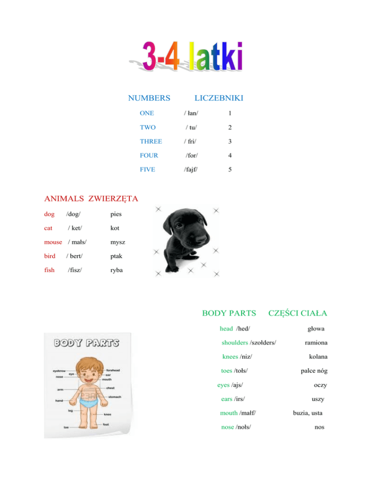 NUMBERS LICZEBNIKI ANIMALS ZWIERZĘTA BODY PARTS
