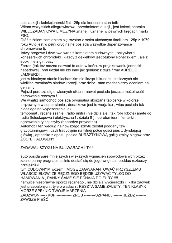 opis aukcji : kolekcjonerski fiat 125p dla konesera stan bdb Witam wszystkich allegrowiczów , przedmiotem aukcji , jest koleckjonarska WIELOZADANIOWA LIMUZYNA znanej i uznanej w pewnych kręgach marki FSO. Otóż z żalem zamierzam się rozstać z moim ukchanym fiacikiem 125p z 1979 roku Auto jest w pełni oryginalne posiada wszystkie dupenszwance chromowane tj. listwy progowe i dżwiowe wraz z kompletem cudownych , oczywiście koneserskich chromdekli. klażdy z dekielków jest otulony słoneczkiem , ale z epoki nie z gimbazy. Ferrari (tak też można nazwać to auto w końcu w projaktowaniu jednoski napędowej , brał udział nie kto inny jak geniusz z tejże firmy AURELIO LAMPERDI , jest w idealnym stanie blacharskim nie licząc kilkunastu nielicznych nie wielkich rozmiarów śladów korozjii oraz dziór . stan mechaniczny oceniam na genialny. Pojazd porusza sIę o własnych siłach , nawet posiada jeszcze możoliwość hamowania ręcznym !. We wnątrz samochód posiada oryginalną skórzaną tapicerkę w kolorze brązownym w super stanie , dodatkowo jest to werja lux , więc posiada tak nieosiągalne wyposarzenia jak : tempomat , ręczne ssanie , radio unitra (nie dziła ale i tak robi robote) anete do radia (teleskopowa i elektryczna ! , działa !! ) , obrotomierz , flenterki , ogrzewanie tylnej szyby (baaardzo przydatne) Automobil ten według najnowszego sznytu ziostał poddany tzw grzybtunningowi , czyli tradycyjnie na tylnej półce gości pies z dyndającą główką , apteczka z epoki , posida BURSZTYNOWĄ gałkę zminy biegów oraz ŻÓŁTE HALOGENY . ZADAWAJ SZYKU NA BULWARACH I TY ! auto posida pare mniejszych i większych wgniecień spowodowanych przez zacne panny pragnące usilnie dostać się do jego wnętrza i poddać rozkoszy przejażdżki tym CUDOWNYM wozem . MOGĘ ZAGWARANTOWAĆ PRZYSZŁEMU WŁAŚCICIELOWI ŻE RĘCZNEGO BĘDZIE UŻYWĄĆ TYLKO DO HAMOWANIA , PANNY SAME SIE PCHAJA DO FURY !!!!. hamulce niesprawne opórcz ręcznego , nie dziłają wycieraczki i i kilka żaówek jest przepalonych , tyle o wadach , RESZTA SAME ZALETY, TEN KLASYK MORZE SPEŁNIĆ TWOJE MARZENIA ZADZWOŃ ----- KUP ------------ ZROB ---------SZPANUJ ------- JEŹDZ -------ZAWSZE PIEŚĆ
