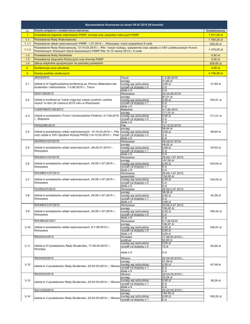 Sprawozdanie finansowe za okres VII-IX 2015 (III kwartał) l.p. 1 1.1 Koszty związane z działalnością statutową Wydatkowanie Posiedzenia organów statutowych PSRP, komisji oraz zespołów roboczych PSRP 1 911,05 zł Posiedzenia Rady Wykonawczej 1 704,20 zł 1.1.1 Posiedzenie władz wykonawczych PSRP, 1.07.2015 r., Warszawa, koszt wyżywienia 8 osób 1.1.2 Posiedzenie Rady Wykonawczej, 12-15.03.2015 r., Piła - koszt noclegu, wyżywienia oraz udziału w XXV Jubileuszowym Forum Państwowych Wyższych Szkół Zawodowych PSRP Piła 12-15 marca 2015 r, 5 osób 229,20 zł 1 475,00 zł 1.2 Posiedzenia Rady Studentów 1.3 Posiedzenia Zespołów Roboczych oraz Komisji PSRP 0,00 zł 1.4 Zakup artykułów spożywczych na potrzeby posiedzeń 206,85 zł 2. Konferencje oraz szkolenia 3. Koszty podróży służbowych JR/03/2015 3.1 3.2 3.3 3.4 3.5 3.6 3.7 3.8 3.9 3.10 3.11 Toruń pociąg Udział w IV Ogólnopolskiej konferencji pt. Pomoc Materialna dla nocleg wg rachunków studentów i doktorantów, 1-3.06.2015 r., Toruń ryczałt na dojazdy x 0 dieta x 0 DK/01/06/2015 Warszawa pociąg Udział w konferencji "Jakie mają być nasze uczelnie i polska nocleg wg rachunków nauka" w dniu 24 czerwca 2015 roku w Warszawie ryczałt na dojazdy x 1 dieta x 0 FUNIP/MK/01/06/2015 Białystok pociąg Udział w posiedzeniu Forum Uniwersytetów Polskich, 5-7.06.2015 nocleg wg rachunków r., Białystok ryczałt na dojazdy x 0 dieta x 0 PWSZ/MK/2015 Piła pociąg Udział w posiedzeniu władz wykonawczych, 12-15.03.2015 r., Piła nocleg wg rachunków oraz udział w XXV Zjeździe Komisji PWSZ (14-15.03.2015 r., Piła) ryczałt na dojazdy x 0 dieta x 0 DK/RW/01/07/2015 Warszawa pociąg Udział w posiedzeniu władz wykonawczych, 28-29.07.2015 r., nocleg wg rachunków Warszawa ryczałt na dojazdy x 1 dieta x 0 RW/DK/01/07/2015 Warszawa pociąg Udział w posiedzeniu władz wykonawczych, 29.06-1.07.2015 r., nocleg wg rachunków Warszawa ryczałt na dojazdy x 1 dieta x 0 RW/MB/01/07/2015 Warszawa samochód Udział w posiedzeniu władz wykonawczych, 29.06-1.07.2015 r., nocleg wg rachunków Warszawa ryczałt na dojazdy x 0 dieta x 0 PG/RW/07/2015 Warszawa pociąg Udział w posiedzeniu władz wykonawczych, 29.06-1.07.2015 r., nocleg wg rachunków Warszawa ryczałt na dojazdy x 1 dieta x 0 RW/MK/01/07/2015 Warszawa pociąg Udział w posiedzeniu władz wykonawczych, 29.06-1.07.2015 r., nocleg wg rachunków Warszawa ryczałt na dojazdy x 0 dieta x 0 RW/MK/2015/01 Warszawa pociąg Udział w posiedzeniu władz wykonawczych, 6-7.08.2015 r., nocleg wg rachunków Warszawa ryczałt na dojazdy x 0 dieta x 0 RS/20/04/2015 Wrocław autobus nocleg wg rachunków Udział w IV posiedzeniu Rady Studentów, 17-20.04.2015 r., ryczałt na dojazdy x 2 Wrocław dieta x 0 RS/04/05/2015 3.12 3.13 3.14 Gliwice pociąg nocleg wg rachunków Udział w V posiedzeniu Rady Studentów, 22-24.05.2015 r., Gliwice ryczałt na dojazdy x 1 dieta x 0 RS/05/05/2015 Gliwice pociąg nocleg wg rachunków Udział w V posiedzeniu Rady Studentów, 22-24.05.2015 r., Gliwice ryczałt na dojazdy x 1 dieta x 0 RS/13/05/2015 Gliwice pociąg nocleg wg rachunków Udział w V posiedzeniu Rady Studentów, 22-24.05.2015 r., Gliwice ryczałt na dojazdy x 1 0,00 zł 0,00 zł 4 746,90 zł 1-3.06.2015 31,85 zł 0,00 zł 0 zł 0 zł 23-24.06.2015 97,51 zł 0,00 zł 6 zł 0 zł 5-7.06.2015 171,01 zł 0,00 zł 0 zł 0 zł 12-15.03.2015 56,84 zł 0,00 zł 0 zł 0 zł 28-29.07.2015 48,02 zł 0,00 zł 6 zł 0 zł 29.06-1.07.2015 147,00 zł 0,00 zł 6 zł 0 zł 29.06-1.07.2015 134,00 zł 0,00 zł 0 zł 0 zł 29.06-2.07.2015 36,26 zł 0,00 zł 6 zł 0,00 zł 29.06-2.07.2015 126,42 zł 0,00 zł 0 zł 0 zł 6-7.08.2015 126,91 zł 0,00 zł 0,00 zł 0,00 zł 17-20.04.2015 r. 52,00 zł 0,00 zł 12 zł 31,85 zł 103,51 zł 171,01 zł 56,84 zł 54,02 zł 153,00 zł 134,00 zł 42,26 zł 126,42 zł 126,91 zł 64,00 zł 0 zł 22-24.05.2015 r. 61,59 zł 0,00 zł 6 zł 0 zł 22-24.05.2015 r. 32,28 zł 0,00 zł 6 zł 0 zł 22-24.05.2015 r. 144,55 zł 0,00 zł 6 zł 67,59 zł 38,28 zł 150,55 zł dieta x 0 Gliwice pociąg nocleg wg rachunków Udział w V posiedzeniu Rady Studentów, 22-24.05.2015 r., Gliwice ryczałt na dojazdy x 1 dieta x 0 JR/02/2015 Poznań pociąg Udział w VI posiedzeniu Rady Studentów, 19-21.06.2015 r., nocleg wg rachunków Poznań ryczałt na dojazdy x 0 dieta x 0 RS10/06/2015 Poznań pociąg Udział w VI posiedzeniu Rady Studentów, 19-21.06.2015 r., nocleg wg rachunków Poznań ryczałt na dojazdy x 1 dieta x 0 RS/01/06/2015 Poznań pociąg Udział w VI posiedzeniu Rady Studentów, 19-21.06.2015 r., nocleg wg rachunków Poznań ryczałt na dojazdy x 1 dieta x 0 RS/14/06/2015 Poznań pociąg Udział w VI posiedzeniu Rady Studentów, 19-21.06.2015 r., nocleg wg rachunków Poznań ryczałt na dojazdy x 1 dieta x 0 RS/02/06/2015 Poznań pociąg Udział w VI posiedzeniu Rady Studentów, 19-21.06.2015 r., nocleg wg rachunków Poznań ryczałt na dojazdy x 0 dieta x 0 RS/09/06/2015 Poznań pociąg nocleg wg rachunków Udział w VI posiedzeniu Rady Studentów, 19-21.06.2015 r., ryczałt na dojazdy x 1 Poznań dieta x 0 RS/10/05/2015 3.15 3.16 3.17 3.18 3.19 3.20 3.21 RS/15/06/2015 3.22 Udział w VI posiedzeniu Rady Studentów, 19-21.06.2015 r., Poznań RS/12/06/2015 3.23 Udział w VI posiedzeniu Rady Studentów, 19-21.06.2015 r., Poznań RS/08/06/2015 3.24 Udział w VI posiedzeniu Rady Studentów, 19-21.06.2015 r., Poznań RS/11/06/2015 3.25 Udział w VI posiedzeniu Rady Studentów, 19-21.06.2015 r., Poznań RS/21/06/2015 3.26 Udział w VI posiedzeniu Rady Studentów, 19-21.06.2015 r., Poznań RS/05/06/2015 3.27 Udział w VI posiedzeniu Rady Studentów, 19-21.06.2015 r., Poznań RS/LF/06/2015 3.28 Udział w VI posiedzeniu Rady Studentów, 19-21.06.2015 r., Poznań RS/07/06/2015 3.29 Udział w VI posiedzeniu Rady Studentów, 19-21.06.2015 r., Poznań RS/03/06/2015 3.30 Udział w VI posiedzeniu Rady Studentów, 19-21.06.2015 r., Poznań JW./01/07/2015 3.31 Udział w XII Ogólnopolskim Spo