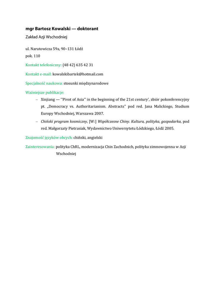 mgr Bartosz Kowalski — doktorant Zakład Azji Wschodniej ul. Narutowicza 59a, 90–131 Łódź pok. 110 Kontakt telefoniczny: (48 42) 635 42 31 Kontakt e-mail: [email protected] Specjalność naukowa: stosunki międzynarodowe Ważniejsze publikacje: – Xinjiang — ''Pivot of Asia'' in the beginning of the 21st century', zbiór pokonferencyjny pt. ,,Democracy vs. Authoritarianism. Abstracts'' pod red. Jana Malickiego, Studium Europy Wschodniej, Warszawa 2007. – Chiński program kosmiczny, [W:] Współczesne Chiny. Kultura, polityka, gospodarka, pod red. Małgorzaty Pietrasiak, Wydawnictwo Uniwersytetu Łódzkiego, Łódź 2005. Znajomość języków obcych: chiński, angielski Zainteresowania: polityka ChRL, modernizacja Chin Zachodnich, polityka zimnowojenna w Azji Wschodniej