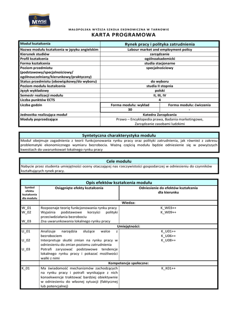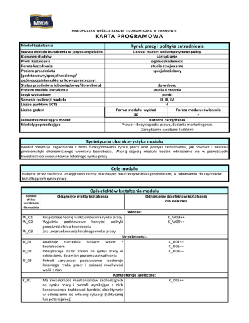 MAŁOP OLSKA WYŻSZ A SZ KOŁA E KONOMICZNA W TARN OW IE KARTA PROGRAMOWA Moduł kształcenia Rynek pracy i polityka zatrudnienia Nazwa modułu kształcenia w języku angielskim Kierunek studiów Profil kształcenia Forma kształcenia Poziom przedmiotu (podstawowy/specjalnościowy/ ogólnouczelniany/kierunkowy/praktyczny) Status przedmiotu (obowiązkowy/do wyboru) Poziom modułu kształcenia Język wykładowy Semestr realizacji modułu Liczba punktów ECTS Liczba godzin Jednostka realizująca moduł Moduły poprzedzające Labour market and employment policy zarządzanie ogólnoakademicki studia stacjonarne specjalnościowy do wyboru studia II stopnia polski II, III, IV 4 Forma modułu: wykład Forma modułu: ćwiczenia 30 Katedra Zarządzania Prawo – Encyklopedia prawa, Badania marketingowe, Zarządzanie zasobami ludzkimi Syntetyczna charakterystyka modułu Moduł obejmuje zagadnienia z teorii funkcjonowania rynku pracy oraz polityki zatrudnienia, jak również z zakresu problematyki ekonomicznego wymiaru bezrobocia. Ważną częścią modułu będzie odniesienie się w powyższych kwestiach do uwarunkowań lokalnego rynku pracy Cele modułu Nabycie przez studenta umiejętności oceny otaczającej nas rzeczywistości gospodarczej w odniesieniu do czynników kształtujących rynek pracy. Opis efektów kształcenia modułu Symbol efektu kształcenia dla modułu W_01 W_02 W_03 U_01 U_02 U_03 K_01 Osiągnięte efekty kształcenia Odniesienie do efektów kształcenia dla kierunku Wiedza: Rozpoznaje teorię funkcjonowania rynku pracy Wyjaśnia podstawowe korzyści polityki przeciwdziałania bezrobociu Zna uwarunkowania lokalnego rynku pracy Umiejętności: Analizuje narzędzia służące walce z bezrobociem Interpretuje skutki zmian na rynku pracy w odniesieniu do zmian poziomu zatrudnienia Potrafi zarysować podstawowe tendencje lokalnego rynku pracy i pokazać możliwości walki z nimi Kompetencje społeczne: Ma świadomość mechanizmów zachodzących na rynku pracy i potrafi wynikające z nich konsekwencje traktować bardziej obiektywnie w odniesieniu do własnej sytuacji (faktycznej lub potencjalnej) K_W03++ K_W09++ K_U01++ K_U06++ K_U08++ K_K01++ Treści kształcenia modułu 1. 2. 3. 4. 5. 6. 7. 8. 9. 10. 11. 12. 13. 14. Forma modułu: wykład Rynek pracy, zatrudnienie, bezrobocie. Podstawy teoretyczne. Źródła informacji statystycznych o zatrudnieniu i bezrobociu – dane gromadzone przez GUS, urzędy pracy, Eurostat, ILO. Podstawowe mierniki. Stan, struktura, dynamika zmian na rynku pracy w Polsce. Teorie bezrobocia. Znaczenie i skutki bezrobocia. Polityka państwa wobec bezrobocia. Polityka makroekonomiczna. Elastyczność i deregulacja rynku pracy. Aktywna i pasywna polityka państwa na rynku pracy. Problemy pracy w perspektywie XXI wieku. Strategie zatrudnienia w organizacjach międzynarodowych: UE, MOP, OECD. Programy przeciwdziałania bezrobociu. Regulacje prawne dotyczące bezrobocia w Polsce. Organizacja służb zatrudnienia i działanie funduszy celowych w polityce społecznej: Funduszu Pracy, Funduszu Gwarantowanych Świadczeń Pracowniczych. Programy rządowe mające na celu przeciwdziałanie bezrobociu i łagodzenie jego skutków (w Polsce). Popyt na pracę w Polsce – tendencje i perspektywy. Prognozy popytu na pracę. Procesy dostosowania polskiego rynku pracy do Unii Europejskiej Specyfika bezrobocia młodzieży. Programy przeciwdziałania bezrobociu młodzieży w Polsce i w wybranych krajach. Strategie i programy przeciwdziałania bezrobociu w wybranych krajach Literatura podstawowa Literatura uzupełniająca Forma modułu: ćwiczenia 1. Noga M., Stawicka K., 2009, Rynek pracy w Polsce, Wyd. CeDeWu, Warszawa 2. Kryńska E., 2001, Dylematy polskiego rynku pracy, Wyd. IPiSS, Warszawa 1. Jarmołowicz W., 2003, Rynek pracy w warunkach zmian ustrojowych, Wyd. Uniwersytetu Ekonomicznego w Poznaniu, Poznań 2. Woźniak B., 2008, Bezrobocie równowagi i nierównowagi a polityka państwa wobec rynku pracy, Wyd IPiSS, Poznań Metody dydaktyczne Teoretyczna prezentacja zagadnień. Interaktywne prowadzenie zajęć. Rozwiązywanie zadań i analiza przypadków – prasa ekonomiczna.