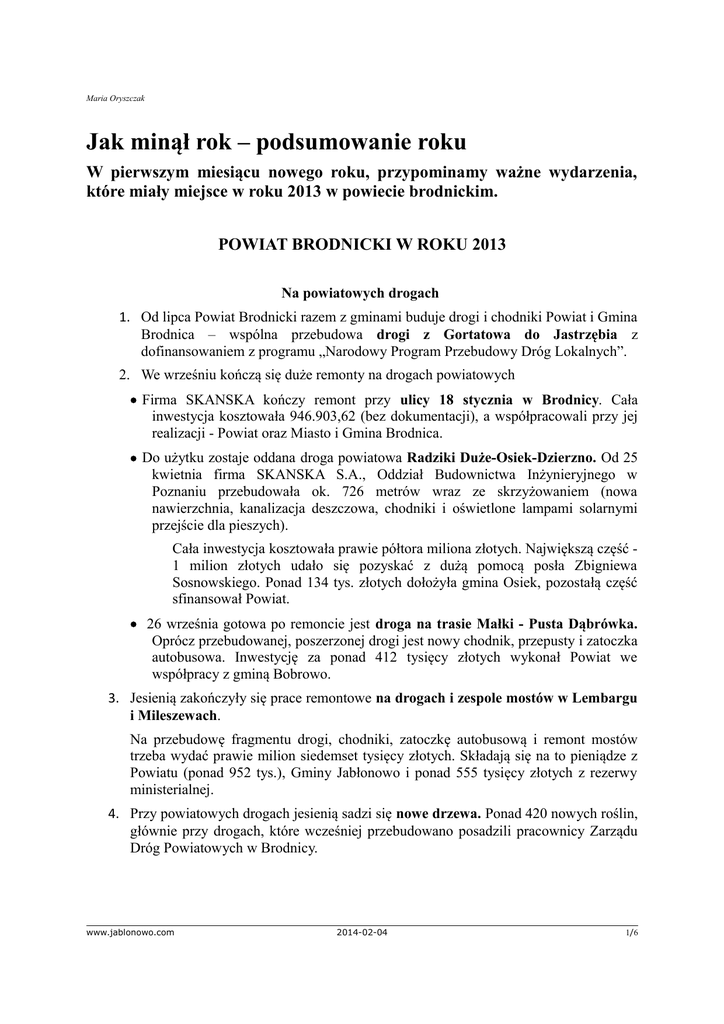 Maria Oryszczak Jak minął rok – podsumowanie roku W pierwszym miesiącu nowego roku, przypominamy ważne wydarzenia, które miały miejsce w roku 2013 w powiecie brodnickim. POWIAT BRODNICKI W ROKU 2013 Na powiatowych drogach 1. Od lipca Powiat Brodnicki razem z gminami buduje drogi i chodniki Powiat i Gmina Brodnica – wspólna przebudowa drogi z Gortatowa do Jastrzębia z dofinansowaniem z programu „Narodowy Program Przebudowy Dróg Lokalnych”. 2. We wrześniu kończą się duże remonty na drogach powiatowych Firma SKANSKA kończy remont przy ulicy 18 stycznia w Brodnicy. Cała inwestycja kosztowała 946.903,62 (bez dokumentacji), a współpracowali przy jej realizacji - Powiat oraz Miasto i Gmina Brodnica. Do użytku zostaje oddana droga powiatowa Radziki Duże-Osiek-Dzierzno. Od 25 kwietnia firma SKANSKA S.A., Oddział Budownictwa Inżynieryjnego w Poznaniu przebudowała ok. 726 metrów wraz ze skrzyżowaniem (nowa nawierzchnia, kanalizacja deszczowa, chodniki i oświetlone lampami solarnymi przejście dla pieszych). Cała inwestycja kosztowała prawie półtora miliona złotych. Największą część 1 milion złotych udało się pozyskać z dużą pomocą posła Zbigniewa Sosnowskiego. Ponad 134 tys. złotych dołożyła gmina Osiek, pozostałą część sfinansował Powiat. 26 września gotowa po remoncie jest droga na trasie Małki - Pusta Dąbrówka. Oprócz przebudowanej, poszerzonej drogi jest nowy chodnik, przepusty i zatoczka autobusowa. Inwestycję za ponad 412 tysięcy złotych wykonał Powiat we współpracy z gminą Bobrowo. 3. Jesienią zakończyły się prace remontowe na drogach i zespole mostów w Lembargu i Mileszewach. Na przebudowę fragmentu drogi, chodniki, zatoczkę autobusową i remont mostów trzeba wydać prawie milion siedemset tysięcy złotych. Składają się na to pieniądze z Powiatu (ponad 952 tys.), Gminy Jabłonowo i ponad 555 tysięcy złotych z rezerwy ministerialnej. 4. Przy powiatowych drogach jesienią sadzi się nowe drzewa. Ponad 420 nowych roślin, głównie przy drogach, które wcześniej przebudowano posadzili pracownicy Zarządu Dróg Powiatowych w Brodnicy. www.jablonowo.com 2014-02-04 1/6 Maria Oryszczak 5. Powiat razem z Miastem Brodnica wspólnie budują chodnik (fragment ścieżki rowerowej) przy ulicy Wczasowej w Brodnicy. Wykonawcą robót było Przedsiębiorstwo Gospodarki Komunalnej Sp. z o.o. w Brodnicy. 6. Zarząd Dróg Powiatowych w Brodnicy po raz kolejny już otrzymał wyróżnienie w konkursie „Modernizacja roku 2012”. Nagrodzone inwestycje wykonane w 2012 to: modernizacja drogi powiatowej Grzęby - Michałki oraz modernizacja mostu w Pólku. W powiatowym szpitalu 1. 22 marca 2013 - w Grudziądzu gospodarze Powiatu oraz Prezydent Grudziądza podpisują umowę o rozwiązaniu porozumienie w sprawie szpitala z 2006. Od 1 kwietnia 2013 szpital będzie jednostką samodzielną, a organem tworzącym będzie Powiat Brodnicki. 26 marca 2013r. - Komisja konkursowa wybiera Dariusza Szczepańskiego na dyrektora szpitala. 2. Radni Powiatu przeznaczają pieniądze na dofinansowanie szpitala, co pozwala wdrożyć tu zintegrowany, nowoczesny system informatyczny, który warunkuje m.in. samodzielne rozliczanie się z NFZ 3. Powstaje koncepcja rozbudowy szpitala w Brodnicy. Program dostosowania szpitala do wymagań sanitarnych wyznacza rozwój lecznicy do 2016 roku. Zakłada się że po zakończeniu rozbudowy w budynkach szpitala (razem z nowo wybudowanymi) będzie 10 tys. metrów kwadratowych powierzchni. 4. Szpital brodnicki zmaga się z trudnościami okresu przejściowego, ale już w kwietniu pokonuje pierwsze trudności: zdobywa kontrakt na Izbę Przyjęć. 5. W kwietniu rozpoczyna się przygotowywanie dokumentacji projektowej na rozbudowę i modernizację szpitala. Wykonawcą projektu jest firma „Archibis”. 6. 1 maja 2013 roku - w szpitalu uruchomiona zostaje nocna i świąteczna opieka medyczna dla zgłaszających się pacjentów finansowana z NFZ. W święta oraz dni wolne od pracy przez całą dobę oraz w porze nocnej (w godzinach od 18.00-8.00 dnia następnego) – pacjenci z powiatu brodnickiego mogą zgłaszać się do lekarza pierwszego kontaktu do brodnickiego szpitala. Lekarze przyjmują w budynku Poradni Profilaktyki Onkologicznej - wjazd i wejście od strony, gdzie dawniej była kolejka wąskotorowa. 7. 23 maja br. - szpital brodnicki zgłasza K-PO NFZ w Bydgoszczy gotowość działania SOR-u przy brodnickim szpitalu. Spełnione są wszystkie wymagania dla tego oddziału, by zdobyć kontrakt z NFZ. 8. Radni Rady Miasta, Rady Gminy Brodnica i Rady Gminy Bobrowo zdecydowali, że pomagać będą szpitalowi. Pomoc finansowa na zakup sprzętu dla szpitala będzie udzielana z budżetu miejskiego w formie dotacji celowej w latach 2014-2016. Określono, że maksymalna www.jablonowo.com 2014-02-04 2/6 Maria Oryszczak wysokość środków będzie corocznie ustalana w ten sposób, że od każdego mieszkańca miasta przeznaczy się 10 złotych na rok. 9. 30 lipca - szpital w Brodnicy staje się w pełni samodzielny, niezależny od Grudziądza. Szpital w Brodnicy organizacyjnie nie korzysta już żadnych usług Szpitala Specjalistycznego w Grudziądzu.Współpraca z dużymi szpitalami dotyczy tylko spraw leczenia pacjentów. 10. Do szpitala trafiają kolejne partie nowego sprzętu medycznego. Kupuje się go nie tylko ze szpitalnego budżetu, ale także z finansów Powiatu i Stowarzyszenia „Nasz szpital”. Stowarzyszenie przekazało na SOR nowoczesny kardiomonitor. Za ponad 200 tysięcy złotych z Powiatu kupuje się dla szpitala m.in.: respirator ratowniczy, pompę infuzyjną i nowoczesny endoskop do wykonywania m.in. gastroskopii i kolonoskopii. 11. 30 września - dyrektor szpitala Dariusz Szczepański informuje, że po 5 miesiącach od usamodzielnienia szpital ma po raz pierwszy dodatki wynik finansowy. 12. W końcu roku 2013 kończy się etap prac projektowych na rozbudowę i modernizację brodnickiego szpitala. G