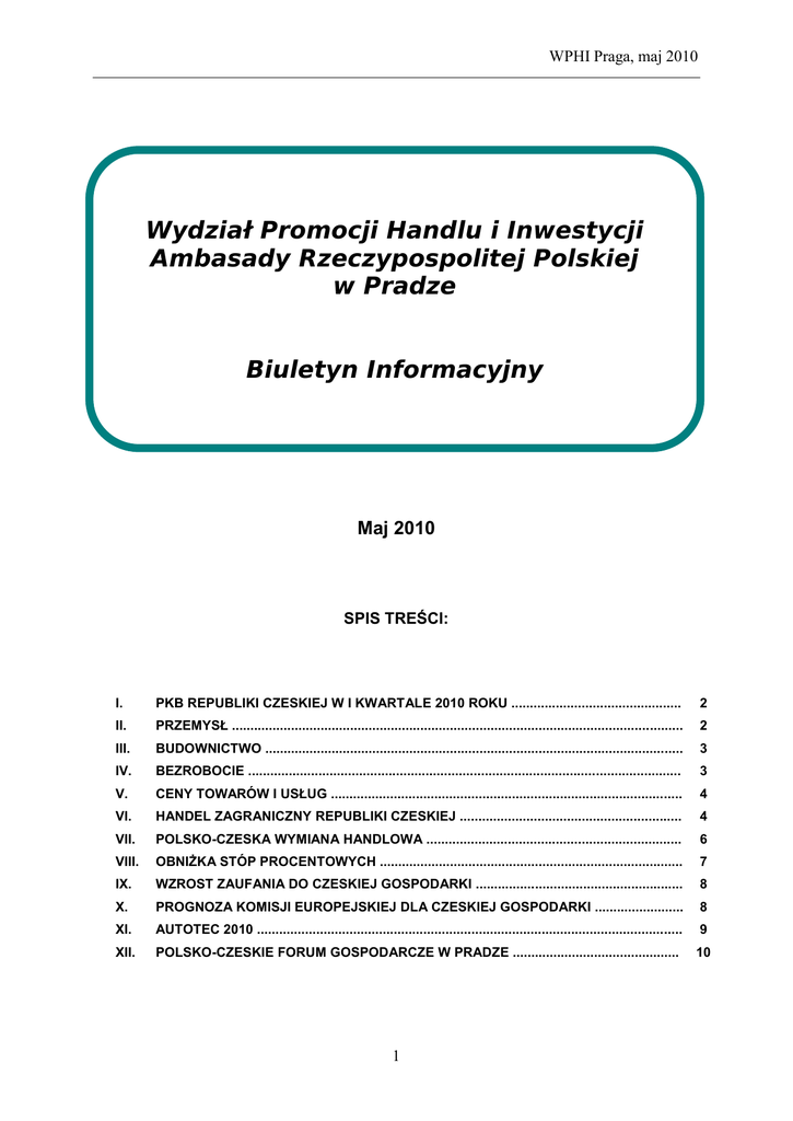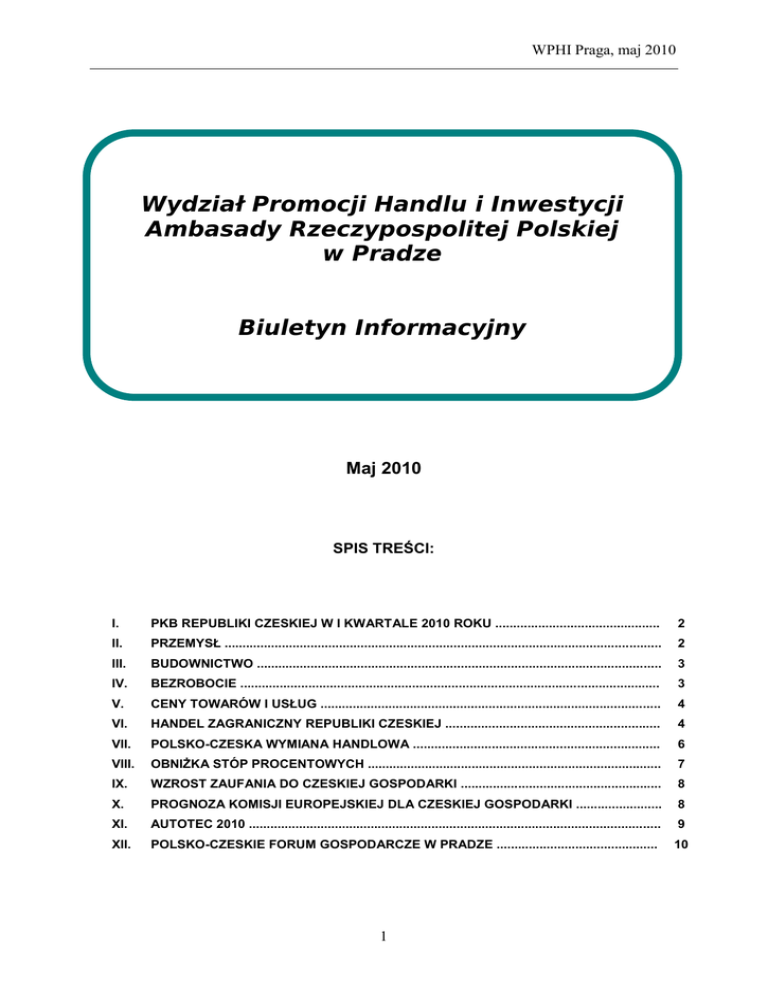 WPHI Praga, maj 2010 Wydział Promocji Handlu i Inwestycji Ambasady Rzeczypospolitej Polskiej w Pradze Biuletyn Informacyjny Maj 2010 SPIS TREŚCI: I. PKB REPUBLIKI CZESKIEJ W I KWARTALE 2010 ROKU .............................................. 2 II. PRZEMYSŁ .......................................................................................................................... 2 III. BUDOWNICTWO ................................................................................................................. 3 IV. BEZROBOCIE ..................................................................................................................... 3 V. CENY TOWARÓW I USŁUG ............................................................................................... 4 VI. HANDEL ZAGRANICZNY REPUBLIKI CZESKIEJ ............................................................ 4 VII. POLSKO-CZESKA WYMIANA HANDLOWA ..................................................................... 6 VIII. OBNIŻKA STÓP PROCENTOWYCH .................................................................................. 7 IX. WZROST ZAUFANIA DO CZESKIEJ GOSPODARKI ........................................................ 8 X. PROGNOZA KOMISJI EUROPEJSKIEJ DLA CZESKIEJ GOSPODARKI ........................ 8 XI. AUTOTEC 2010 ................................................................................................................... 9 XII. POLSKO-CZESKIE FORUM GOSPODARCZE W PRADZE ............................................. 10 1 WPHI Praga, maj 2010 I. PKB Republiki Czeskiej w I kwartale 2010 roku Według wstępnych danych Czeskiego Urzędu Statystycznego, w pierwszym kwartale 2010 roku w stosunku międzyrocznym, PKB Republiki Czeskiej był wyższy o 1,2%, a w stosunku międzykwartalnym o 0,2%. Korzystny wpływ na międzyroczny i międzykwartalny wzrost PKB miał przemysł przetwórczy, a negatywny budownictwo. Pomimo wzrastającego PKB, nadal spadało zatrudnienie. W stosunku międzyrocznym jego spadek wyniósł 2,0% w stosunku międzykwartalnym 0,8%. Największy spadek zatrudnienia odnotowano w przemyśle przetwórczym. II. Przemysł W marcu produkcja przemysłowa w Czechach, w stosunku międzyrocznym wzrosła o 10,2%, a w stosunku do miesiąca poprzedniego o 0,7%. Ogółem w I kwartale 2010 roku, czeska produkcja przemysłowa międzyrocznie wzrosła o 7,5%. Największy udział w międzyrocznym wzroście produkcji przemysłowej (kwartał do kwartału), miał wzrost w produkcji pojazdów samochodowych, przyczep i naczep (o 35,8%), wyrobów z gumy i tworzyw sztucznych (o 17,1%) oraz w produkcji podstawowych wyrobów hutniczych (o 25,0%). Największy spadek odnotowano w produkcji pozostałych wyrobów mineralnych (o 14,3%), mebli (o 9,7%) oraz napojów (o 6,4%). Przychody z działalności przemysłowej w cenach bieżących, w I kw. 2010 roku w stosunku międzyrocznym, wzrosły o 2,5%, a przychody z eksportu bezpośredniego o 8,2%. Średnia liczba zatrudnionych w przemyśle czeskim w I kw. 2010 roku, w przedsiębiorstwach zatrudniających powyżej 50 pracowników, w stosunku międzyrocznym była niższa o 11,0%. Średnie wynagrodzenie miesięczne wzrosło nominalne o 5,8% i wyniosło 23.788 CZK ( ok. 920 EUR). W I kw. 2010 roku, w porównaniu z analogicznym okresem roku poprzedniego, odnotowano wzrost nowych zamówień w przemyśle przetwórczym o 9,6%; w tym zagranicznych o 11,3%. Przemysł (wskaźniki międzyroczne – dane wstępne) Dynamika w cenach stałych (analogiczny okres roku poprzedniego = 100) Wyszczególnienie styczeń 2010 luty 2010 marzec 2010 I kw. 2010 104,9 107,0 110,2 107,5 88,9 95,2 116,1 100,1 C) Przemysł przetwórczy 106,1 108,4 111,3 108,8 D) Produkcja i dystrybucja energii elektrycznej, gazu i ciepła 103,6 102,3 100,9 102,4 Przemysł Republiki Czeskiej (B+C+D) B) Wydobycie 2 WPHI Praga, maj 2010 III. Budownictwo Produkcja budowlana w marcu 2010 roku w cenach stałych, obniżyła się międzyrocznie o 18,3%, a w stosunku do miesiąca poprzedniego wzrosła o 4,8%. Ogółem w I kw. 2010 roku, w stosunku do I kwartału roku poprzedniego, produkcja budowlana na rynku czeskim obniżyła się o 22,0%. Wartość produkcji w budownictwie związanym z infrastrukturą międzyrocznie obniżyła się o 6,4%, a w budownictwie przemysłowym i mieszkaniowym o 26,9%. Średnia liczba zatrudnionych w budownictwie czeskim w I kw. 2010 roku, w przedsiębiorstwach zatrudniających powyżej 50 pracowników, międzyrocznie spadła o 7,1%. Średnie wynagrodzenie w tej branży, w stosunku do I kw. roku poprzedniego, wzrosło nominalne o 2,5% i wyniosło 25.070 CZK (ok. 969 EUR). Produkcja budowlana (wskaźniki międzyroczne - dane wstępne) Dynamika w cenach stałych (analogiczny okres roku poprzedniego = 100) Wyszczególnienie Produkcja budowlana ogółem w tym: budownictwo przemysłowe i mieszkaniowe budownictwo związane z infrastrukturą Rozpoczęte budowy mieszkań w tym: w budownictwie jednorodzinnym w budownictwie wielorodzinnym Zakończone budowy mieszkań w tym: w budownictwie jednorodzinnym w budownictwie wielorodzinnym styczeń 2010 luty 2010 marzec 2010 I kw. 2010 74,4 76,4 89,1 78,0 67,3 70,5 79,3 73,1 99,8 94,5 88,9 93,6 71,7 57,7 106,7 94,0 106,7 89,5 66,8 92,5 40,6 104,0 96,8 129,0 76,6 96,8 45,3 98,6 102,8 88,2 71,9 81,6 65,1 98,8 102,1 101,4 IV. Bezrobocie Na koniec kwietnia 2010 roku w Republice Czeskiej bez pracy było 540.128 osób, tj. o 32.696 mniej niż na koniec marca br. oraz o 78.567 więcej niż na koniec kwietnia 2009 roku. Stopa rejestrowanego bezrobocia na koniec kwietnia wyniosła 9,2% i była o 0,5 pkt. proc. niższa niż w marcu oraz o 1,3 pkt. proc. wyższa niż w kwietniu roku poprzednim. Wśród mężczyzn stopa bezrobocia wyniosła 8,4%, a wśród kobiet 10,1%. Największe bezrobocie utrzymywało się w powiatach: Most (16,1%), Bruntal (15,8%), Decin (15,5%), Jesenik (15,2%) oraz Hodonin (15,0%). Najniższe w powiatach miasta Pragi (od 3,9 do 4,3%) oraz Mlada Boleslav (4,9%). W 
