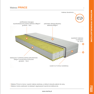 Materac PRINCE 9 profilowana masująca wysokoelastyczna pianka wellness 38kg/m3 grubość - 4cm pokrowiec dżersej pikowany włókniną 200g/m2 wysokość materaca w pokrowcu ok. 22cm elastyczna 7-strefowa pianka poliuretanowa 35kg/m3 ponacinana konturowo grubość - 14cm suwak na 4 strony rozdzielczy • Materac Prince to mocny i wysoki materac piankowy, w dobrym stosunku jakości do ceny. • Materac można użytkować na stelażach regulowanych ręcznie lub elektrycznie. www.merita.pl MATERACE WYSOKOELASTYCZNE materac dwustronny