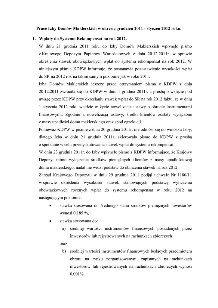 Prace Izby Domów Maklerskich w okresie grudzień 2011 - styczeń 2012 roku. 1. Wpłaty do Systemu Rekompensat na rok 2012. W dniu 21 grudnia 2011 roku do Izby Domów Maklerskich wpłynęło pismo z Krajowego Depozytu Papierów Wartościowych z dnia 20.12.2011r. w sprawie określenia stawek obowiązkowych wpłat do systemu rekompensat na rok 2012. W niniejszym piśmie KDPW informuje, Ŝe postanawia pozostawienie wysokości wpłat do SR na 2012 rok na takim samym poziomie jak w roku 2011. Izba Domów Maklerskich jeszcze przed otrzymaniem pisma z KDPW z dnia 20.12.2011 zwróciła się do KDPW w dniu 1 grudnia 2011r. z prośbą o wzięcie pod uwagę przez KDPW przy określaniu stawek wpłat do SR na rok 2012 faktu, Ŝe w dniu 1 stycznia 2012 roku wejdzie w Ŝycie nowelizacja ustawy o obrocie instrumentami finansowymi. Zgodnie z nowelizacją ustawy, środki klientów zostały wyłączone z masy upadłości domu maklerskiego oraz spod egzekucji. PoniewaŜ KDPW w piśmie z dnia 20 grudnia 2011r. nie odniósł się do wniosku Izby, dlatego Izba w dniu 21 grudnia 2011r. skierowała pismo do KDPW z prośbą o spotkanie w celu przedyskutowania stawek wpłat do systemu rekompensat. W dniu 23 grudnia 2011r. do Izby wpłynęło pismo z KDPW informujące, Ŝe Krajowy Depozyt mimo wyłączenia środków pienięŜnych klientów z masy upadłościowej domu maklerskiego, nadal nie widzi podstaw do obniŜenia stawek na rok 2012. Zarząd Krajowego Depozytu w dniu 29 grudnia 2011 podjął uchwałę Nr 1180/11 w sprawie określenia wysokości stawek stanowiących podstawę wyliczenia obowiązkowych rocznych wpłat do systemu rekompensat w roku 2012 na następującym poziomie: • stawka stosowana do średniego stanu środków pienięŜnych inwestorów wynosi 0,185 %, • stawka stosowana do: a) średniej wartości instrumentów finansowych posiadanych przez inwestorów lub rejestrowanych na rachunkach zbiorczych oraz b) średniej wartości instrumentów finansowych będących przedmiotem obrotu na rynku zorganizowanym, zapisanych na rachunkach inwestorów lub rejestrowanych na rachunkach zbiorczych wynosi 0,001%. 2. Warsztaty dot. komitetu wynagrodzeń w instytucji finansowej Izba Domów Maklerskich podjęła inicjatywę zorganizowania wspólnie z Polskim Instytutem Dyrektorów warsztatów dot. komitetu wynagrodzeń w instytucji finansowej. W dniu 23 grudnia 2011r. został wysłany mail do Członków Izby z prośbą o przesłanie informacji n/t. zainteresowania udziałem w tego typu warsztatach. Do dnia 4 stycznia 2012 roku zainteresowanie wyraziło 13 Członków Izby i 3 domy maklerskie spoza Członków IDM (Opera, Aviva Investors oraz Espirito Santo). Łącznie zgłoszono 25 osób. Izba za pośrednictwem Związku Banków Polskich zaprosiła równieŜ do wzięcia udziału w warsztatach pracowników banków zrzeszonych z ZBP. Warsztaty odbędą się w dniu 12 stycznia 2012r. w Hotelu Mariott Prelegentami podczas warsztatów będą: • Janusz Czarzasty - Prezes Zarządu Izby Domów Maklerskich • mec. Waldemat Gujski - Gujski, Zdebiak Kancelaria adwokacko-radcowska, Spółka partnerska • dr Hubert Janiszewski - Członek rad nadzorczych • Andrzej S. Nartowski - Prezes Polskiego Instytutu Dyrektorów • dr Wiesław Rozłucki - członek rad nadzorczych, przewodniczący Rady Programowej Polskiego Instytutu Dyrektorów Podczas warsztatów poruszone zostaną następujące tematy: • Wprowadzenie do polityki zmiennych składników wynagrodzeń w domach maklerskich • Polityka zmiennych składników wynagrodzeń w świetle rozporządzenia Ministra Finansów z dn. 2 grudnia 2011 r. • Przegląd doświadczeń z pracy w komitetach wynagrodzeń • Komitet wynagrodzeń w architekturze prawnej spółki akcyjnej • Rola komitetów rady nadzorczej w realizacji jej zadań W dniu 4 stycznia 2012r. do domów maklerskich rozesłany został szczegółowy program i formularz zgłoszeniowy. 3. Raport dot. bilansu wydłuŜenia sesji giełdowej W dniu 13 grudnia 2011r. Pan Prezes Janusz Czarzasty oraz Pan Krzysztof Polak odbyli spotkanie z Panem Marcinem Kotlarczykiem z Boston Consultimg Group w celu przedyskutowania propozycji przygotowania przez BCG dla IDM materiału dot. bilansu wydłuŜenia sesji giełdowej. Podczas spotkania zostały zaprezentowane załoŜenia Izby, co do formy takiego opracowania. JednakŜe koszt opracowania tego typu materiału przez BCG okazał się stanowczo za wysoki. W związku z powyŜszym Izba nawiązała współpracę inną wiodącą firmą doradczą w sprawie z przygotowania takiego materiału. Obecnie trwają rozmowy n/t. zakresu, formy i kosztów przygotowania raportu dla IDM. Jednocześnie Izba bardzo liczy na zaangaŜowanie się Członków Izby w prace nad przygotowaniem takiego materiału w szczególności na przekazanie konkretnych danych, w jakich godzinach inwestorzy są najbardziej aktywni. 4. Udział Izby w dyskusji środowiskowej z GPW n/t. obniŜenia opłat pobieranych od Członków Giełdy Izba od samego początku jest zaangaŜowana w kwestię obniŜenia opłat pobieranych od Członków Giełdy. W dniu 29 listopada 2011r. Izba przesłała do domów maklerskich (nie tylko Członków Izby) tabelę dot. udziału kosztów GPW i KDPW w przychodach prowizyjnych brokerów z prośbą o jej wypełnienie i odesłanie do IDM. W dniu 2 grudnia 2011r. Izba przekazała do GPW zagregowane zestawienie udziału opłat GPW i KDPW w przychodach prowizyjnych od brokerów, generujących ponad 50% obrotów. W związku informacją z Giełdy, Ŝe taka forma tabeli jest nie do końca dla GPW satysfakcjonująca, Izba w dniu 7 grudnia 2011r. przekazała (bez podawania nazw domów maklerskich) szczegółowe dane otrzymane od brokerów. W dniu 5 stycznia 2012r. zostało przesłane pismo do Giełdy zwierające wnioski Izby n/t. obniŜenia opłat giełdowych oraz harmonogram kontaktów Izby i Giełdy w tej sprawie. 5. Konferencja programowa Izby Domów Maklerskich Konferencja programowa IDM odbędzie się w 