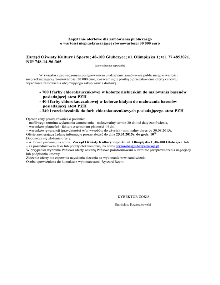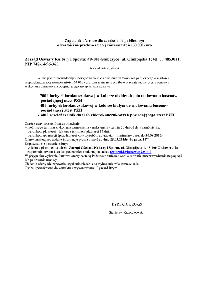 Zapytanie ofertowe dla zamówienia publicznego o wartości nieprzekraczającej równowartości 30 000 euro Zarząd Oświaty Kultury i Sportu; 48-100 Głubczyce; ul. Olimpijska 1; tel. 77 4853021, NIP 748-14-96-365 (dane adresata zapytania) W związku z prowadzonym postępowaniem o udzielenie zamówienia publicznego o wartości nieprzekraczającej równowartości 30 000 euro, zwracam się z prośbą o przedstawienie oferty cenowej wykonania zamówienia obejmującego zakup wraz z dostawą - 700 l farby chlorokauczukowej w kolorze niebieskim do malowania basenów posiadającej atest PZH - 40 l farby chlorokauczukowej w kolorze białym do malowania basenów posiadającej atest PZH - 340 l rozcieńczalnik do farb chlorokauczukowych posiadającego atest PZH Oprócz ceny proszę również o podanie: – możliwego terminu wykonania zamówienia - maksymalny termin 30 dni od daty zamówienia, – warunków płatności - faktura z terminem płatności 14 dni, – warunków gwarancji (przydatności w/w wyrobów do użycia) - minimalny okres do 30.08.2015r. Ofertę zawierającą żądane informacje proszę złożyć do dnia 25.03.2015r. do godz. 1000 Dopuszcza się złożenie oferty: – w formie pisemnej na adres: Zarząd Oświaty Kultury i Sportu, ul. Olimpijska 1, 48-100 Głubczyce lub – za pośrednictwem faxu lub poczty elektronicznej na adres [email protected] W przypadku wybrania Państwa oferty zostaną Państwo poinformowani o terminie przeprowadzenia negocjacji lub podpisania umowy. Złożenie oferty nie zapewnia uzyskania zlecenia na wykonanie w/w zamówienia. Osoba upoważniona do kontaktu z wykonawcami Ryszard Rzym. DYREKTOR ZOKiS Stanisław Krzaczkowski