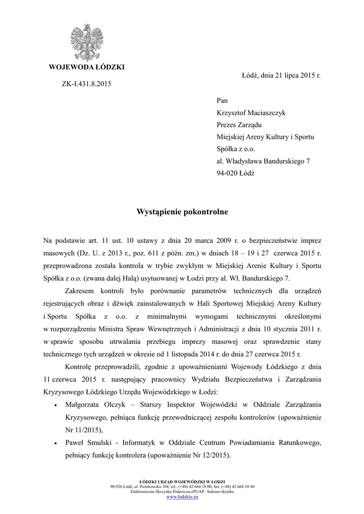 WOJEWODA ŁÓDZKI Łódź, dnia 21 lipca 2015 r. ZK-I.431.8.2015 Pan Krzysztof Maciaszczyk Prezes Zarządu Miejskiej Areny Kultury i Sportu Spółka z o.o. al. Władysława Bandurskiego 7 94-020 Łódź Wystąpienie pokontrolne Na podstawie art. 11 ust. 10 ustawy z dnia 20 marca 2009 r. o bezpieczeństwie imprez masowych (Dz. U. z 2013 r., poz. 611 z późn. zm.) w dniach 18 – 19 i 27 czerwca 2015 r. przeprowadzona została kontrola w trybie zwykłym w Miejskiej Arenie Kultury i Sportu Spółka z o.o. (zwana dalej Halą) usytuowanej w Łodzi przy al. Wł. Bandurskiego 7. Zakresem kontroli było porównanie parametrów technicznych dla urządzeń rejestrujących obraz i dźwięk zainstalowanych w Hali Sportowej Miejskiej Areny Kultury i Sportu Spółka z o.o. z minimalnymi wymogami technicznymi określonymi w rozporządzeniu Ministra Spraw Wewnętrznych i Administracji z dnia 10 stycznia 2011 r. w sprawie sposobu utrwalania przebiegu imprezy masowej oraz sprawdzenie stany technicznego tych urządzeń w okresie od 1 listopada 2014 r. do dnia 27 czerwca 2015 r. Kontrolę przeprowadzili, zgodnie z upoważnieniami Wojewody Łódzkiego z dnia 11 czerwca 2015 r. następujący pracownicy Wydziału Bezpieczeństwa i Zarządzania Kryzysowego Łódzkiego Urzędu Wojewódzkiego w Łodzi: • Małgorzata Olczyk – Starszy Inspektor Wojewódzki w Oddziale Zarządzania Kryzysowego, pełniąca funkcję przewodniczącej zespołu kontrolerów (upoważnienie Nr 11/2015), • Paweł Smulski - Informatyk w Oddziale Centrum Powiadamiania Ratunkowego, pełniący funkcję kontrolera (upoważnienie Nr 12/2015). ŁÓDZKI URZĄD WOJEWÓDZKI W ŁODZI 90-926 Łódź, ul. Piotrkowska 104, tel.: (+48) 42 664 10 00, fax: (+48) 42 664 10 40 Elektroniczna Skrzynka Podawcza ePUAP: /lodzuw/skrytka www.lodzkie.eu Ocenie poddano następujące zagadnienia: • Przygotowanie organizacyjne do realizacji zadań z zakresu bezpieczeństwa imprez masowych. • Sposób utrwalania przebiegu imprezy masowej, uwzględniając miejsce rejestracji na obiekcie. • Realizację obowiązków wynikających z Decyzji Wojewody Łódzkiego Nr ZK.I.50313/10 z dnia 26 lutego 2010 r. w sprawie umieszczenia hali sportowo – widowiskowej Atlas Arena usytuowanej w Łodzi przy al. Bandurskiego 7 w wykazie stadionów, obiektów i terenów, na których utrwalanie przebiegu imprez masowych za pomocą urządzeń rejestrujących obraz i dźwięk jest obowiązkowe. • Sposób gromadzenia, przechowywania i niszczenia materiałów z utrwalonych przebiegów imprez masowych organizowanych w Miejskiej Arenie Kultury i Sportu. • Stan techniczny i minimalne wymogi techniczne dla urządzeń rejestrujących obraz i dźwięk zainstalowanych w Hali, zgodnie z rozporządzeniem Ministra Spraw Wewnętrznych i Administracji z dnia 10 stycznia 2011 r. w sprawie sposobu utrwalania przebiegu imprezy masowej. Zgodnie z Krajowym Rejestrem Sądowym, Firma, pod którą działa spółka nosi nazwę „Miejska Arena Kultury i Sportu” Spółka z ograniczoną odpowiedzialnością, a organem uprawnionym do reprezentowania podmiotu jest Zarząd. Do składania oświadczeń w imieniu Spółki powołany jest Prezes Zarządu Pan Krzysztof Maciaszczyk. Przed przystąpieniem do czynności kontrolnych kontrolerzy dokonali w siedzibie Miejskiej Areny Kultury i Sportu wpisu do książki kontroli. Badaniem objęto dokumentację przedstawioną przez pracownika Miejskiej Areny Kultury i Sportu Spółka z o.o. - p. Tomasza Jabłońskiego. W ramach przygotowania organizacyjnego przedstawiono kontrolującym umowę dzierżawy zawartą w dniu 17 czerwca 2009 r. pomiędzy Miastem Łódź a Miejską Areną Kultury i Sportu Spółka z o.o. w przedmiocie dzierżawy nieruchomości zabudowanych położonych w Łodzi przy al. Władysława Bandurskiego 7. W toku czynności kontrolnych przedstawiono kontrolującym również umowę zawartą w dniu 4 sierpnia 2014 r. pomiędzy Miejską Areną Kultury i Sportu Sp. z o.o. a ASD J. Ciegielski Spółka Komandytowa (na okres dwóch lat - obowiązującą od dnia 4 sierpnia 2014 r. do dnia 3 sierpnia 2016 r.), której przedmiotem jest usługa serwisowa instalacji teletechnicznych, która ma na celu utrzymanie w pełnej sprawności systemów monitorujących kontrolowanej Hali. Na kontrolowanym obiekcie, system monitoringu wizyjnego składa się z 127 kamer cyfrowych obrotowych stałopozycyjnych. System CCTV został wdrożony w czerwcu 2009 r. przez firmę ASD sp. z o.o. Kontrolujący dysponuje dokumentacją powykonawczą systemu monitoringu wizyjnego dla obiektu „Hala widowiskowo – sportowa w Łodzi” Kategoria I, opracowaną przez ASD sp. z o.o. Przedstawiono kontrolującym schemat rozmieszczenia poszczególnych elementów monitoringu, który pokrywał się ze stanem faktycznym. Wszystkie urządzenia były sprawne i w pełni funkcjonujące. W okresie objętym kontrolą system monitoringu zainstalowany w Hali był regularnie konserwowany. Sposób montażu poszczególnych elementów monitoringu wypełnia zapisy § 4 ust. 1 i 2 rozporządzenia Ministra Spraw Wewnętrznych i Administracji z dnia 10 stycznia 2011 r. w sprawie sposobu utrwalania przebiegu imprezy masowej. Sprawdzenie sposobu utrwalania przebiegu imprezy masowej, uwzględniające miejsce rejestracji w Hali nastąpiło podczas imprezy masowej w dniu 27 czerwca 2015 r. (koncert zespołu JUDAS PRIEST). Sporządzono stosowny protokół oględzin. System rejestrujący dźwięk podczas tej imprez umożliwiał zrozumienie treści nagranych haseł i okrzyków oraz dawał możliwość określenia sposobu zachowania się uczestników. System rejestrujący imprezy dawał również możliwość natychmiastowego wydrukowania zarejestrowanego obrazu w wielkości nie mniejszej niż 9 x 13 cm i z rozdzielczością nie mniejszą niż 300 dpi. W czasie kontroli stwierdzono, że zarejestrowane materiały z prowadzonych imprez masowych są przechowywane bezpośrednio na elektronicznym nośniku informacji w postaci d