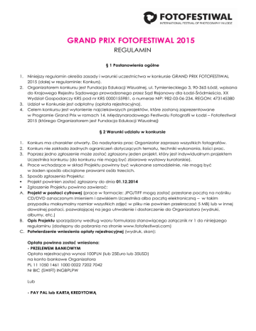 GRAND PRIX FOTOFESTIWAL 2015 REGULAMIN § 1 Postanowienia ogólne 1. Niniejszy regulamin określa zasady i warunki uczestnictwa w konkursie GRAND PRIX FOTOFESTIWAL 2015 (dalej w regulaminie: Konkurs). 2. Organizatorem konkursu jest Fundacja Edukacji Wizualnej, ul. Tymienieckiego 3, 90-365 Łódź, wpisana do Krajowego Rejestru Sądowego prowadzonego przez Sąd Rejonowy dla Łodzi-Śródmieścia, XX Wydział Gospodarczy KRS pod nr KRS 0000155981, o numerze NIP: 982-03-06-234, REGON: 473145380 3. Udział w Konkursie jest odpłatny (opłata rejestracyjna). 4. Celem konkursu jest wyłonienie najciekawszych projektów, które zostaną zaprezentowane w Programie Grand Prix w ramach 14. Międzynarodowego Festiwalu Fotografii w Łodzi – Fotofestiwal 2015 (którego Organizatorem jest Fundacja Edukacji Wizualnej) § 2 Warunki udziału w konkursie 1. Konkurs ma charakter otwarty. Do nadsyłania prac Organizator zaprasza wszystkich fotografów. 2. Konkurs nie zakłada żadnych ograniczeń dotyczących tematu, techniki wykonania, ilości prac. 3. Poprzez jedno zgłoszenie może zostać zgłoszony jeden projekt, który jest indywidualnym projektem Uczestnika konkursu (do konkursu nie mogą być zbiorowe wystawy kuratorskie). 4. Prace wchodzące w skład Projektu powinny być wykonane samodzielnie, nie mogą być w żaden sposób obciążone prawami osób trzecich. 5. Sposób zgłoszenia Projektu: Projekt powinien zostać zgłoszony do dnia 01.12.2014 Zgłoszenie Projektu powinno zawierać: A. Projekt w postaci cyfrowej (prace w formacie: JPG/TIFF mogą zostać przesłane pocztą na nośniku CD/DVD oznaczonym imieniem i azwiskiem Uczestnika albo pocztą elektroniczną – w takim przypadku maksymalny rozmiar wszystkich zdjęć w pliku nie powinien przekraczać 5 MB) lub w innej dowolnej postaci, pozwalającej na jego utrwalenie i dostarczenie do Organizatora (wydruki, albumy, etc.) B. Opis Projektu sporządzony według wzoru formularza stanowiącego załącznik nr 1 do niniejszego regulaminu (dostępny do pobrania na stronie www.fotofestiwal.com) C. Potwierdzenie wniesienia opłaty rejestracyjnej (wydruk, skan): Opłata powinna zostać wniesiona: - PRZELEWEM BANKOWYM Opłata rejestracyjna wynosi 100PLN (lub 25Euro lub 35USD) na konto bankowe Organizatora PL 11 1050 1461 1000 0022 7202 7042 Nr BIC (SWIFT) INGBPLPW Lub - PAY PAL lub KARTĄ KREDYTOWĄ Opłata rejestracyjna wynosi 100 PLN Wystawienie faktury VAT jest możliwe jedynie przy płatności przelewem bankowym. o Wszystkie koszty związane z wykonaniem przelewu bankowego (w tym w przypadkach przelewów dokonywanych spoza granicy Polski) ponosi Uczestnik Konkursu. Potwierdzenie wniesienia opłaty rejestracyjnej powinno być przesłane Organizatorowi wraz ze zgłoszeniem. W uzasadnionych indywidualnych przypadkach (trudności z wykonaniem przelewu) czas na wniesienie opłaty rejestracyjnej (wpływ na konto) zostanie wydłużony o 5 dni od upływu terminu zgłoszeń (po uprzednim zgłoszeniu zawiadomieniu Organizator). W przypadku niewniesienia opłaty rejestracyjnej zgłoszenie Uczestnika zostanie odrzucone. W tytule przelewu powinny znaleźć się: nazwa Konkursu „Grand Prix” oraz imię i nazwisko osoby zgłaszającej się do Konkursu Wniesiona Opłata rejestracyjna nie będzie zwracana Uczestnikom i zostanie przeznaczona na realizację celów statutowych Organizatora UWAGA! Istnieje możliwość bezpłatnego uczestnictwa w konkursie. Takie zgłoszenia będą uwzględniane jedynie przy podaniu stosownej argumentacji. Więcej informacji można uzyskać pod adresem [email protected] Kompletne zgłoszenie Projektu należy dostarczyć: - pocztą elektroniczną na adres [email protected] (plik do 5MB) lub - osobiście/ pocztą na adres: Fundacja Edukacji Wizualnej, ul. Tymienieckiego 3, 90-365 Łódź, Polska Zgłoszenie Projektu powinno zostać umieszczone w kopercie lub opakowane w inny sposób, który ogranicza możliwość uszkodzenia prac. Opakowanie powinno zostać opatrzone napisem „GRAND PRIX 2014”W przypadku dostarczenia zgłoszenia pocztą decyduje data wysłania zgłoszenia (stempel pocztowy). 7. Nie będą brane pod uwagę zgłoszenia niespełniające powyższych wymogów. § 3 Ocena prac konkursowych i nagrody 1. Termin nadsyłania zgłoszeń mija w dniu 01.12.2014. Zgłoszenia, które wpłyną do siedziby Organizatora po terminie nie będą brane pod uwagę. 2. Oceny prac dokona Jury powołane przez Organizatora. 3. W skład Jury wejdą: Alison Nordström – międzynarodowy kurator, były dyrektor działu fotografii George Eastman House, USA Henriette Hinz – Triennale of Photography in Hamburg, Niemcy Peggy Sue Amison – dyrektor artystyczna East Wing Dubai, Zjednoczone Emiraty Arabskie Krzysztof Candrowicz, dyrektor FOTOFESTIWALU Międzynarodowego Festiwalu Fotografii w Łodzi, Polska Alessandra Copadacqua – Studio Maragoni we Florencji, Włochy Anna-Kaisa Rastenberger, Fińskie Muzeum Fotografii, Finlandia Bill Kouwenhoven – niezależny krytyk fotografii, kurator, Wielka Brytania Erik Vroons, redaktor magazynu „GUP”, Holandia Adam Mazur, kurator, redaktor naczelny magazynu „SZUM”, Polska Rafał Milach, fotograf, współzałożyciel kolektywu Sputnik, Polska Marta Szymańska, Fundacja Archeologii Fotografii, Polska Jakub Śwircz, kurator i wykładowca, Polska 4. Decyzje Jury będą ostateczne. 5. Jury nie będzie miało obowiązku uzasadniać swoich decyzji oraz przedstawiać informacji z przebiegu obrad. 6. Spośród projektów zgłoszonych przez Uczestników Jury wyłoni: A. Zwycięzcę Konkursu, który otrzyma nagrodę pieniężną w wysokości 10.000 zł (około 2300 euro), a jego projekt zostanie zaprezentowany podczas wystawy w ramach 14. Międzynarodowego Festiwalu Fotografii w Łodzi - Fotofestiwal 2015 (maj-czerwiec 2015). W ramach organizacji wystawy Zwycięzcy Konkursu Organizator zapewni między innymi: - pokrycie kosztów produkcji prac wchodzących w skład Projektu albo transport i transport zwrotn