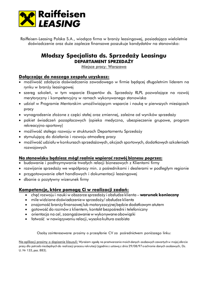 Raiffeisen-Leasing Polska S.A., wiodąca firma w branży leasingowej, posiadająca wieloletnie doświadczenie oraz duże zaplecze finansowe poszukuje kandydatów na stanowisko: Młodszy Specjalista ds. Sprzedaży Leasingu DEPARTAMENT SPRZEDAŻY Miejsce pracy: Warszawa Dołączając do naszego zespołu uzyskasz: • możliwość zdobycia doświadczenia zawodowego w firmie będącej długoletnim liderem na rynku w branży leasingowej • szereg szkoleń, w tym wsparcie Ekspertów ds. Sprzedaży RLPL pozwalające na rozwój merytoryczny i kompetencyjny w ramach wykonywanego stanowiska • udział w Programie Mentorskim umożliwiającym wsparcie i naukę w pierwszych miesiącach pracy • wynagrodzenie złożone z części stałej oraz zmiennej, zależne od wyników sprzedaży • pakiet świadczeń pozapłacowych (opieka medyczna, ubezpieczenie grupowe, program rekreacyjno-sportowy) • możliwość stałego rozwoju w strukturach Departamentu Sprzedaży • stymulującą do działania i rozwoju atmosferę pracy • możliwość udziału w konkursach sprzedażowych, akcjach sportowych, dodatkowych szkoleniach rozwojowych Na stanowisku będziesz mógł realnie wspierać rozwój biznesu poprzez: • budowanie i podtrzymywanie trwałych relacji biznesowych z Klientami firmy • rozwijanie sprzedaży we współpracy min. z pośrednikami i dealerami w podległym regionie • przygotowywanie ofert handlowych i dokumentacji leasingowej • dbanie o pozytywny wizerunek firmy Kompetencje, które pomogą Ci w realizacji zadań: • • • • • • chęć rozwoju i nauki w obszarze sprzedaży i obsłudze klienta – warunek konieczny mile widziane doświadczenie w sprzedaży/ obsłudze klienta znajomość branży finansowej lub motoryzacyjnej będzie dodatkowym atutem gotowość do rozmów z klientem, kontakt bezpośredni i telefoniczny orientacja na cel, zaangażowanie w wykonywane obowiązki łatwość w nawiązywaniu relacji, wysoka kultura osobista Osoby zainteresowane prosimy o przesyłanie CV za pośrednictwem poniższego linku: Na aplikacji prosimy o dopisanie klauzuli: Wyrażam zgodę na przetwarzanie moich danych osobowych zawartych w mojej ofercie pracy dla potrzeb niezbędnych do realizacji procesu rekrutacji (zgodnie z ustawą z dnia 29/08/97 o ochronie danych osobowych, Dz. U. Nr 133, poz. 883).