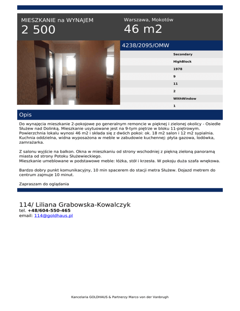 MIESZKANIE na WYNAJEM 2 500 Warszawa, Mokotów 46 m2 4238/2095/OMW Secondary HighBlock 1978 9 11 2 WithWindow 1 Opis Do wynajęcia mieszkanie 2-pokojowe po generalnym remoncie w pięknej i zielonej okolicy - Osiedle Służew nad Dolinką. Mieszkanie usytuowane jest na 9-tym piętrze w bloku 11-piętrowym. Powierzchnia lokalu wynosi 46 m2 i składa się z dwóch pokoi: ok. 18 m2 salon i 12 m2 sypialnia. Kuchnia oddzielna, widna wyposażona w meble w zabudowie kuchennej: płyta gazowa, lodówka, zamrażarka. Z salonu wyjście na balkon. Okna w mieszkaniu od strony wschodniej z piękną zieloną panoramą miasta od strony Potoku Służewieckiego. Mieszkanie umeblowane w podstawowe meble: łóżka, stół i krzesła. W pokoju duża szafa wnękowa. Bardzo dobry punkt komunikacyjny, 10 min spacerem do stacji metra Służew. Dojazd metrem do centrum zajmuje 10 minut. Zapraszam do oglądania 114/ Liliana Grabowska-Kowalczyk tel. +48/604-550-465 email: [email protected] Kancelaria GOLDHAUS & Partnerzy Marco von der Vanbrugh Powered by TCPDF (www.tcpdf.org)