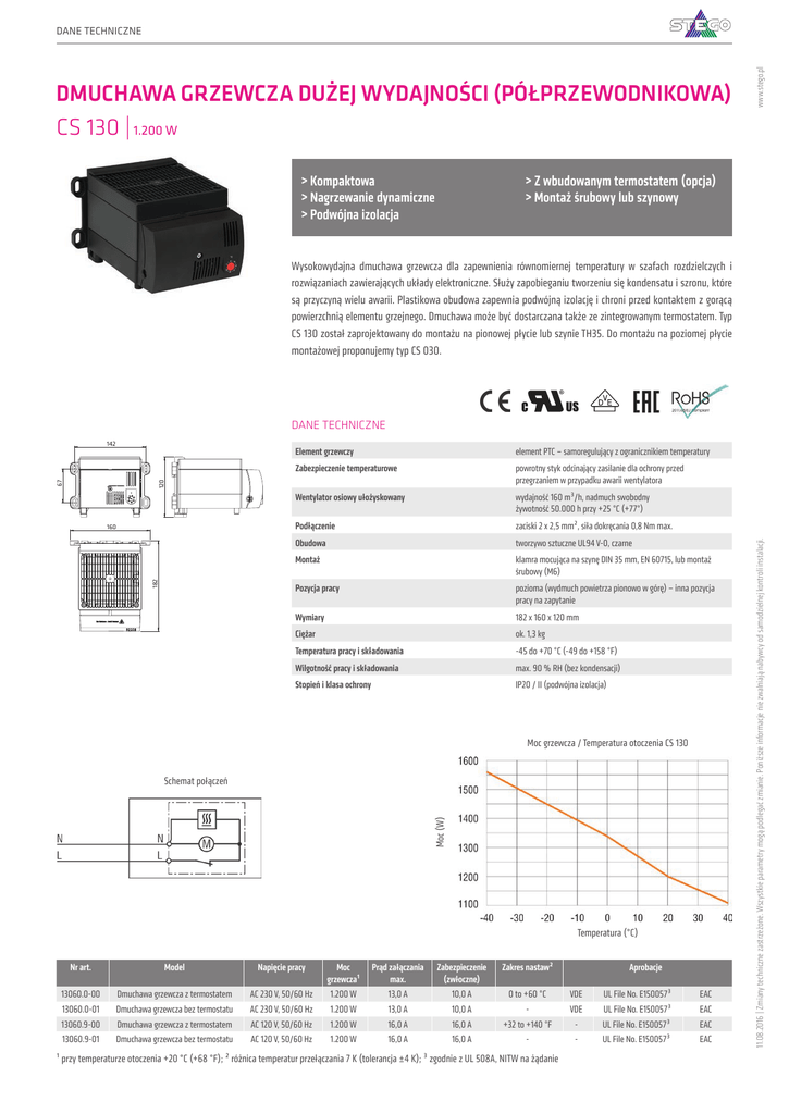 DMUCHAWA GRZEWCZA DUŻEJ WYDAJNOŚCI (PÓŁPRZEWODNIKOWA) CS 130 | 1.200 W >>Kompaktowa >>Nagrzewanie dynamiczne >>Podwójna izolacja www.stego.pl 33 OGRZEWANIE KATALOG PRODUKTÓW STEGO DANE TECHNICZNE >>Z wbudowanym termostatem (opcja) >>Montaż śrubowy lub szynowy Wysokowydajna dmuchawa grzewcza dla zapewnienia równomiernej temperatury w szafach rozdzielczych i rozwiązaniach zawierających układy elektroniczne. Służy zapobieganiu tworzeniu się kondensatu i szronu, które są przyczyną wielu awarii. Plastikowa obudowa zapewnia podwójną izolację i chroni przed kontaktem z gorącą powierzchnią elementu grzejnego. Dmuchawa może być dostarczana także ze zintegrowanym termostatem. Typ CS 130 został zaprojektowany do montażu na pionowej płycie lub szynie TH35. Do montażu na poziomej płycie montażowej proponujemy typ CS 030. element PTC – samoregulujący z ogranicznikiem temperatury Zabezpieczenie temperaturowe powrotny styk odcinający zasilanie dla ochrony przed przegrzaniem w przypadku awarii wentylatora Wentylator osiowy ułożyskowany wydajność 160 m³/h, nadmuch swobodny żywotność 50.000 h przy +25 °C (+77°) Podłączenie zaciski 2 x 2,5 mm², siła dokręcania 0,8 Nm max. Obudowa tworzywo sztuczne UL94 V-0, czarne Montaż klamra mocująca na szynę DIN 35 mm, EN 60715, lub montaż śrubowy (M6) Pozycja pracy pozioma (wydmuch powietrza pionowo w górę) – inna pozycja pracy na zapytanie Wymiary 182 x 160 x 120 mm Ciężar ok. 1,3 kg Temperatura pracy i składowania -45 do +70 °C (-49 do +158 °F) Wilgotność pracy i składowania max. 90 % RH (bez kondensacji) Stopień i klasa ochrony IP20 / II (podwójna izolacja) 67 120 Element grzewczy 182 160 Moc grzewcza / Temperatura otoczenia CS 130 Moc (W) Schemat połączeń Temperatura (°C) Nr art. Model Napięcie pracy Moc grzewcza¹ Prąd załączania max. Zabezpieczenie (zwłoczne) Zakres nastaw² 13060.0-00 Dmuchawa grzewcza z termostatem AC 230 V, 50/60 Hz 1.200 W 13,0 A 10,0 A 0 to +60 °C VDE UL File No. E150057³ EAC 13060.0-01 Dmuchawa grzewcza bez termostatu AC 230 V, 50/60 Hz 1.200 W 13,0 A 10,0 A - VDE UL File No. E150057³ EAC 13060.9-00 Dmuchawa grzewcza z termostatem AC 120 V, 50/60 Hz 1.200 W 16,0 A 16,0 A +32 to +140 °F - UL File No. E150057³ EAC 13060.9-01 Dmuchawa grzewcza bez termostatu AC 120 V, 50/60 Hz 1.200 W 16,0 A 16,0 A - - UL File No. E150057³ EAC ¹ przy temperaturze otoczenia +20 °C (+68 °F); ² różnica temperatur przełączania 7 K (tolerancja ±4 K); ³ zgodnie z UL 508A, NITW na żądanie Aprobacje 11.08.2016 | Zmiany techniczne zastrzeżone. Wszystkie parametry mogą podlegać zmianie. Poniższe informacje nie zwalniają nabywcy od samodzielnej kontroli instalacji. DANE TECHNICZNE 142