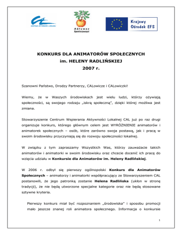 KONKURS DLA ANIMATORÓW SPOŁECZNYCH im. HELENY RADLIŃSKIEJ 2007 r. Szanowni Państwo, Drodzy Partnerzy, CALowicze i CALowiczki! Wiemy, Ŝe w Waszych środowiskach jest wielu ludzi, którzy oŜywiają społeczności, są swojego rodzaju „iskrą społeczną”, dzięki której moŜliwa jest zmiana. Stowarzyszenie Centrum Wspierania Aktywności Lokalnej CAL juŜ po raz drugi organizuje konkurs, którego głównym celem jest WYRÓśNIENIE animatorów i animatorek społecznych – osób, które zarówno swoja postawą, jak i pracą w swoim środowisku przyczyniają się do rozwoju społeczności lokalnej. W związku z tym zapraszamy Wszystkich Was, którzy zauwaŜacie takich animatorów i animatorki w swoim środowisku oraz chcecie docenić ich pracę do wzięcia udziału w Konkursie dla Animatorów im. Heleny Radlińskiej. W 2006 r. odbył się pierwszy ogólnopolski Konkurs dla Animatorów Społecznych – animatorzy i animatorki współpracujący ze Stowarzyszeniem CAL postanowili, Ŝe jego patronką zostanie Helena Radlińska (ukłon w stronę tradycji), Ŝe nie będą utworzone specjalne kategorie oraz nie będą stosowane sztywne kryteria. Pierwszy konkurs miał być rozpoznaniem „środowiska” i sposobu promocji mało jeszcze znanej roli animatora społecznego. Informacja o konkursie 1 dystrybuowana była poprzez portal ngo.pl i poprzez sieci organizacjikoalicjantów Aktywnych Społeczności. Na konkurs wpłynęło 45 zgłoszeń, z czego do Konkursu finału zakwalifikowano tworzona przez 12. WyróŜnienia reprezentantów przyznała środowiska Kapituła akademickiego zajmującego się problematyką animacji. W skład Kapituły weszli: prof. Wiesław Theiss, UW, przewodniczący, prof. Witold Chmielewski, UMK Toruń, prof. Maria Mendel, UG, dr Bohdan Skrzypczak, Stowarzyszenie CAL, sekretarz. WyróŜnienia odebrało 6 osób (które włączone są do Kapituły Konkursu): - Teresa Bebak – Oświęcim, Lokalne Grupy Obywatelskie Działa na rzecz osób bezrobotnych i dzieci z rodzin dysfunkcyjnych, a jednocześnie jest jedną z naszych najaktywniejszych liderek zajmujących się przejrzystością Ŝycia publicznego. Osiągnęła sukces, poniewaŜ umie zgromadzić wokół siebie ludzi i zarazić ich chęcią działania! Pozyskuje koalicjantów w lokalnym środowisku, oraz innych mieszkańców Oświęcimia do aktywnego działania. - Norbert Krzykawski – Witowie, Stowarzyszenie Pomocy „Szansa” Zaczynał jako pracownik socjalny w Gminnym Ośrodku Pomocy Społecznej oraz w Powiatowym Centrum Pomocy Rodzinie. Potrzeba niezaleŜności sprawiła, Ŝe znalazł się w Stowarzyszeniu, którego pierwszą misją jest aktywizacja osób niepełnosprawnych. - Barbara Bąbska – Radom, Miejski Ośrodek Pomocy Społecznej Od 20 lat jest pracownicą socjalną oraz kierowniczką Zespołu Strategii i Doradztwa Metodycznego w Miejskim Ośrodku Pomocy Społecznej w Radomiu. Od 6 lat wdraŜa projekt CAL w Radomiu, tworząc całościową politykę edukacyjno- wsparciową dla pracowników socjalnych skierowaną na aktywizację ludzi i społeczności lokalnych do samopomocy. - Anna Zielińska – Grajewo, Stowarzyszenie Wspierania Inicjatyw Społecznych na Rzecz Osób Niepełnosprawnych 2 ZałoŜycielka i prezeska Stowarzyszenia. Animatorka wielu działań w środowisku lokalnym. Jednym z jej ostatnich sukcesów jest zainicjowanie pierwszego w województwie Centrum Integracji Społecznej. - Katarzyna Lisińska – Warszawa, Centrum Wolontariatu Wolontariuszka i animatorka w programach prowadzonych przez Centrum Wolontariatu. Kinga Chrzanowska z Centrum Wolontariatu pisała o niej w zgłoszeniu: „Z duŜą łatwością potrafi samodzielnie kreować nowe projekty i w szybkim czasie przekonuje do nich następne osoby – zachęca nowych wolontariuszy do udziału w akcjach społecznych, opiekuje się nimi, prowadzi dla nich szkolenia.” - Benona Skrzypek – Gogolewko, Fundacja „Kaszubskie Słoneczniki” Prezeska Fundacji i dyrektorka Szkoły Podstawowej w NoŜynie. W Gogolewku w gminie Dębnica Kaszubska jej organizacja tworzy słonecznikową wieś, wytycza ścieŜki rowerowe, organizuje szkolenia i spotkania. Jest jednym z czternastu tutorów Programu Liderzy PAFW, czyli osobą wspierającą i mającą pod sobą grupę liderów. Zeszłoroczne doświadczenia pokazały, iŜ warto jest promować zarówno ludzi, którzy tak wiele robią w środowisku lokalnym, jak i nowy model pracy w społeczności oraz ze społecznością lokalną. Z PowaŜaniem Bohdan Skrzypczak Prezes Stowarzyszenia CAL 3 4