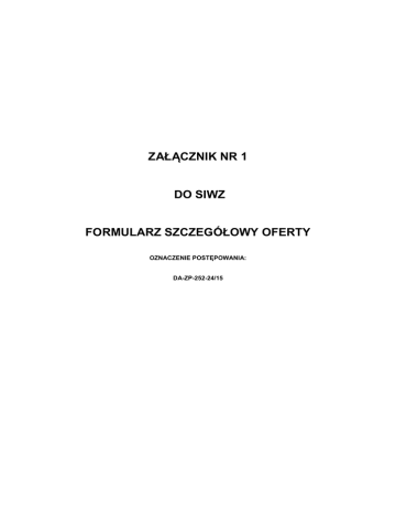 ZAŁĄCZNIK NR 1 DO SIWZ FORMULARZ SZCZEGÓŁOWY OFERTY OZNACZENIE POSTĘPOWANIA: DA-ZP-252-24/15 Pakiet nr 1 Lp. Nazwa asortymentu Jednostka Ilość miary Cena Wartość Nazwa handlowa/ jednostkowa brutto nr katalogowy Wytwórca brutto za op/szt 1 Spodnie i bluzy jednorazowe do procedur medycznych wysokiego ryzyka, niesterylne, z trójwarstwowej włókniny, dodatkowo wzmocnione szwy i w kroku, bluzy szt 3 000 szt 23 000 z krótkim rękawem, spodnie ze ściąganym pasem. Rozmiary od XS do XXXL. 2. Ręczniki absorbcyjne niesterylne o wymiarach 38 x 56 cm, wykonane z niepylącego i szybkonasiąkliwego materiału polipropylenowego, wzmocnionego siatką zapobiegającą odrywaniu się po nasiąknięciu Wartość brutto pakietu: ................................. zł Zastosowano stawkę VAT: .......... % Słownie: .................................................................................. .................................................................... /podpis i pieczątka upoważnionego przedstawiciela/ 1 PAKIET 2 Lp. Nazwa asortymentu Jedn. Ilość miary Cena Wartość Nazwa jednostkowa brutto handlowa/ brutto 1. Rurka tracheotomijna z polietylenu rozmiar Wytwórca nr katalogowy 7-9S (standardowe bez otworu A) rozmiar 7-9L oraz 7-9LL, przedłużone bez otworu A, jednorazowego użytku sterylna, szt 150 szt 110 pakowana jednostkowo 2. Rurka tracheotomijna z polietylenu rozmiar 7-8S z otworem B (otwór znajduje się w środkowej części rurki) jednorazowego użytku, sterylna, pakowana jednostkowo Wartość brutto pakietu: ................................. zł Zastosowano stawkę VAT: .......... % Słownie: ................................................................................................................................................................... .................................................................... /podpis i pieczątka upoważnionego przedstawiciela / 2 PAKIET 3 Lp. Nazwa asortymentu Jedn. Ilość miary Cena Wartość Nazwa jednostkowa brutto handlowa/ brutto 1. Wytwórca nr katalogowy Czujnik BIS Qatro do pomiaru głębokości snu w czasie znieczulenia ogólnego jednorazowy, sterylny, samoprzylepny, pakowany jednostkowo a) dla dorosłych szt 500 szt 100 b) dla dzieci Wartość brutto pakietu: ................................. zł Zastosowano stawkę VAT: .......... % Słownie: ................................................................................................................................................................... .................................................................... /podpis i pieczątka upoważnionego przedstawiciela / 3 PAKIET 4 Lp. Nazwa asortymentu Jedn. Ilość miary Cena Wartość Nazwa jednostkowa brutto handlowa/ brutto 1. Wytwórca nr katalogowy Jednorazowy, sterylny zestaw do nebulizacji , nebulizujący minimum 3 ml przy przepływie mieszaniny oddechowej szt 8 000 7l/min. łącznik do podłączenia w układ oddechowy respiratora, w kształcie litery T z końcówkami 22 F i 22M/15F dren przyłączeniowy do źródła tlenu o długości 200 cm odporny na zgniatanie zakończony elastycznym, plastycznym żeńskim złączem w kształcie stożka Wartość brutto pakietu: ................................. zł Zastosowano stawkę VAT: .......... % Słownie: ................................................................................................................................................................... .................................................................... /podpis i pieczątka upoważnionego przedstawiciela / 4 PAKIET 5 Lp. Nazwa asortymentu Jedn. Ilość miary Cena Wartość Nazwa jednostkowa brutto handlowa/ brutto Wytwórca nr katalogowy 1. Mankiet wielorazowy ciśnieniowy do szybkiego toczenia, pasujący do standardowych opakowań płynów w workach po 500 i 1000 ml, wyposażony w manometr widoczny z dużej odległości z wyraźnym oznaczeniem kolorystycznym, wyskalowany w mmHg, budowa mankietu pozwalająca na szt 100 utrzymanie stałej wartości ciśnienia w każdym miejscu mankietu, mankiet wykonany z materiału przeźroczystego umożliwiający podgląd poziomu płynu, rozpinany i zapinany na rzep, materiał łatwy do mycia i dezynfekcji. Miękka ergonomiczna gruszka z kranikiem ułatwiająca napełnianie mankietu. Wewnątrz mankietu wieszak do zawieszania worka z płynem. Wartość brutto pakietu: ................................. zł Zastosowano stawkę VAT: .......... % Słownie: ................................................................................................................................................................... .................................................................... /podpis i pieczątka upoważnionego przedstawiciela / 5 PAKIET 6 Lp. Nazwa asortymentu Jedn. Ilość miary Cena Wartość Nazwa jednostkowa brutto handlowa/ brutto Wytwórca nr katalogowy 1. Manometr do pomiaru ciśnienia w mankietach rurek intubacyjnych, tracheostomijnych, maskach krataniowych i innych. Tarcza manometru z czytelnym kolorystycznym szt 20 oznakowaniem z zaznaczeniem obszarów pomiarowych z podziałką w cm słupa wody. Wyposażony w ergonomiczną gruszkę do pompowania mankietu, z zaworem do regulowania ciśnienia w mankiecie. W zestawie może znajdować się dodatkowy przedłużający dren połączeniowy. Wartość brutto pakietu: ................................. zł Zastosowano stawkę VAT: .......... % Słownie: ................................................................................................................................................................... .................................................................... /podpis i pieczątka upoważnionego przedstawiciela/ 6 PAKIET 7 Lp. Nazwa asortymentu Jedn. Ilość miary Cena Wartość Nazwa jednostkowa brutto handlowa/ brutto 1. Zastawka Heimlicha z zaworem Wytwórca nr katalogowy jednokierunkowym chroniącym przed powrotem odessanego płynu, zakończona obustronnie poł