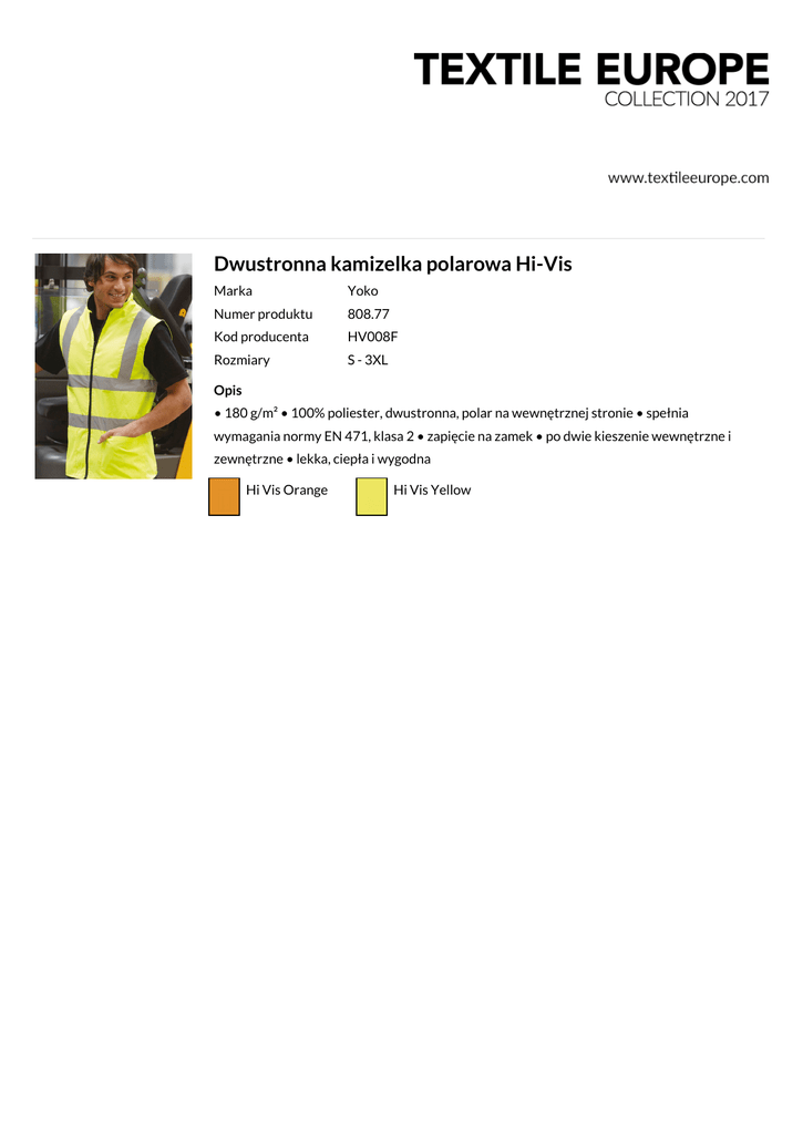 Dwustronna kamizelka polarowa Hi-Vis Marka Yoko Numer produktu 808.77 Kod producenta HV008F Rozmiary S - 3XL Opis • 180 g/m² • 100% poliester, dwustronna, polar na wewnętrznej stronie • spełnia wymagania normy EN 471, klasa 2 • zapięcie na zamek • po dwie kieszenie wewnętrzne i zewnętrzne • lekka, ciepła i wygodna Hi Vis Orange Hi Vis Yellow