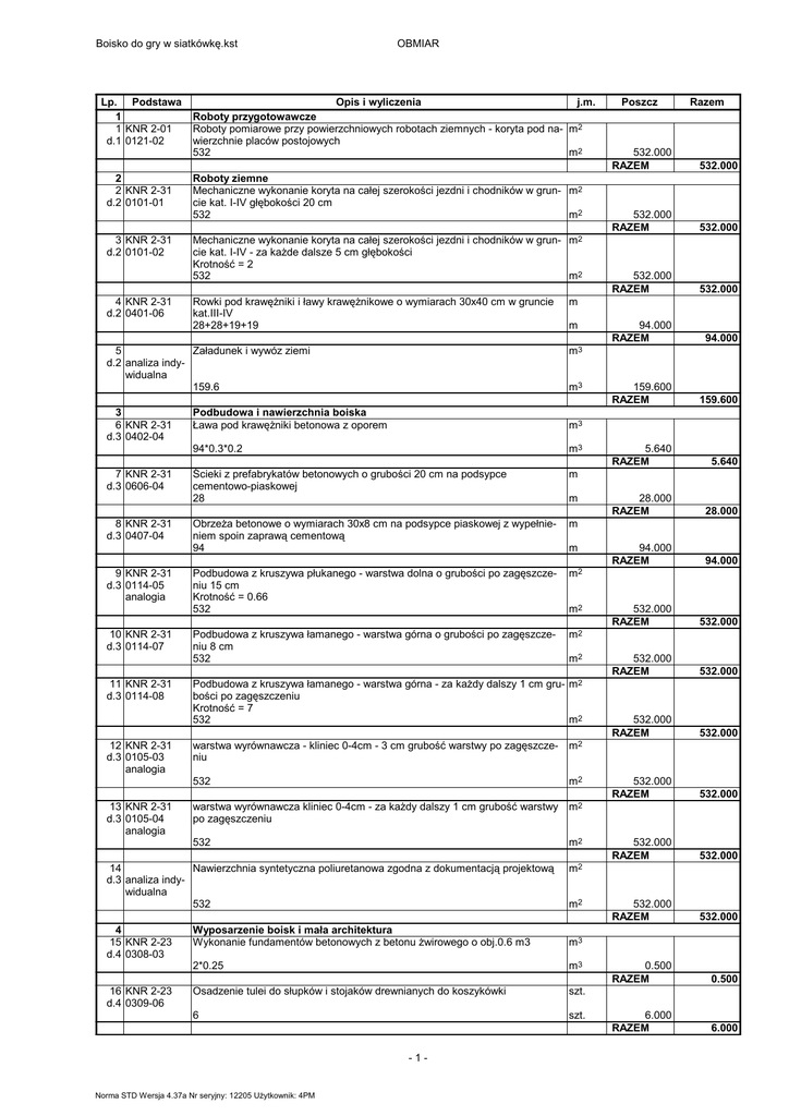 Boisko do gry w siatkówkę.kst Lp. Podstawa 1 1 KNR 2-01 d.1 0121-02 2 2 KNR 2-31 d.2 0101-01 3 KNR 2-31 d.2 0101-02 4 KNR 2-31 d.2 0401-06 OBMIAR Opis i wyliczenia j.m. Roboty przygotowawcze Roboty pomiarowe przy powierzchniowych robotach ziemnych - koryta pod na- m2 wierzchnie placów postojowych 532 m2 Roboty ziemne Mechaniczne wykonanie koryta na całej szerokości jezdni i chodników w grun- m2 cie kat. I-IV głębokości 20 cm 532 m2 Mechaniczne wykonanie koryta na całej szerokości jezdni i chodników w grun- m2 cie kat. I-IV - za każde dalsze 5 cm głębokości Krotność = 2 532 m2 Rowki pod krawężniki i ławy krawężnikowe o wymiarach 30x40 cm w gruncie kat.III-IV 28+28+19+19 7 KNR 2-31 d.3 0606-04 8 KNR 2-31 d.3 0407-04 9 KNR 2-31 d.3 0114-05 analogia 10 KNR 2-31 d.3 0114-07 11 KNR 2-31 d.3 0114-08 12 KNR 2-31 d.3 0105-03 analogia m3 94*0.3*0.2 m3 Ścieki z prefabrykatów betonowych o grubości 20 cm na podsypce cementowo-piaskowej 28 m Obrzeża betonowe o wymiarach 30x8 cm na podsypce piaskowej z wypełnieniem spoin zaprawą cementową 94 m Podbudowa z kruszywa płukanego - warstwa dolna o grubości po zagęszczeniu 15 cm Krotność = 0.66 532 m2 Podbudowa z kruszywa łamanego - warstwa górna o grubości po zagęszczeniu 8 cm 532 m2 m m m2 m2 Podbudowa z kruszywa łamanego - warstwa górna - za każdy dalszy 1 cm gru- m2 bości po zagęszczeniu Krotność = 7 532 m2 532.000 532.000 RAZEM 532.000 532.000 RAZEM 532.000 94.000 RAZEM 94.000 159.600 RAZEM 159.600 5.640 RAZEM 5.640 28.000 RAZEM 28.000 94.000 RAZEM 94.000 532.000 RAZEM 532.000 532.000 RAZEM 532.000 532.000 RAZEM 532.000 532.000 RAZEM 532.000 532.000 RAZEM 532.000 532.000 RAZEM 532.000 0.500 RAZEM 0.500 6.000 RAZEM 6.000 warstwa wyrównawcza - kliniec 0-4cm - 3 cm grubość warstwy po zagęszcze- m2 niu m2 warstwa wyrównawcza kliniec 0-4cm - za każdy dalszy 1 cm grubość warstwy m2 po zagęszczeniu m2 14 Nawierzchnia syntetyczna poliuretanowa zgodna z dokumentacją projektową d.3 analiza indywidualna 532 16 KNR 2-23 d.4 0309-06 m Podbudowa i nawierzchnia boiska Ława pod krawężniki betonowa z oporem 532 4 15 KNR 2-23 d.4 0308-03 532.000 RAZEM m m3 532 13 KNR 2-31 d.3 0105-04 analogia Razem m3 5 Załadunek i wywóz ziemi d.2 analiza indywidualna 159.6 3 6 KNR 2-31 d.3 0402-04 Poszcz m2 m2 Wyposarzenie boisk i mała architektura Wykonanie fundamentów betonowych z betonu żwirowego o obj.0.6 m3 m3 2*0.25 m3 Osadzenie tulei do słupków i stojaków drewnianych do koszykówki szt. 6 szt. -1- Norma STD Wersja 4.37a Nr seryjny: 12205 Użytkownik: 4PM Boisko do gry w siatkówkę.kst Lp. Podstawa 17 KNR 2-23 d.4 0310-04 18 KNR 2-23 d.4 0309-02 19 KNR 2-23 d.4 0310-02 OBMIAR Opis i wyliczenia Ustawienie w gotowych otworach stojaków metalowych do koszykówki - kosz typu gęsia szyja wyposarzony w tablice epoksydowe o wym. 180x105 z obręczą ocynkowaną i siatką tradycyjną, wysięg ramienia 1,6m 6 j.m. szt. Osadzenie tulei do słupków i stojaków siatkówki i tenisa szt. 2 szt. Ustawienie w gotowych otworach stojaków do siatkówki i kometki szt. 2 szt. -2- Norma STD Wersja 4.37a Nr seryjny: 12205 Użytkownik: 4PM szt. Poszcz Razem 6.000 RAZEM 6.000 2.000 RAZEM 2.000 2.000 RAZEM 2.000