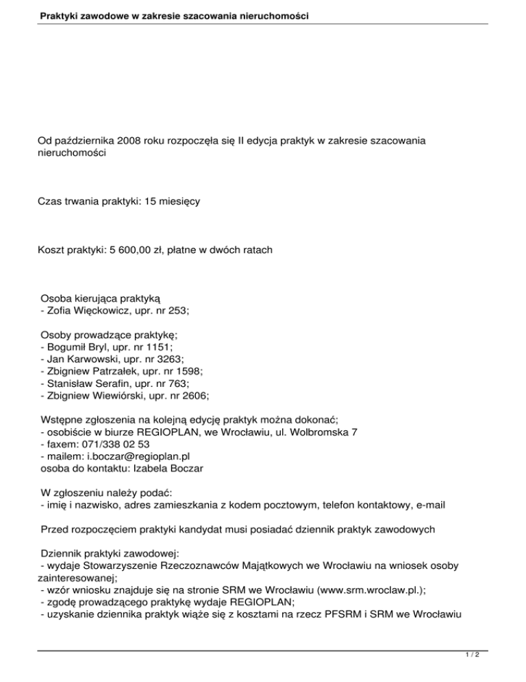 Praktyki zawodowe w zakresie szacowania nieruchomości Od października 2008 roku rozpoczęła się II edycja praktyk w zakresie szacowania nieruchomości Czas trwania praktyki: 15 miesięcy Koszt praktyki: 5 600,00 zł, płatne w dwóch ratach Osoba kierująca praktyką - Zofia Więckowicz, upr. nr 253; Osoby prowadzące praktykę; - Bogumił Bryl, upr. nr 1151; - Jan Karwowski, upr. nr 3263; - Zbigniew Patrzałek, upr. nr 1598; - Stanisław Serafin, upr. nr 763; - Zbigniew Wiewiórski, upr. nr 2606; Wstępne zgłoszenia na kolejną edycję praktyk można dokonać; - osobiście w biurze REGIOPLAN, we Wrocławiu, ul. Wolbromska 7 - faxem: 071/338 02 53 - mailem: [email protected] osoba do kontaktu: Izabela Boczar W zgłoszeniu należy podać: - imię i nazwisko, adres zamieszkania z kodem pocztowym, telefon kontaktowy, e-mail Przed rozpoczęciem praktyki kandydat musi posiadać dziennik praktyk zawodowych Dziennik praktyki zawodowej: - wydaje Stowarzyszenie Rzeczoznawców Majątkowych we Wrocławiu na wniosek osoby zainteresowanej; - wzór wniosku znajduje się na stronie SRM we Wrocławiu (www.srm.wroclaw.pl.); - zgodę prowadzącego praktykę wydaje REGIOPLAN; - uzyskanie dziennika praktyk wiąże się z kosztami na rzecz PFSRM i SRM we Wrocławiu 1/2 Praktyki zawodowe w zakresie szacowania nieruchomości (informacje na stronie SRM we Wrocławiu: www.srm.wroclaw.pl.) 2/2