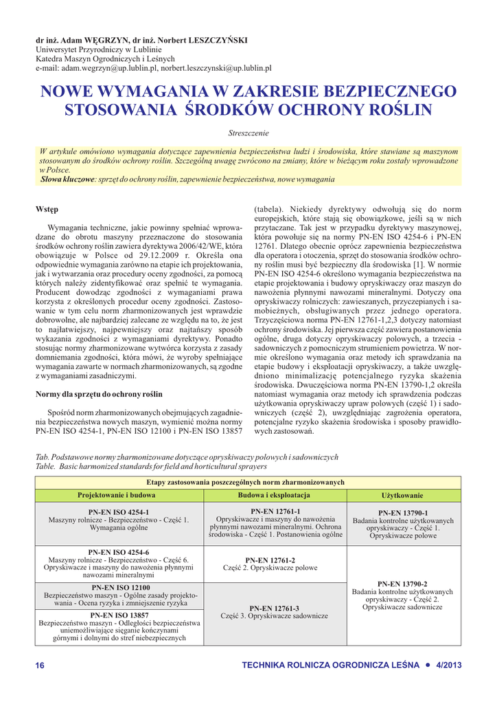 dr in¿. Adam WÊGRZYN, dr in¿. Norbert LESZCZYÑSKI Uniwersytet Przyrodniczy w Lublinie Katedra Maszyn Ogrodniczych i Leœnych e-mail: [email protected], [email protected] NOWE WYMAGANIA W ZAKRESIE BEZPIECZNEGO STOSOWANIA ŒRODKÓW OCHRONY ROŒLIN Streszczenie W artykule omówiono wymagania dotycz¹ce zapewnienia bezpieczeñstwa ludzi i œrodowiska, które stawiane s¹ maszynom stosowanym do œrodków ochrony roœlin. Szczególn¹ uwagê zwrócono na zmiany, które w bie¿¹cym roku zosta³y wprowadzone w Polsce. S³owa kluczowe: sprzêt do ochrony roœlin, zapewnienie bezpieczeñstwa, nowe wymagania Wstêp Wymagania techniczne, jakie powinny spe³niaæ wprowadzane do obrotu maszyny przeznaczone do stosowania œrodków ochrony roœlin zawiera dyrektywa 2006/42/WE, która obowi¹zuje w Polsce od 29.12.2009 r. Okreœla ona odpowiednie wymagania zarówno na etapie ich projektowania, jak i wytwarzania oraz procedury oceny zgodnoœci, za pomoc¹ których nale¿y zidentyfikowaæ oraz spe³niæ te wymagania. Producent dowodz¹c zgodnoœci z wymaganiami prawa korzysta z okreœlonych procedur oceny zgodnoœci. Zastosowanie w tym celu norm zharmonizowanych jest wprawdzie dobrowolne, ale najbardziej zalecane ze wzglêdu na to, ¿e jest to naj³atwiejszy, najpewniejszy oraz najtañszy sposób wykazania zgodnoœci z wymaganiami dyrektywy. Ponadto stosuj¹c normy zharmonizowane wytwórca korzysta z zasady domniemania zgodnoœci, która mówi, ¿e wyroby spe³niaj¹ce wymagania zawarte w normach zharmonizowanych, s¹ zgodne z wymaganiami zasadniczymi. Normy dla sprzêtu do ochrony roœlin Spoœród norm zharmonizowanych obejmuj¹cych zagadnienia bezpieczeñstwa nowych maszyn, wymieniæ mo¿na normy PN-EN ISO 4254-1, PN-EN ISO 12100 i PN-EN ISO 13857 (tabela). Niekiedy dyrektywy odwo³uj¹ siê do norm europejskich, które staj¹ siê obowi¹zkowe, jeœli s¹ w nich przytaczane. Tak jest w przypadku dyrektywy maszynowej, która powo³uje siê na normy PN-EN ISO 4254-6 i PN-EN 12761. Dlatego obecnie oprócz zapewnienia bezpieczeñstwa dla operatora i otoczenia, sprzêt do stosowania œrodków ochrony roœlin musi byæ bezpieczny dla œrodowiska [1]. W normie PN-EN ISO 4254-6 okreœlono wymagania bezpieczeñstwa na etapie projektowania i budowy opryskiwaczy oraz maszyn do nawo¿enia p³ynnymi nawozami mineralnymi. Dotyczy ona opryskiwaczy rolniczych: zawieszanych, przyczepianych i samobie¿nych, obs³ugiwanych przez jednego operatora. Trzyczêœciowa norma PN-EN 12761-1,2,3 dotyczy natomiast ochrony œrodowiska. Jej pierwsza czêœæ zawiera postanowienia ogólne, druga dotyczy opryskiwaczy polowych, a trzecia sadowniczych z pomocniczym strumieniem powietrza. W normie okreœlono wymagania oraz metody ich sprawdzania na etapie budowy i eksploatacji opryskiwaczy, a tak¿e uwzglêdniono minimalizacjê potencjalnego ryzyka ska¿enia œrodowiska. Dwuczêœciowa norma PN-EN 13790-1,2 okreœla natomiast wymagania oraz metody ich sprawdzenia podczas u¿ytkowania opryskiwaczy upraw polowych (czêœæ 1) i sadowniczych (czêœæ 2), uwzglêdniaj¹c zagro¿enia operatora, potencjalne ryzyko ska¿enia œrodowiska i sposoby prawid³owych zastosowañ. Tab. Podstawowe normy zharmonizowane dotycz¹ce opryskiwaczy polowych i sadowniczych Table. Basic harmonized standards for field and horticultural sprayers Etapy zastosowania poszczególnych norm zharmonizowanych Projektowanie i budowa PN-EN ISO 4254-1 Maszyny rolnicze - Bezpieczeñstwo - Czêœæ 1. Wymagania ogólne PN-EN ISO 4254-6 Maszyny rolnicze - Bezpieczeñstwo - Czêœæ 6. Opryskiwacze i maszyny do nawo¿enia p³ynnymi nawozami mineralnymi PN-EN ISO 12100 Bezpieczeñstwo maszyn - Ogólne zasady projektowania - Ocena ryzyka i zmniejszenie ryzyka PN-EN ISO 13857 Bezpieczeñstwo maszyn - Odleg³oœci bezpieczeñstwa uniemo¿liwiaj¹ce siêganie koñczynami górnymi i dolnymi do stref niebezpiecznych 16 Budowa i eksploatacja U¿ytkowanie PN-EN 12761-1 Opryskiwacze i maszyny do nawo¿enia p³ynnymi nawozami mineralnymi. Ochrona œrodowiska - Czêœæ 1. Postanowienia ogólne PN-EN 13790-1 Badania kontrolne u¿ytkowanych opryskiwaczy - Czêœæ 1. Opryskiwacze polowe PN-EN 12761-2 Czêœæ 2. Opryskiwacze polowe PN-EN 12761-3 Czêœæ 3. Opryskiwacze sadownicze PN-EN 13790-2 Badania kontrolne u¿ytkowanych opryskiwaczy - Czêœæ 2. Opryskiwacze sadownicze TECHNIKA ROLNICZA OGRODNICZA LEŒNA 4/2013 Nowe ustawy i rozporz¹dzenia W dniu 27 kwietnia 2013 r. wesz³a w ¿ycie nowa ustawa [6] o œrodkach ochrony roœlin (Dz. U. poz. 455), która wdra¿a postanowienia dyrektywy Parlamentu Europejskiego i Rady 2009/128/WE z dnia 21.10.2009 r. ustanawiaj¹cej ramy wspólnotowego dzia³ania na rzecz zrównowa¿onego stosowania pestycydów oraz normuje przepisy w zakresie obrotu œrodkami ochrony roœlin. Rozporz¹dzenie dotycz¹ce wprowadzania do obrotu œrodków ochrony roœlin nr 1107/2009/WE wesz³o w ¿ycie w po³owie czerwca 2011 r. Obowi¹zuje [2] ono wszystkich obywateli UE, tzn. ¿e jego zapisy musz¹ byæ przestrzegane w takim samym brzmieniu we wszystkich krajach Wspólnoty. Poza tym jest ono nadrzêdne nad przepisami krajowymi. Tym te¿ ró¿ni siê od dyrektywy, która obowi¹zuje rz¹dy poszczególnych pañstw UE maj¹ce za zadanie dostosowaæ przepisy krajowe do propozycji zamieszczonych w unijnej dyrektywie. Ustawa o œrodkach ochrony roœlin wprowadza nowe zasady ich wprowadzania do obrotu oraz stosowania, w tym tak¿e potwierdzania sprawnoœci technicznej sprzêtu przeznaczonego do stosowania œrodków ochrony roœlin oraz szkoleñ w zakresie œrodków ochrony roœlin i gromadzenia informacji o zatruciach œrodkami ochrony roœlin. Zawiera równie¿ przepisy, które od 1 stycznia 2014 r. na³o¿¹ na profesjonalnych u¿ytkowników œrodków ochrony roœlin obowi¹zek przestrzegania zasad integrowanej ochrony roœlin. W Polsce, zgodnie z art. 76 obowi¹zuj¹cej ju¿ wczeœniej ustawy [5] o ochronie roœlin (Dz. U. z 2008 r., nr 133, poz. 849, z póŸn. zm.), 