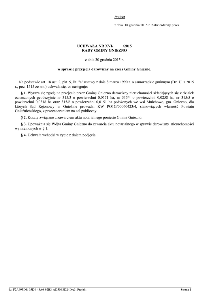 Projekt z dnia 18 grudnia 2015 r. Zatwierdzony przez ......................... UCHWAŁA NR XVI/ /2015 RADY GMINY GNIEZNO z dnia 30 grudnia 2015 r. w sprawie przyjęcia darowizny na rzecz Gminy Gniezno. Na podstawie art. 18 ust. 2, pkt. 9, lit. "a" ustawy z dnia 8 marca 1990 r. o samorządzie gminnym (Dz. U. z 2015 r., poz. 1515 ze zm.) uchwala się, co następuje: § 1. Wyraża się zgodę na przejęcie przez Gminę Gniezno darowizny nieruchomości składających się z działek oznaczonych geodezyjnie nr 315/3 o powierzchni 0,0571 ha, nr 315/4 o powierzchni 0,0258 ha, nr 315/5 o powierzchni 0,0318 ha oraz 315/6 o powierzchni 0,0151 ha położonych we wsi Mnichowo, gm. Gniezno, dla których Sąd Rejonowy w Gnieźnie prowadzi KW PO1G/00060423/4, stanowiących własność Powiatu Gnieźnieńskiego, z przeznaczeniem na cel publiczny. § 2. Koszty związane z zawarciem aktu notarialnego poniesie Gmina Gniezno. § 3. Upoważnia się Wójta Gminy Gniezno do zawarcia aktu notarialnego w sprawie darowizny nieruchomości wymienionych w § 1. § 4. Uchwała wchodzi w życie z dniem podjęcia. Id: F2A693DB-05D4-43A6-92B3-AD50E8D24DA3. Projekt Strona 1 UZASADNIENIE Zgodnie z art. 18 ust. 2, pkt. 9, lit. "a" ustawy z dnia 8 marca 1990 r. o samorządzie gminnym (Dz. U. z 2015 r., poz. 1515) do wyłącznej właściwości rady gminy należy m.in. podejmowanie uchwał w sprawach majątkowych gminy dotyczących nabycia nieruchomości. Przyjęcie na rzecz Gminy Gniezno darowizny nieruchomości składających się z działek 315/3, 315/4, 315/5 i 315/6 odbywa się z przeznaczeniem na cel publiczny. Na działce 315/5 znajduje się budynek stanowiący siedzibę OSP w Mnichowie, który stanowi własność Gminy Gniezno. Przedmiotowy budynek jest wykorzystywany od kilkunastu lat dla potrzeb wiejskiej OSP, w szczególności do garażowania samochodu przeciwpożarowego, sprzętu przeciwpożarowego, wyposażenia strażackiego itp. Działki nr 315/4 i 315/6 stanowią wewnetrzne drogi dojazdowe do przedmiotowej strażnicy i po nieodpłatnym przekazaniu ich na własność Gminy Gniezno, drogi te zaliczane byłyby do kategorii dróg gminnych w połączeniu z istniejącą drogą gminną, stanowiącą działkę nr 133. Natomist działka 315/3 jest niezbędna dla potrzeb OSP w Mnichowie na organizowanie ćwiczeń przeciwpożarowych, w szczególności ćwiczeń drużyn młodzieżowych OSP oraz organizowanie uroczystości strażackich. Podjęcie niniejszej uchwały jest w pełni celowe i uzasadnione. Id: F2A693DB-05D4-43A6-92B3-AD50E8D24DA3. Projekt Strona 1