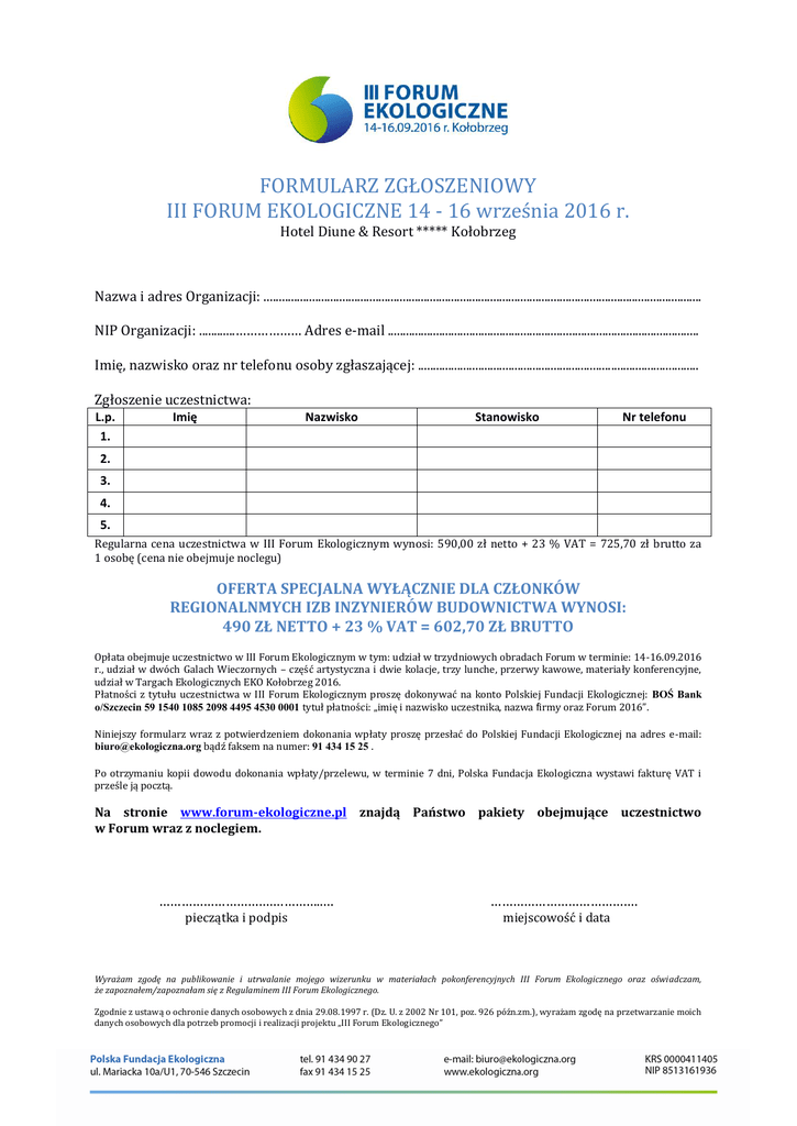 FORMULARZ ZGŁOSZENIOWY III FORUM EKOLOGICZNE 14 - 16 września 2016 r. Hotel Diune & Resort ***** Kołobrzeg Nazwa i adres Organizacji: ................................................................................................................................................. NIP Organizacji: ............……………… Adres e-mail ....................................................................................................... Imię, nazwisko oraz nr telefonu osoby zgłaszającej: ............................................................................................. Zgłoszenie uczestnictwa: L.p. 1. Imię Nazwisko Stanowisko Nr telefonu 2. 3. 4. 5. Regularna cena uczestnictwa w III Forum Ekologicznym wynosi: 590,00 zł netto + 23 % VAT = 725,70 zł brutto za 1 osobę (cena nie obejmuje noclegu) OFERTA SPECJALNA WYŁĄCZNIE DLA CZŁONKÓW REGIONALNMYCH IZB INZYNIERÓW BUDOWNICTWA WYNOSI: 490 ZŁ NETTO + 23 % VAT = 602,70 ZŁ BRUTTO Opłata obejmuje uczestnictwo w III Forum Ekologicznym w tym: udział w trzydniowych obradach Forum w terminie: 14-16.09.2016 r., udział w dwóch Galach Wieczornych – część artystyczna i dwie kolacje, trzy lunche, przerwy kawowe, materiały konferencyjne, udział w Targach Ekologicznych EKO Kołobrzeg 2016. Płatności z tytułu uczestnictwa w III Forum Ekologicznym proszę dokonywać na konto Polskiej Fundacji Ekologicznej: BOŚ Bank o/Szczecin 59 1540 1085 2098 4495 4530 0001 tytuł płatności: „imię i nazwisko uczestnika, nazwa firmy oraz Forum 2016”. Niniejszy formularz wraz z potwierdzeniem dokonania wpłaty proszę przesłać do Polskiej Fundacji Ekologicznej na adres e-mail: [email protected] bądź faksem na numer: 91 434 15 25 . Po otrzymaniu kopii dowodu dokonania wpłaty/przelewu, w terminie 7 dni, Polska Fundacja Ekologiczna wystawi fakturę VAT i prześle ją pocztą. Na stronie www.forum-ekologiczne.pl znajdą Państwo pakiety obejmujące uczestnictwo w Forum wraz z noclegiem. ………………………….…………..… pieczątka i podpis …………………………………. miejscowość i data Wyrażam zgodę na publikowanie i utrwalanie mojego wizerunku w materiałach pokonferencyjnych III Forum Ekologicznego oraz oświadczam, że zapoznałem/zapoznałam się z Regulaminem III Forum Ekologicznego. Zgodnie z ustawą o ochronie danych osobowych z dnia 29.08.1997 r. (Dz. U. z 2002 Nr 101, poz. 926 późn.zm.), wyrażam zgodę na przetwarzanie moich danych osobowych dla potrzeb promocji i realizacji projektu „III Forum Ekologicznego”