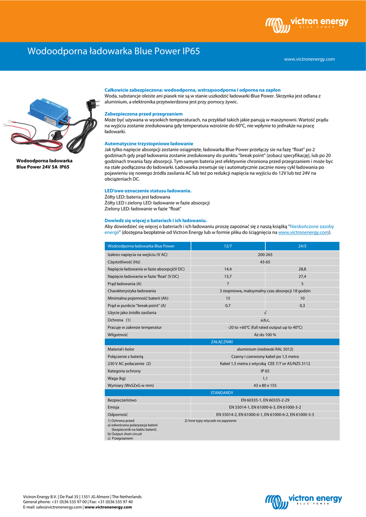 Wodoodporna ładowarka Blue Power IP65 www.victronenergy.com Całkowicie zabezpieczona: wodoodporna, wstrząsoodporna i odporna na zapłon Woda, substancje oleiste ani piasek nie są w stanie uszkodzić ładowarki Blue Power. Skrzynka jest odlana z aluminium, a elektronika przytwierdzona jest przy pomocy żywic. Zabezpieczona przed przegrzaniem Może być używana w wysokich temperaturach, na przykład takich jakie panują w maszynowni. Wartość prądu na wyjściu zostanie zredukowana gdy temperatura wzrośnie do 60°C, nie wpłynie to jednakże na pracę ładowarki. Wodoodporna ładowarka Blue Power 24V 5A IP65 Automatyczne trzystopniowe ładowanie Jak tylko napięcie absorpcji zostanie osiągnięte, ładowarka Blue Power przełączy sie na fazę “float” po 2 godzinach gdy prąd ładowania zostanie zredukowany do punktu “break point” (zobacz specyfikację), lub po 20 godzinach trwania fazy absorpcji. Tym samym bateria jest efektywnie chroniona przed przegrzaniem i może byc na stałe podłączona do ładowarki. Ładowarka zresetuje się i automatycznie zacznie nowy cykl ładowania po pojawieniu się nowego źródła zasilania AC lub też po redukcji napięcia na wyjściu do 12V lub też 24V na obciążeniach DC. LED'owe oznaczenie statusu ładowania. Żółty LED: bateria jest ładowana Żółty LED i zielony LED: ładowanie w fazie absorpcji Zielony LED: ładowanie w fazie “float” Dowiedz się więcej o bateriach i ich ładowaniu. Aby dowiedzieć się więcej o bateriach i ich ładowaniu proszę zapoznać się z naszą książką “Nieskończone zasoby energii” (dostępna bezpłatnie od Victron Energy lub w formie pliku do ściągnięcia na www.victronenergy.com). Wodoodporna ładowarka Blue Power 12/7 Izakres napięcia na wejściu (V AC) 24/5 200-265 Cżęstotliwość (Hz) 45-65 Napięcie ładowania w fazie absorpcji(V DC) 14,4 28,8 Napięcie ładowania w fazie 'float' (V DC) 13,7 27,4 7 5 Prąd ładowania (A) Charakterystyka ładowania 3 stopniowa, maksymalny czas absorpcji 18 godzin Minimalna pojemność baterii (Ah) 15 10 Prąd w punkcie “break point” (A) 0,7 0,3 Użycie jako źródło zasilania √ Ochrona (1) Pracuje w zakresie temperatur a,b,c, -20 to +60°C (full rated output up to 40°C) Wilgotność Aż do 100 % ZAŁĄCZNIKI Materiał i kolor Połączenie z baterią 230 V AC-połaczenie (2) aluminium (niebieski RAL 5012) Czarny i czerwiony kabel po 1,5 metra Kabel 1,5 metra z wtyczką CEE 7/7 or AS/NZS 3112 Kategoria ochrony IP 65 Waga (kg) 1,1 Wymiary (WxSZxG w mm) 43 x 80 x 155 STANDARDY Bezpieczeństwo Emisja Odporność 1) Ochrona przed a) odwrócona polaryzacja baterii (bezpiecznik na kablu baterii) b) Output short circuit c) Przegrzaniem Victron Energy B.V. | De Paal 35 | 1351 JG Almere | The Netherlands General phone: +31 (0)36 535 97 00 | Fax: +31 (0)36 535 97 40 E-mail: [email protected] | www.victronenergy.com EN 60335-1, EN 60335-2-29 EN 55014-1, EN 61000-6-3, EN 61000-3-2 EN 55014-2, EN 61000-6-1, EN 61000-6-2, EN 61000-3-3 2) Inne typy wtyczek na zapytanie