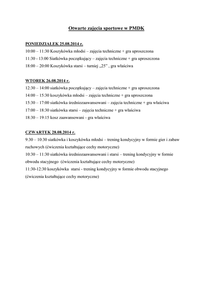 Otwarte zajęcia sportowe w PMDK PONIEDZIAŁEK 25.08.2014 r. 10:00 – 11:30 Koszykówka młodsi – zajęcia techniczne + gra uproszczona 11:30 - 13:00 Siatkówka początkujący – zajęcia techniczne + gra uproszczona 18:00 – 20:00 Koszykówka starsi – turniej „25” , gra właściwa WTOREK 26.08.2014 r. 12:30 – 14:00 siatkówka początkujący – zajęcia techniczne + gra uproszczona 14:00 – 15:30 koszykówka młodsi – zajęcia techniczne + gra uproszczona 15:30 – 17:00 siatkówka średniozaawansowani – zajęcia techniczne + gra właściwa 17:00 – 18:30 siatkówka starsi – zajęcia techniczne + gra właściwa 18:30 – 19:15 kosz zaawansowani - gra właściwa CZWARTEK 28.08.2014 r. 9:30 – 10:30 siatkówka i koszykówka młodsi – trening kondycyjny w formie gier i zabaw ruchowych (ćwiczenia kształtujące cechy motoryczne) 10:30 – 11:30 siatkówka średniozaawansowani i starsi – trening kondycyjny w formie obwodu stacyjnego (ćwiczenia kształtujące cechy motoryczne) 11:30-12:30 koszykówka starsi - trening kondycyjny w formie obwodu stacyjnego (ćwiczenia kształtujące cechy motoryczne)
