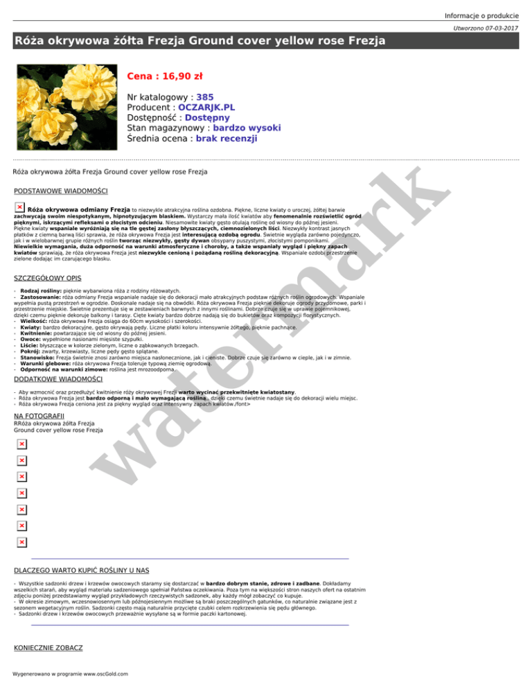 Informacje o produkcie Utworzono 07-03-2017 Róża okrywowa żółta Frezja Ground cover yellow rose Frezja Cena : 16,90 zł Nr katalogowy : 385 Producent : OCZARJK.PL Dostępność : Dostępny Stan magazynowy : bardzo wysoki Średnia ocena : brak recenzji PODSTAWOWE WIADOMOŚCI er m ar k Róża okrywowa żółta Frezja Ground cover yellow rose Frezja Róża okrywowa odmiany Frezja to niezwykle atrakcyjna roślina ozdobna. Piękne, liczne kwiaty o uroczej, żółtej barwie zachwycają swoim niespotykanym, hipnotyzującym blaskiem. Wystarczy mała ilość kwiatów aby fenomenalnie rozświetlić ogród pięknymi, iskrzącymi refleksami o złocistym odcieniu. Niesamowite kwiaty gęsto otulają roślinę od wiosny do późnej jesieni. Piękne kwiaty wspaniale wyróżniają się na tle gęstej zasłony błyszczących, ciemnozielonych liści. Niezwykły kontrast jasnych płatków z ciemną barwą liści sprawia, że róża okrywowa Frezja jest interesującą ozdobą ogrodu. Świetnie wygląda zarówno pojedynczo, jak i w wielobarwnej grupie różnych roślin tworząc niezwykły, gęsty dywan obsypany puszystymi, złocistymi pomponikami. Niewielkie wymagania, duża odporność na warunki atmosferyczne i choroby, a także wspaniały wygląd i piękny zapach kwiatów sprawiają, że róża okrywowa Frezja jest niezwykle cenioną i pożądaną rośliną dekoracyjną. Wspaniale ozdobi przestrzenie zielone dodając im czarującego blasku. SZCZEGÓŁOWY OPIS - Rodzaj rośliny: pięknie wybarwiona róża z rodziny różowatych. - Zastosowanie: róża odmiany Frezja wspaniale nadaje się do dekoracji mało atrakcyjnych podstaw różnych roślin ogrodowych. Wspaniale wypełnia pustą przestrzeń w ogrodzie. Doskonale nadaje się na obwódki. Róża okrywowa Frezja pięknie dekoruje ogrody przydomowe, parki i przestrzenie miejskie. Świetnie prezentuje się w zestawieniach barwnych z innymi roślinami. Dobrze czuje się w uprawie pojemnikowej, dzięki czemu pięknie dekoruje balkony i tarasy. Cięte kwiaty bardzo dobrze nadają się do bukietów oraz kompozycji florystycznych. - Wielkość: róża okrywowa Frezja osiąga do 60cm wysokości i szerokości. - Kwiaty: bardzo dekoracyjne, gęsto okrywają pędy. Liczne płatki koloru intensywnie żółtego, pięknie pachnące. - Kwitnienie: powtarzające się od wiosny do późnej jesieni. - Owoce: wypełnione nasionami mięsiste szypułki. - Liście: błyszczące w kolorze zielonym, liczne o ząbkowanych brzegach. - Pokrój: zwarty, krzewiasty, liczne pędy gęsto splątane. - Stanowisko: Frezja świetnie znosi zarówno miejsca nasłonecznione, jak i cieniste. Dobrze czuje się zarówno w cieple, jak i w zimnie. - Warunki glebowe: róża okrywowa Frezja toleruje typową ziemię ogrodową. - Odporność na warunki zimowe: roślina jest mrozoodporna. DODATKOWE WIADOMOŚCI NA FOTOGRAFII at - Aby wzmocnić oraz przedłużyć kwitnienie róży okrywowej Frezji warto wycinać przekwitnięte kwiatostany. - Róża okrywowa Frezja jest bardzo odporną i mało wymagającą rośliną,, dzięki czemu świetnie nadaje się do dekoracji wielu miejsc. - Róża okrywowa Frezja ceniona jest za piękny wygląd oraz intensywny zapach kwiatów./font> w RRóża okrywowa żółta Frezja Ground cover yellow rose Frezja DLACZEGO WARTO KUPIĆ ROŚLINY U NAS - Wszystkie sadzonki drzew i krzewów owocowych staramy się dostarczać w bardzo dobrym stanie, zdrowe i zadbane. Dokładamy wszelkich starań, aby wygląd materiału sadzeniowego spełniał Państwa oczekiwania. Poza tym na większości stron naszych ofert na ostatnim zdjęciu poniżej przedstawiamy wygląd przykładowych rzeczywistych sadzonek, aby każdy mógł zobaczyć co kupuje. - W okresie zimowym, wczesnowiosennym lub późnojesiennym możliwe są braki poszczególnych gatunków, co naturalnie związane jest z sezonem wegetacyjnym roślin. Sadzonki często mają naturalnie przycięte czubki celem rozkrzewienia się pędu głównego. - Sadzonki drzew i krzewów owocowych przeważnie wysyłane są w formie paczki kartonowej. KONIECZNIE ZOBACZ Wygenerowano w programie www.oscGold.com er m ar k at w