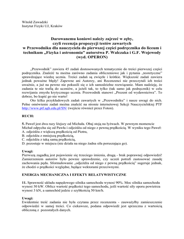 Witold Zawadzki Instytut Fizyki UJ, Kraków Darowanemu koniowi należy zajrzeć w zęby, czyli recenzja propozycji testów zawartych w Przewodniku dla nauczyciela do pierwszej części podręcznika do liceum i technikum „Fizyka i astronomia” autorstwa P. Walczaka i G.F. Wojewody (wyd. OPERON) „Przewodnik” zawiera 45 zadań dostosowanych tematycznie do treści pierwszej części podręcznika. Znaleźć tu można zarówno zadania obliczeniowe jak i pytania „teoretyczne” sprawdzające wiedzę ucznia. Treści zadań są zwięzłe i krótkie. Większość zadań zawiera jednak poważne błędy! Zapewne ani Autorzy, ani Recenzenci nie przeczytali ich treści uważnie, a już na pewno nie pokusili się o ich samodzielne rozwiązanie. Mam nadzieję, że zadania te nie trafią do uczniów, a jeżeli tak, to tylko (tak samo jak podręcznik) w celu rozwijania zmysłu krytycznego ucznia. Przewodnik stanowi „Prezent od wydawnictwa”. To dobrze, bo kupić go nie warto! Oto kilka przykładowych zadań zawartych w „Przewodniku” i nasze uwagi do nich. Pełne omówienie zadań można znaleźć na stronie internetowej Sekcji Nauczycielskiej PTF http://www.ptf.agh.edu.pl/SN/ (wejście również przez Foton). RUCH: 5. Paweł jest dwa razy lżejszy od Michała. Obaj stoją na łyżwach. W pewnym momencie Michał odpycha się od Pawła i odjeżdża od niego z pewną prędkością. W wyniku tego Paweł: A. odjeżdża z większą prędkością od Piotra, B. odjeżdża z mniejszą prędkością, C. odjeżdża z taką samą prędkością, D. pozostaje w miejscu (nie działa na niego żadna siła poruszająca go). Uwagi: Pierwszą zagadką jest pojawienie się trzeciego imienia, drugą - brak poprawnej odpowiedzi! Zamierzeniem autorów było pewnie sprawdzenie, czy uczeń potrafi zastosować zasadę zachowania pędu. Sformułowanie „odjeżdża od niego z pewną prędkością” sugeruje jednak, że chodzi o prędkości względne, będące wektorami przeciwnymi. ENERGIA MECHANICZNA I EFEKTY RELATYWISTYCZNE 11. Sprawność układu napędowego silnika samochodu wynosi 90%. Moc silnika samochodu wynosi 50 kW. Oblicz wartość prędkości tego samochodu, jeśli wartość siły oporu powietrza wynosi 3 kN, a samochód jedzie z szybkością 50 km/h. Uwagi: Ewidentnie treść zadania nie była czytana przez recenzenta - zauważyłby zamieszczenie odpowiedzi w samej treści. Co ciekawsze, podana odpowiedź jest sprzeczna z wartością obliczoną z pozostałych danych. ENERGIA MECHANICZNA I EFEKTY RELATYWISTYCZNE: 1. W jednym z podanych przykładów NIE jest wykonywana praca mechaniczna. Wskaż, który to przykład. A. Kot Mruczek wchodzi po drabinie na dach. B. Michał przenosi siatkę z zakupami ze sklepu do samochodu. C. Monika pcha pusty wózek. D. Narciarz jest wciągany przez wyciąg na górkę. Uwagi: W każdym z podanych przykładów jest wykonywana praca mechaniczna. Można domyśleć się, że najbardziej poprawną jest tu odpowiedź B. Jednak uczeń liceum wie o tym, że bohater zadania wykonuje pracę, gdyż pokonuje opory ruchu, może przyspiesza, zwalnia, na pewno zmienia się wysokość jego środka ciężkości. 8. Długość pręta znajdującego się w rakiecie, według obserwatora także będącego w tej rakiecie wynosi 1 m. Rakieta porusza się z prędkością 0,6 c względem Ziemi. Długość tego pręta według obserwatora stojącego na Ziemi wynosi: A. 1,6 m B. 1,2 m C. 1 m D. 0,8 m Uwagi: Autorzy nie podali, jak jest ustawiony pręt względem kierunku prędkości, a od tego zależy wynik.. To są zadania testowe i sytuacja fizyczna powinna być jednoznacznie określona, tak aby uczeń nie musiał domyśleć się, o co chodziło Autorom. ODDZIAŁYWANIA W PRZYRODZIE 2. Gdy jedziesz windą do góry, twój ciężar: A. rośnie, B. maleje, C. nie zmienia się, D. jest równy zero. Uwagi: Prawdopodobnie autorom chodziło o sytuację człowieka stojącego na wadze w ruszającej do góry windzie. Wtedy pytanie powinno być na temat wskazania wagi.