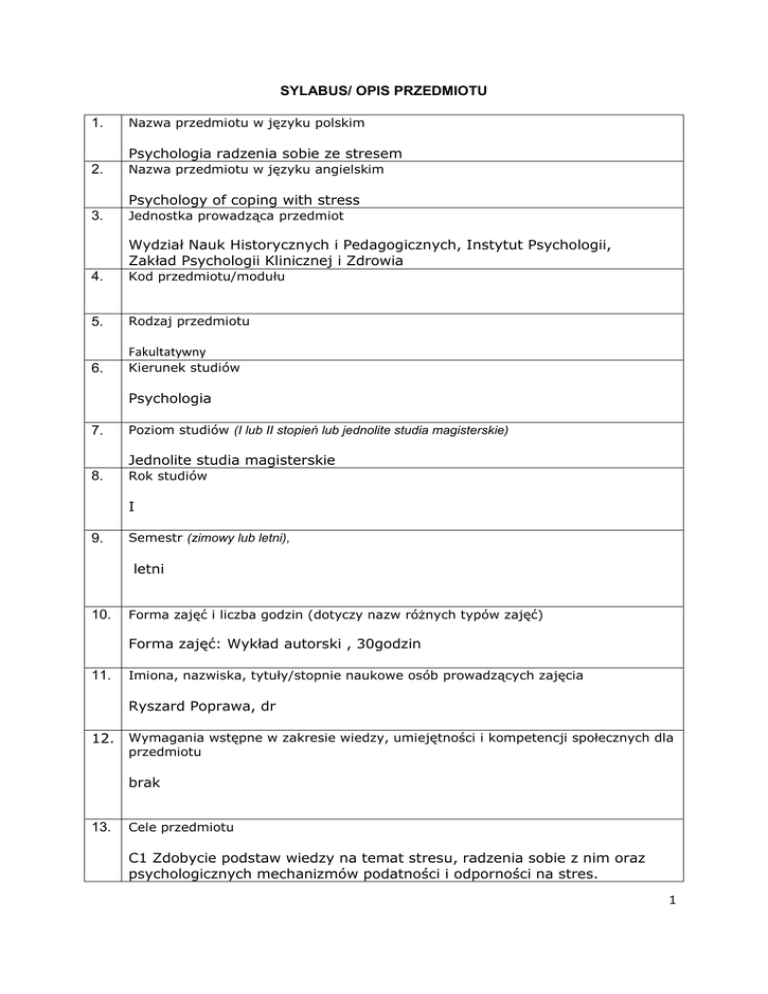 SYLABUS/ OPIS PRZEDMIOTU 1. Nazwa przedmiotu w języku polskim Psychologia radzenia sobie ze stresem 2. Nazwa przedmiotu w języku angielskim Psychology of coping with stress 3. Jednostka prowadząca przedmiot Wydział Nauk Historycznych i Pedagogicznych, Instytut Psychologii, Zakład Psychologii Klinicznej i Zdrowia 4. Kod przedmiotu/modułu 5. Rodzaj przedmiotu Fakultatywny 6. Kierunek studiów Psychologia 7. Poziom studiów (I lub II stopień lub jednolite studia magisterskie) Jednolite studia magisterskie 8. Rok studiów I 9. Semestr (zimowy lub letni), letni 10. Forma zajęć i liczba godzin (dotyczy nazw różnych typów zajęć) Forma zajęć: Wykład autorski , 30godzin 11. Imiona, nazwiska, tytuły/stopnie naukowe osób prowadzących zajęcia Ryszard Poprawa, dr 12. Wymagania wstępne w zakresie wiedzy, umiejętności i kompetencji społecznych dla przedmiotu brak 13. Cele przedmiotu C1 Zdobycie podstaw wiedzy na temat stresu, radzenia sobie z nim oraz psychologicznych mechanizmów podatności i odporności na stres. 1 C2 Zrozumienie złożoności mechanizmów regulujących przeżyciami i zachowaniem człowieka w stresujących wymaganiach życiowych. C3 Zdobycie umiejętności rozpoznawania i adekwatnego nazywania zjawisk związanych ze stresem i procesami zmagania się z nim. C4 Kształtowanie emocjonalnej wrażliwości na problemy życiowe człowieka. 14. Zakładane efekty kształcenia (dla przedmiotu) Symbole kierunkowych efektów kształcenia, np.: K_W01*, K_U05, K_K03 (symbole dla kierunku) EK_W_01 Zna podstawowe teorie psychologiczne i fizjologiczne stresu oraz ważniejsze fakty empiryczne z badań tego obszaru. EK_W_02 Posiada wiedzę na temat głównych problemów i dylematów psychologii stresu i radzenia sobie z nim EK_W_03 Zna konsekwencje stresu i zagrożenia wynikające z deficytów lub defektów umiejętności zmagania się z nim. EK_W_04 Posiada wiedzę na temat psychospołecznych zasobów (potencjałów) radzenia sobie ze stresem. EK_W_05 Ma podstawową wiedzę na temat czynników i mechanizmów podatności na stres. K_W01, K_W02, K_W03, K_W06, K_W07, K_W12 EK_U_01 Umie posługiwać się pojęciami z obszaru psychologii stresu i radzenia sobie z nim. EK_U_02 Rozumie przeżycia i zachowania człowieka w sytuacji stresu i ich transakcyjne uwarunkowania. K_U01, K_U02, K_U03, K_U06 EK_K_01 Potrafi społecznie K_K01, K_K03, K_K06 porozumiewać się i przekazywać wiedzę z obszaru psychologii stresu i radzenia sobie z nim. EK_K_02 Jest wrażliwy na problemy i trudności życiowe człowieka związane z jego zmaganiem się ze stresującymi wymaganiami życiowymi. 15. Treści programowe 2 1. Określenie wymagań i warunków zaliczenia. Czym jest stres i kiedy go doświadczmy? Czy stres to problem niecodzienny czy nieodłączny element życia? Przegląd koncepcji teoretycznych, od fizjologii do psychologii stresu. 2. C.d. przeglądu koncepcji teoretycznych, od fizjologii do psychologii stresu. Stres jako reakcja. Fizjologia stresu. 3. C.d. przegląd koncepcji teoretycznych, od fizjologii do psychologii stresu. Stres jako sytuacja i warunki środowiskowe. Rodzaje stresorów, sytuacji trudnych, krytycznych wydarzeń życiowych. 4. Wpływ stres na dobrostan, przystosowanie i zdrowie. Rola stresu w zaburzeniach i chorobach. Konsekwencje doświadczania stresu: trauma, choroba, zaburzenie. 5. C.d. przegląd koncepcji teoretycznych, od fizjologii do psychologii stresu. Stres jako transakcja. Stres subiektywny czy obiektywny? Rola procesów poznawczych i emocji w stresie i radzeniu sobie. 6. Przebieg procesu stresu i radzenia sobie z nim. 7. Strategie i style radzenia sobie. Rola mechanizmów obronnych w radzeniu sobie ze stresem. Efektywność radzenia sobie. 8. Znaczenie proaktywność w radzeniu sobie, przystosowaniu i jakości życia człowieka. 9. Rola zasobów w doświadczaniu stresu i radzeniu sobie ze stresem. Teoria zachowania zasobów. 10.Odporność na stres i rola zasobów radzenia sobie. Przegląd zasobów radzenia sobie (potencjałów zdrowia). 11.Cd. przeglądu zasobów radzenia sobie (potencjałów zdrowia) i ich funkcji. 12.Rola temperamentu w stresie i radzeniu sobie z nim. 13.Osobowościowa podatność na stres, choroby i zaburzenia. 14.Deficyty zasobów i umiejętności radzenia sobie jako źródło stresu, problemów przystosowawczych i zaburzeń. 15. Ewaluacja zajęć i sprawdzian wiadomości. 16. Zalecana literatura Obowiązkowa: 3 1. Makowska H., Poprawa R. (2001). Radzenie sobie ze stresem w procesie budowania zdrowia. W: G. Dolińska-Zygmunt. Podstawy psychologii zdrowia (s.71-102). Wrocław: Wydawnictwo Uniwersytetu Wrocławskiego. 2. Ogińska-Bulik N., Juczyński Z. (2008). Osobowość, stres a zdrowie. Warszawa: Difin (roz.2: Stres i radzenie sobie a zdrowie, s.45-93; roz.3: Właściwości osobowości sprzyjające chorobie, s.94-133; roz.4: Właściwości osobowości sprzyjające zdrowiu, s.134-172). 3. Pervin L. A. (2002). Psychologia osobowości. Gdańsk: GWP (roz. 10: Emocje, zdolności adaptacyjne i stan zdrowia, s. 310-346). 4. Poprawa R. (2001). Zasoby osobiste w radzeniu sobie ze stresem. W: G. Dolińska-Zygmunt (red.), Podstawy psychologii zdrowia (s.103-141). Wrocław: Wydawnictwo Uniwersytetu Wrocławskiego. 5. Sapolsky R. M. (2011). Dlaczego zebry nie mają wrzodów? Psychofizjologia stresu. Warszawa: Wydaw. Naukowe PWN (roz. 2: Gruczoły, gęsia skórka i hormony, s.28-43; roz. 13: Dlaczego stres psychologiczny jest stresujący?, s.257-273; roz.18: Skuteczne radzenie sobie ze stresem, s.384-415). Uzupełniająca: 1. Heszen-Niejodek I. (2000). Teoria stresu psychologicznego i radzenia sobie, [w:] J.Strelau (red.), Psychologia. Podręcznik akademicki. Tom 3 (roz.56, s.465-492). Gdańsk: Gdańskie Wydawnictwo Psychologiczne. 2. Heszen I., Sęk H. (2008). Zdrowie i stres. [W:] J.Strelau, D.Doliński (red.), Psychologia. Podręcznik akademicki, t.2 (roz.19.3: Stres psychologiczny i jego przezwyciężanie, roz.19.4: Stres a zdrowie, s.701734). G