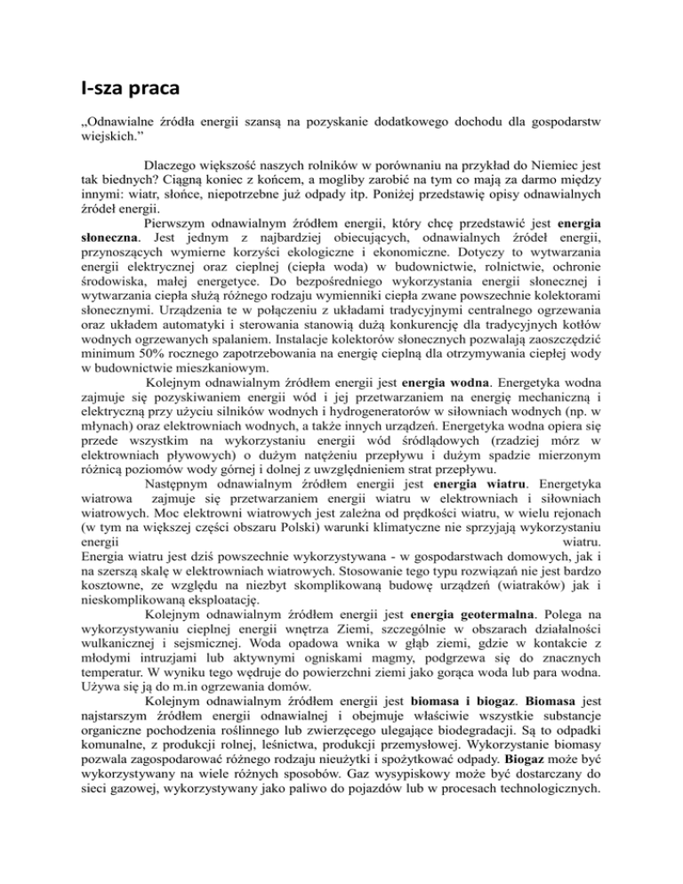I-sza praca „Odnawialne źródła energii szansą na pozyskanie dodatkowego dochodu dla gospodarstw wiejskich.” Dlaczego większość naszych rolników w porównaniu na przykład do Niemiec jest tak biednych? Ciągną koniec z końcem, a mogliby zarobić na tym co mają za darmo między innymi: wiatr, słońce, niepotrzebne już odpady itp. Poniżej przedstawię opisy odnawialnych źródeł energii. Pierwszym odnawialnym źródłem energii, który chcę przedstawić jest energia słoneczna. Jest jednym z najbardziej obiecujących, odnawialnych źródeł energii, przynoszących wymierne korzyści ekologiczne i ekonomiczne. Dotyczy to wytwarzania energii elektrycznej oraz cieplnej (ciepła woda) w budownictwie, rolnictwie, ochronie środowiska, małej energetyce. Do bezpośredniego wykorzystania energii słonecznej i wytwarzania ciepła służą różnego rodzaju wymienniki ciepła zwane powszechnie kolektorami słonecznymi. Urządzenia te w połączeniu z układami tradycyjnymi centralnego ogrzewania oraz układem automatyki i sterowania stanowią dużą konkurencję dla tradycyjnych kotłów wodnych ogrzewanych spalaniem. Instalacje kolektorów słonecznych pozwalają zaoszczędzić minimum 50% rocznego zapotrzebowania na energię cieplną dla otrzymywania ciepłej wody w budownictwie mieszkaniowym. Kolejnym odnawialnym źródłem energii jest energia wodna. Energetyka wodna zajmuje się pozyskiwaniem energii wód i jej przetwarzaniem na energię mechaniczną i elektryczną przy użyciu silników wodnych i hydrogeneratorów w siłowniach wodnych (np. w młynach) oraz elektrowniach wodnych, a także innych urządzeń. Energetyka wodna opiera się przede wszystkim na wykorzystaniu energii wód śródlądowych (rzadziej mórz w elektrowniach pływowych) o dużym natężeniu przepływu i dużym spadzie mierzonym różnicą poziomów wody górnej i dolnej z uwzględnieniem strat przepływu. Następnym odnawialnym źródłem energii jest energia wiatru. Energetyka wiatrowa zajmuje się przetwarzaniem energii wiatru w elektrowniach i siłowniach wiatrowych. Moc elektrowni wiatrowych jest zależna od prędkości wiatru, w wielu rejonach (w tym na większej części obszaru Polski) warunki klimatyczne nie sprzyjają wykorzystaniu energii wiatru. Energia wiatru jest dziś powszechnie wykorzystywana - w gospodarstwach domowych, jak i na szerszą skalę w elektrowniach wiatrowych. Stosowanie tego typu rozwiązań nie jest bardzo kosztowne, ze względu na niezbyt skomplikowaną budowę urządzeń (wiatraków) jak i nieskomplikowaną eksploatację. Kolejnym odnawialnym źródłem energii jest energia geotermalna. Polega na wykorzystywaniu cieplnej energii wnętrza Ziemi, szczególnie w obszarach działalności wulkanicznej i sejsmicznej. Woda opadowa wnika w głąb ziemi, gdzie w kontakcie z młodymi intruzjami lub aktywnymi ogniskami magmy, podgrzewa się do znacznych temperatur. W wyniku tego wędruje do powierzchni ziemi jako gorąca woda lub para wodna. Używa się ją do m.in ogrzewania domów. Kolejnym odnawialnym źródłem energii jest biomasa i biogaz. Biomasa jest najstarszym źródłem energii odnawialnej i obejmuje właściwie wszystkie substancje organiczne pochodzenia roślinnego lub zwierzęcego ulegające biodegradacji. Są to odpadki komunalne, z produkcji rolnej, leśnictwa, produkcji przemysłowej. Wykorzystanie biomasy pozwala zagospodarować różnego rodzaju nieużytki i spożytkować odpady. Biogaz może być wykorzystywany na wiele różnych sposobów. Gaz wysypiskowy może być dostarczany do sieci gazowej, wykorzystywany jako paliwo do pojazdów lub w procesach technologicznych. Biogaz może być spalany w specjalnie przystosowanych kotłach, zastępując gaz ziemny. Uzyskane ciepło może być przekazywane do instalacji centralnego ogrzewania. Energia elektryczna wyprodukowana w silnikach iskrowych lub turbinach może być sprzedawana do sieci energetycznych. Biogaz jest również wykorzystywany w układach skojarzonych do produkcji energii elektrycznej i ciepła. Wszystkie przedstawione powyżej odnawialne źródła energii wykorzystywane są m.in. w Niemczech. Polacy mogliby się od nich nauczyć oszczędności i pracowitości. Tam już w przedszkolu dzieci uczone są ekologii. Polscy rolnicy mogliby mieć dodatkowy dochód gdyby zaangażowaliby się w uprawę i sprzedaż roślin energetycznych oraz gdyby wykorzystywali to co zawsze wyrzucają. Moim zdaniem Polska gospodarka zyskałaby bardzo dużo gdyby powstało w Polsce więcej elektrowni oraz biogazowni. Marta Olszyńska kl. IV TH