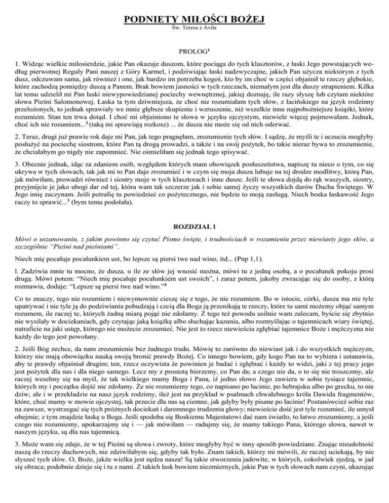 PODNIETY MIŁOŚCI BOŻEJ Św. Teresa z Avila PROLOG1 1. Widząc wielkie miłosierdzie, jakie Pan okazuje duszom, które pociąga do tych klasztorów, z łaski Jego powstających według pierwotnej Reguły Pani naszej z Góry Karmel, i podziwiając łaski nadzwyczajne, jakich Pan użycza niektórym z tych dusz, odczuwam sama, jak również i one, jak bardzo im potrzeba kogoś, kto by im choć w części objaśnił te rzeczy głębokie, które zachodzą pomiędzy duszą a Panem. Brak bowiem jasności w tych rzeczach, niemałym jest dla duszy strapieniem. Kilka lat temu udzielił mi Pan łaski niewypowiedzianej pociechy wewnętrznej, jakiej doznaję, ile razy słyszę lub czytam niektóre słowa Pieśni Salomonowej. Łaska ta tym dziwniejsza, że choć nie rozumiałam tych słów, z łacińskiego na język rodzinny przełożonych, to jednak sprawiały we mnie głębsze skupienie i wzruszenie, niż wszelkie inne najpobożniejsze książki, które rozumiem. Stan ten trwa dotąd. I choć mi objaśniono te słowa w języku ojczystym, niewiele więcej pojmowałam. Jednak, choć ich nie rozumiem...2 (taką mi sprawiają rozkosz) ... że dusza nie może się od nich oderwać. 2. Teraz, drugi już prawie rok daje mi Pan, jak tego pragnęłam, zrozumienie tych słów. I sądzę, że myśli te i uczucia mogłyby posłużyć na pociechę siostrom, które Pan tą drogą prowadzi, a także i na swój pożytek, bo takie nieraz bywa to zrozumienie, że chciałabym go nigdy nie zapomnieć. Nie ośmieliłam się jednak tego spisywać. 3. Obecnie jednak, idąc za zdaniem osób, względem których mam obowiązek posłuszeństwa, napiszę tu nieco o tym, co się ukrywa w tych słowach, tak jak mi to Pan daje zrozumieć i w czym się moja dusza lubuje na tej drodze modlitwy, którą Pan, jak mówiłam, prowadzi również i siostry moje w tych klasztorach i inne dusze. Jeśli te słowa dojdą do rąk waszych, siostry, przyjmijcie je jako ubogi dar od tej, która wam tak szczerze jak i sobie samej życzy wszystkich darów Ducha Świętego. W Jego imię zaczynam. Jeśli potrafię tu powiedzieć co pożytecznego, nie będzie to moją zasługą. Niech boska łaskawość Jego raczy to sprawić...3 (bym temu podołała). ROZDZIAŁ l Mówi o uszanowaniu, z jakim powinno się czytać Pismo święte, i trudnościach w rozumieniu przez niewiasty jego słów, a szczególnie “Pieśni nad pieśniami”. Niech mię pocałuje pocałunkiem ust, bo lepsze są piersi twe nad wino, itd... (Pnp 1,1). l. Zadziwia mnie tu mocno, że dusza, o ile ze słów jej wnosić można, mówi tu z jedną osobą, a o pocałunek pokoju prosi drugą. Mówi potem: “Niech mię pocałuje pocałunkiem ust swoich”, i zaraz potem, jakoby zwracając się do osoby, z którą rozmawia, dodaje: “Lepsze są piersi twe nad wino.”4 Co to znaczy, tego nie rozumiem i niewymownie cieszę się z tego, że nie rozumiem. Bo w istocie, córki, dusza ma nie tyle upatrywać i nie tyle ją do podziwiania pobudzają i czcią dla Boga ją przenikają te rzeczy, które tu sami możemy objąć samym rozumem, ile raczej te, których żadną miarą pojąć nie zdołamy. Z tego też powodu usilnie wam zalecam, byście się zbytnio nie wysilały w dociekaniach, gdy czytając jaką książkę albo słuchając kazania, albo rozmyślając o tajemnicach wiary świętej, natraficie na jaki ustęp, którego nie możecie zrozumieć. Nie jest to rzecz niewieścia zgłębiać tajemnice Boże i mężczyzna nie każdy do tego jest powołany. 2. Jeśli Bóg zechce, da nam zrozumienie bez żadnego trudu. Mówię to zarówno do niewiast jak i do wszystkich mężczyzn, którzy nie mają obowiązku nauką swoją bronić prawdy Bożej. Co innego bowiem, gdy kogo Pan na to wybiera i ustanawia, aby te prawdy objaśniał drugim; ten, rzecz oczywista że powinien je badać i zgłębiać i każdy to widzi, jaki z tej pracy jego jest pożytek dla nas i dla niego samego. Lecz my z prostotą bierzemy, co Pan da; a czego nie da, o to się nie troszczmy, ale raczej weselmy się na myśl, że tak wielkiego mamy Boga i Pana, iż jedno słowo Jego zawiera w sobie tysiące tajemnic, których my i początku dojść nie zdołamy. Że nie rozumiemy tego, co napisano po łacinie, po hebrajsku albo po grecku, to nie dziw; ale i w przekładzie na nasz język rodzimy, ileż jest na przykład w psalmach chwalebnego króla Dawida fragmentów, które, choć mamy w mowie ojczystej, tak przecie dla nas są ciemne, jak gdyby były pisane po łacinie! Postanówcież sobie raz na zawsze, wystrzegać się tych próżnych dociekań i daremnego trudzenia głowy; niewieście dość jest tyle rozumieć, ile umysł obejmie; z tym znajdzie łaskę u Boga. Jeśli spodoba się Boskiemu Majestatowi dać nam światło, to łatwo zrozumiemy, a jeśli czego nie rozumiemy, upokarzajmy się i — jak mówiłam — radujmy się, że mamy takiego Pana, którego słowa, nawet w naszym języku, są dla nas tajemnicą. 3. Może wam się zdaje, że w tej Pieśni są słowa i zwroty, które mogłyby być w inny sposób powiedziane. Znając nieudolność naszą do rzeczy duchowych, nie zdziwiłabym się, gdyby tak było. Znam takich, którzy mi mówili, że raczej uciekają, by nie słyszeć tych słów. O, Boże, jakże wielka jest nędza nasza! Są takie stworzenia jadowite, w których, cokolwiek zjedzą, w jad się obraca; podobnie dzieje się i tu z nami. Z takich łask bowiem niezmiernych, jakie Pan w tych słowach nam czyni, ukazując nam, jak wielka jest szczęśliwość duszy, która Go miłuje i dodając jej otuchy, aby śmiało rozmawiała z Boskim Jego Majestatem i cieszyła się Jego posiadaniem, my wyciągamy obawy i niewłaściwe zrozumienie, świadczące, jak mało jest w nas uczucia miłości Bożej. 4. O, Panie mój, jakże zły użytek czynimy z tych niezliczonych dobrodziejstw, jakimi Ty nas obdarzasz! Ty w niepojętej dobroci Twojej coraz nowe wynajdujesz sposoby i drogi dla okazania nam tej wielkiej miłości, jak