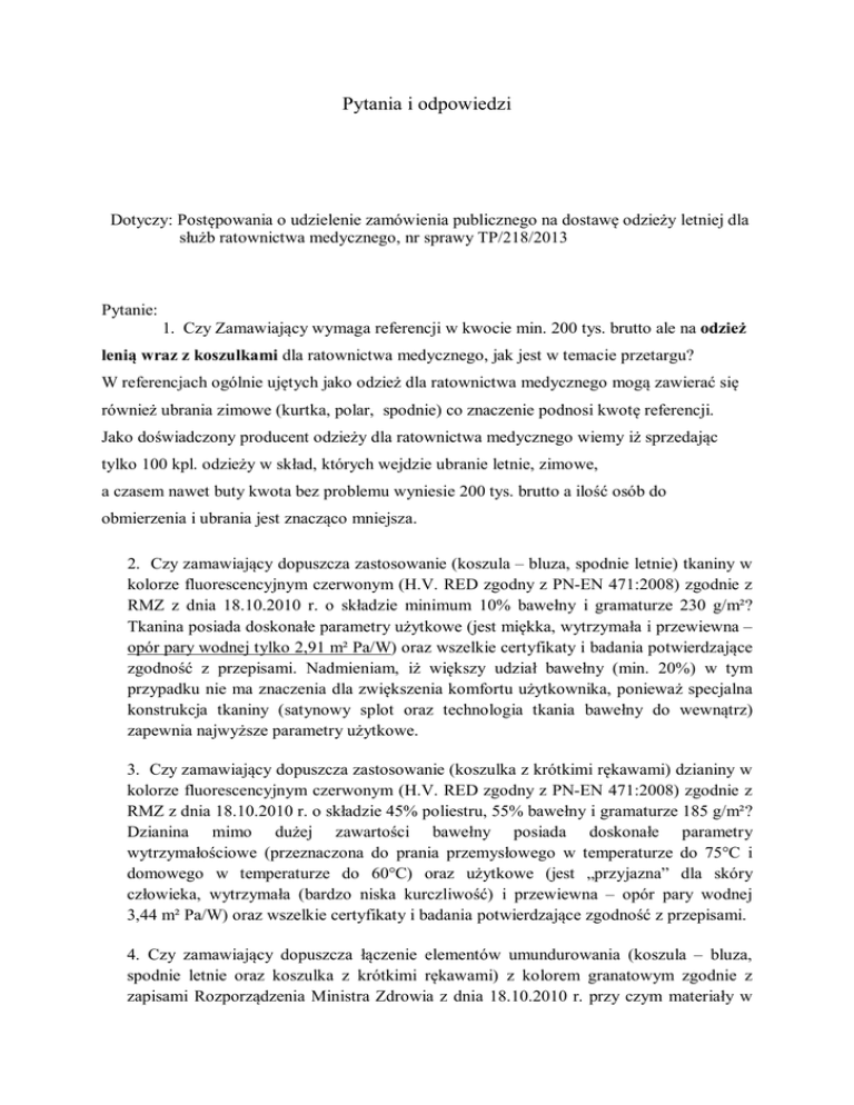 Pytania i odpowiedzi Dotyczy: Postępowania o udzielenie zamówienia publicznego na dostawę odzieży letniej dla służb ratownictwa medycznego, nr sprawy TP/218/2013 Pytanie: 1. Czy Zamawiający wymaga referencji w kwocie min. 200 tys. brutto ale na odzież lenią wraz z koszulkami dla ratownictwa medycznego, jak jest w temacie przetargu? W referencjach ogólnie ujętych jako odzież dla ratownictwa medycznego mogą zawierać się również ubrania zimowe (kurtka, polar, spodnie) co znaczenie podnosi kwotę referencji. Jako doświadczony producent odzieży dla ratownictwa medycznego wiemy iż sprzedając tylko 100 kpl. odzieży w skład, których wejdzie ubranie letnie, zimowe, a czasem nawet buty kwota bez problemu wyniesie 200 tys. brutto a ilość osób do obmierzenia i ubrania jest znacząco mniejsza. 2. Czy zamawiający dopuszcza zastosowanie (koszula – bluza, spodnie letnie) tkaniny w kolorze fluorescencyjnym czerwonym (H.V. RED zgodny z PN-EN 471:2008) zgodnie z RMZ z dnia 18.10.2010 r. o składzie minimum 10% bawełny i gramaturze 230 g/m²? Tkanina posiada doskonałe parametry użytkowe (jest miękka, wytrzymała i przewiewna – opór pary wodnej tylko 2,91 m² Pa/W) oraz wszelkie certyfikaty i badania potwierdzające zgodność z przepisami. Nadmieniam, iż większy udział bawełny (min. 20%) w tym przypadku nie ma znaczenia dla zwiększenia komfortu użytkownika, ponieważ specjalna konstrukcja tkaniny (satynowy splot oraz technologia tkania bawełny do wewnątrz) zapewnia najwyższe parametry użytkowe. 3. Czy zamawiający dopuszcza zastosowanie (koszulka z krótkimi rękawami) dzianiny w kolorze fluorescencyjnym czerwonym (H.V. RED zgodny z PN-EN 471:2008) zgodnie z RMZ z dnia 18.10.2010 r. o składzie 45% poliestru, 55% bawełny i gramaturze 185 g/m²? Dzianina mimo dużej zawartości bawełny posiada doskonałe parametry wytrzymałościowe (przeznaczona do prania przemysłowego w temperaturze do 75°C i domowego w temperaturze do 60°C) oraz użytkowe (jest „przyjazna” dla skóry człowieka, wytrzymała (bardzo niska kurczliwość) i przewiewna – opór pary wodnej 3,44 m² Pa/W) oraz wszelkie certyfikaty i badania potwierdzające zgodność z przepisami. 4. Czy zamawiający dopuszcza łączenie elementów umundurowania (koszula – bluza, spodnie letnie oraz koszulka z krótkimi rękawami) z kolorem granatowym zgodnie z zapisami Rozporządzenia Ministra Zdrowia z dnia 18.10.2010 r. przy czym materiały w tym kolorze spełniają wymagania normy PN-EN 471 + A1:2008 i posiadają stosowne certyfikaty? Odpowiedź: 1. Zamawiający wymaga referencji w kwocie minimum 200 tys. zł brutto ogólnie na odzież dla służb ratownictwa medycznego, dotyczy to zarówno odzieży letniej jak i zimowej wraz z butami. 2. Tak 3. Tak 4. Tak