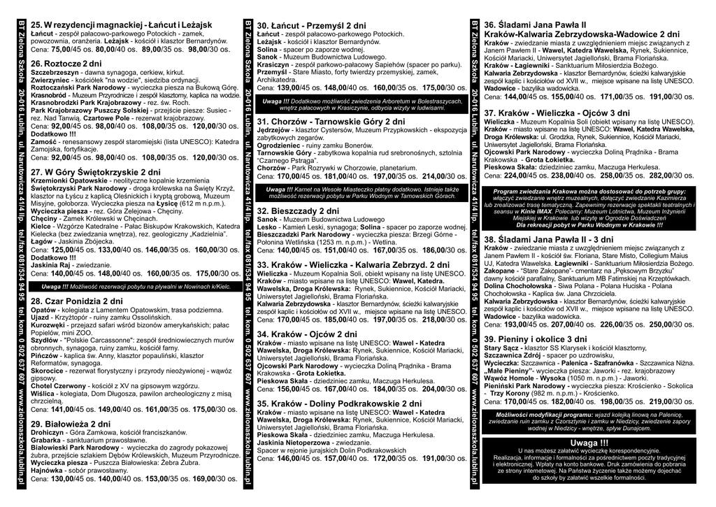26. Roztocze 2 dni Szczebrzeszyn - dawna synagoga, cerkiew, kirkut. Zwierzyniec - koœció³ek "na wodzie", siedziba ordynacji. Roztoczañski Park Narodowy - wycieczka piesza na Bukow¹ Górê. Krasnobród - Muzeum Przyrodnicze i zespó³ klasztorny, kaplica na wodzie. Krasnobrodzki Park Krajobrazowy - rez. œw. Roch. Park Krajobrazowy Puszczy Solskiej - przejœcie piesze: Susiec rez. Nad Tanwi¹. Czartowe Pole - rezerwat krajobrazowy. Cena: 92,00/45 os. 98,00/40 os. 108,00/35 os. 120,00/30 os. Dodatkowo !!! Zamoœæ - renesansowy zespó³ staromiejski (lista UNESCO): Katedra Zamojska, fortyfikacje. Cena: 92,00/45 os. 98,00/40 os. 108,00/35 os. 120,00/30 os. 27. W Góry Œwiêtokrzyskie 2 dni Krzemionki Opatowskie - neolityczne kopalnie krzemienia Œwiêtokrzyski Park Narodowy - droga królewska na Œwiêty Krzy¿, klasztor na £yœcu z kaplic¹ Oleœnickich i krypt¹ grobow¹, Muzeum Misyjne, go³oborza. Wycieczka piesza na £ysicê (612 m n.p.m.). Wycieczka piesza - rez. Góra Zelejowa - Chêciny. Chêciny - Zamek Królewski w Chêcinach. Kielce - Wzgórze Katedralne - Pa³ac Biskupów Krakowskich, Katedra Kielecka (bez zwiedzania wnêtrza), rez. geologiczny „Kadzielnia”. £agów - Jaskinia Zbójecka. Cena: 125,00/45 os. 133,00/40 os. 146,00/35 os. 160,00/30 os. Dodatkowo !!! Jaskinia Raj - zwiedzanie. Cena: 140,00/45 os. 148,00/40 os. 160,00/35 os. 175,00/30 os. Uwaga !!! Mo¿liwoœæ rezerwacji pobytu na p³ywalni w Nowinach k/Kielc. 28. Czar Ponidzia 2 dni Opatów - kolegiata z Lamentem Opatowskim, trasa podziemna. Ujazd - Krzy¿topór - ruiny zamku Ossoliñskich. Kurozwêki - przejazd safari wœród bizonów amerykañskich; pa³ac Popielów, mini ZOO. Szyd³ów - "Polskie Carcassonne": zespó³ œredniowiecznych murów obronnych, synagoga, ruiny zamku, koœció³ farny. Piñczów - kaplica œw. Anny, klasztor popauliñski, klasztor Reformatów, synagoga. Skorocice - rezerwat florystyczny i przyrody nieo¿ywionej - w¹wóz gipsowy. Chotel Czerwony - koœció³ z XV na gipsowym wzgórzu. Wiœlica - kolegiata, Dom D³ugosza, pawilon archeologiczny z mis¹ chrzcieln¹. Cena: 141,00/45 os. 149,00/40 os. 161,00/35 os. 175,00/30 os. 29. Bia³owie¿a 2 dni Drohiczyn - Góra Zamkowa, koœció³ franciszkanów. Grabarka - sanktuarium prawos³awne. Bia³owieski Park Narodowy - wycieczka do zagrody pokazowej ¿ubra, przejœcie szlakiem Dêbów Królewskich, Muzeum Przyrodnicze. Wycieczka piesza - Puszcza Bia³owieska: ¯ebra ¯ubra. Hajnówka - sobór prawos³awny. Cena: 130,00/45 os. 140,00/40 os. 153,00/35 os. 169,00/30 os. 30. £añcut - Przemyœl 2 dni £añcut - zespó³ pa³acowo-parkowego Potockich. Le¿ajsk - koœció³ i klasztor Bernardynów. Solina - spacer po zaporze wodnej. Sanok - Muzeum Budownictwa Ludowego. Krasiczyn - zespó³ parkowo-pa³acowy Sapiehów (spacer po parku). Przemyœl - Stare Miasto, forty twierdzy przemyskiej, zamek, Archikatedra. Cena: 139,00/45 os. 148,00/40 os. 160,00/35 os. 175,00/30 os. Uwaga !!! Dodatkowo mo¿liwoœæ zwiedzenia Arboretum w Bolestraszycach, wnêtrz pa³acowych w Krasiczynie, odbycia wizyty w ludwisarni. 31. Chorzów - Tarnowskie Góry 2 dni Jêdrzejów - klasztor Cystersów, Muzeum Przypkowskich - ekspozycja zabytkowych zegarów. Ogrodzieniec - ruiny zamku Bonerów. Tarnowskie Góry - zabytkowa kopalnia rud srebronoœnych, sztolnia “Czarnego Pstr¹ga”. Chorzów - Park Rozrywki w Chorzowie, planetarium. Cena: 170,00/45 os. 181,00/40 os. 197,00/35 os. 214,00/30 os. Uwaga !!! Karnet na Weso³e Miasteczko p³atny dodatkowo. Istnieje tak¿e mo¿liwoœæ rezerwacji pobytu w Parku Wodnym w Tarnowskich Górach. 32. Bieszczady 2 dni Sanok - Muzeum Budownictwa Ludowego Lesko - Kamieñ Leski, synagoga; Solina - spacer po zaporze wodnej. Bieszczadzki Park Narodowy - wycieczka piesza: Brzegi Górne Po³onina Wetliñska (1253 m. n.p.m.) - Wetlina. Cena: 140,00/45 os. 151,00/40 os. 167,00/35 os. 186,00/30 os. 33. Kraków - Wieliczka - Kalwaria Zebrzyd. 2 dni Wieliczka - Muzeum Kopalnia Soli, obiekt wpisany na listê UNESCO. Kraków - miasto wpisane na listê UNESCO: Wawel, Katedra. Wawelska, Droga Królewska: Rynek, Sukiennice, Koœció³ Mariacki, Uniwersytet Jagielloñski, Brama Floriañska. Kalwaria Zebrzydowska - klasztor Bernardynów, œcie¿ki kalwaryjskie zespó³ kaplic i koœcio³ów od XVII w., miejsce wpisane na listê UNESCO. Cena: 170,00/45 os. 185,00/40 os. 197,00/35 os. 218,00/30 os. 34. Kraków - Ojców 2 dni Kraków - miasto wpisane na listê UNESCO: Wawel - Katedra Wawelska, Droga Królewska: Rynek, Sukiennice, Koœció³ Mariacki, Uniwersytet Jagielloñski, Brama Floriañska. Ojcowski Park Narodowy - wycieczka Dolin¹ Pr¹dnika - Brama Krakowska - Grota £okietka. Pieskowa Ska³a - dziedziniec zamku, Maczuga Herkulesa. Cena: 156,00/45 os. 167,00/40 os. 184,00/35 os. 204,00/30 os. 35. Kraków - Doliny Podkrakowskie 2 dni Kraków - miasto wpisane na listê UNESCO: Wawel - Katedra Wawelska, Droga Królewska: Rynek, Sukiennice, Koœció³ Mariacki, Uniwersytet Jagielloñski, Brama Floriañska. Pieskowa Ska³a - dziedziniec zamku, Maczuga Herkulesa. Jaskinia Nietoperzowa - zwiedzanie. Spacer w rejonie jurajskich Dolin Podkrakowskich Cena: 146,00/45 os. 157,00/40 os. 172,00/35 os. 191,00/30 os. BT Zielona Szko³a 20-016 Lublin, ul. Narutowicza 41/4 IIp. tel./fax 081/534 94 95 tel. kom. 0 502 637 607 www.zielonaszkola.lublin.pl £añcut - zespó³ pa³acowo-parkowego Potockich - zamek, powozownia, oran¿eria. Le¿ajsk - koœció³ i klasztor Bernardynów. Cena: 75,00/45 os. 80,00/40 os. 89,00/35 os. 98,00/30 os. BT Zielona Szko³a 20-016 Lublin, ul. Narutowicza 41/4 IIp. tel./fax 081/534 94 95 tel. kom. 0 502 637 607 www.zielonaszkola.lublin.pl BT Zielona Szko³a 20-016 Lublin, ul. Narutowicza 41/4 IIp. tel./fax 081/534 94 95 tel. kom. 0 502 637 607 www.zielonaszkola.lublin.pl 25. W rezydencji magnackiej - £añcut i Le¿ajsk 36. Œladami Jana Paw³a II Kraków-Kalwaria Zebrzydowska-Wadowice 2 dni Kraków - zwiedzanie miasta z uwzgl