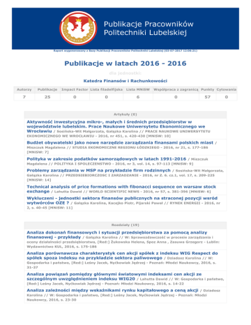 Raport wygenerowany z Bazy Publikacji Pracowników Politechniki Lubelskiej (03-07-2017 12:06:21) Publikacje w latach 2016 - 2016 dla jednostki: Katedra Finansów i Rachunkowości Autorzy Publikacje 7 25 Impact Factor Lista filadelfijska 0 0 Lista MNiSW Współpraca z zagranicą Punkty Cytowania 6 0 57 0 Artykuły (6) Aktywność inwestycyjna mikro-, małych i średnich przedsiębiorstw w województwie lubelskim. Prace Naukowe Uniwersytetu Ekonomicznego we Wrocławiu / Sosińska-Wit Małgorzata, Gałązka Karolina // PRACE NAUKOWE UNIWERSYTETU EKONOMICZNEGO WE WROCŁAWIU - 2016, nr 451, s. 420-430 [MNiSW: 10] Budżet obywatelski jako nowe narzędzie zarządzania finansami polskich miast / Miszczuk Magdalena // STUDIA EKONOMICZNE REGIONU ŁÓDZKIEGO - 2016, nr 21, s. 177-186 [MNiSW: 7] Polityka w zakresie podatków samorządowych w latach 1991-2016 / Miszczuk Magdalena // POLITYKA I SPOLECZENSTWO - 2016, nr 3, vol. 14, s. 97-113 [MNiSW: 9] Problemy zarządzania w MSP na przykładzie firm rodzinnych / Sosińska-Wit Małgorzata, Gałązka Karolina // PRZEDSIEBIORCZOSC I ZARZADZANIE - 2016, nr Z. 6. cz.1, vol. 17, s. 209-225 [MNiSW: 14] Technical analysis of price formations with fibonacci sequence on warsaw stock exchange / Lahutta Dawid // WORLD SCIENTIFIC NEWS - 2016, nr 57, s. 381-396 [MNiSW: 6] Wykluczeni - jednostki sektora finansów publicznych na straconej pozycji wsród wytwórców OZE ? / Gałązka Karolina, Kacejko Piotr, Pijarski Paweł // RYNEK ENERGII - 2016, nr 2, s. 40-45 [MNiSW: 11] Rozdziały (19) Analiza dokonań finansowych i sytuacji przedsiębiorstwa za pomocą analizy finansowej - przykłady / Gałązka Karolina // W: Sprawozdawczość w procesie zarządzania i oceny działalności przedsiębiorstwa, [Red:] Żukowska Helena, Spoz Anna , Zasuwa Grzegorz - Lublin: Wydawnictwo KUL, 2016, s. 175-186 Analiza porównawcza charakterystyk cen akcji spółek z indeksu WIG Respect do spółek spoza indeksu na przykładzie sektora paliwowego / Dziadosz Karolina // W: Gospodarka i państwo, [Red:] Leśny Jacek, Nyćkowiak Jędrzej - Poznań: Młodzi Naukowcy, 2016, s. 31-37 Analiza powiązań pomiędzy głównymi światowymi indeksami cen akcji ze szczególnym uwzględnieniem indeksu WIG20 / Lahutta Dawid // W: Gospodarka i państwo, [Red:] Leśny Jacek, Nyćkowiak Jędrzej - Poznań: Młodzi Naukowcy, 2016, s. 14-22 Analiza zależności między wskaźnikami rynku kapitałowego a ceną akcji / Dziadosz Karolina // W: Gospodarka i państwo, [Red:] Leśny Jacek, Nyćkowiak Jędrzej - Poznań: Młodzi Naukowcy, 2016, s. 23-30 Harmonogram sporządzania, zatwierdzania, prezentacja i ogłaszanie sprawozdań finansowych / Leśkiewicz Marcin // W: Sprawozdawczość w procesie zarządzania i oceny działalności przedsiębiorstwa, [Red:] Żukowska Helena, Spoz Anna , Zasuwa Grzegorz - Lublin: Wydawnictwo KUL, 2016, s. 27-34 Jednostki sektora finansów publicznych jako inwestorzy na rynku mikroinstalacji OZE / Gałązka Karolina, Kacejko Piotr, Pijarski Paweł // W: Rynek energii elektrycznej : energetyka rozproszona, [Red:] Połecki Zbigniew - Lublin: Politechnika Lubelska , 2016, s. 28-37 Metody wyceny rozchodu zapasów według krajowych i międzynarodowych standardów rachunkowości / Leśkiewicz Marcin // W: Tendencje rozwoju współczesnej rachunkowości finansowej i zarządczej, [Red:] Kister Agnieszka, Bujak Adam - Lublin: Wydział Ekonomiczny Uniwersytetu Marii Curie-Skłodowskiej w Lublinie, 2016, s. 229-238 Optymalizacja poziomu zapasów jako system zapewniania jakości w logistyce zaopatrzenia z uwzględnieniem aspektu finansowego / Lahutta Dawid // W: Jakość w systemach zarządzania organizacją w nowej gospodarce, [Red:] Skrzypek Elżbieta - Lublin: Katedra Zarządzania Jakością i Wiedzą, Wydział Ekonomiczny, Uniwersytetu Marii Curie - Skłodowskiej w Lublinie, 2016, s. 501-512 Polish graduate students financial expectations analysis with human capital model – comparative analysis with other countries / Lahutta Dawid // W: Make Learn 2016 : Managing Innovation and Diversity in Knowledge Society Through Turbulent Time : Proceedings of the MakeLearn and TIIM Joint International Conference, 25–27 May, 2016, Timisoara, Romania, [Red:] Dermol Valerij, Trunk Aleš , Smrkolj Marko - Bangkok ; Celje ; Lublin : ToKnowPress International Academic Publisher, 2016, s. 549-558 Sprawozdanie finansowe jako źródło informacji w przedsiębiorstwie logistycznym / Lahutta Dawid // W: Logistyka i jakość : procesy doskonalące zarządzanie, [Red:] Skrzypek Adam , Banaś Jarosław - Lublin: Wydział Ekonomiczny Uniwersytetu Marii Curie-Skłodowskiej w Lublinie, 2016, s. 530-541 Sprawozdanie łączne a skonsolidowane / Leśkiewicz Marcin // W: Sprawozdawczość finansowa w systemie wymiany informacji i bezpieczeństwa obrotu gospodarczego, [Red:] Żukowska Helena, Zuba-Ciszewska Maria, Bolibok Piotr - Lublin: Wydawnictwo KUL, 2016, s. 109-118 Sprawozdawczość finansowa według ustawy o rachunkowości i przepisów szczególnych / Sosińska-Wit Małgorzata, Gałązka Karolina // W: Sprawozdawczość finansowa w systemie wymiany informacji i bezpieczeństwa obrotu gospodarczego, [Red:] Żukowska Helena, Zuba-Ciszewska Maria, Bolibok Piotr - Lublin: Wydawnictwo KUL, 2016, s. 45-54 Szczupła rachunkowość jako sposób racjonalizacji rachunkowości w przedsiębiorstwie / Janik Wiesław // W: Sprawozdawczość w procesie zarządzania i oceny działalności przedsiębiorstwa, [Red:] Żukowska Helena, Spoz Anna , Zasuwa Grzegorz - Lublin: Wydawnictwo KUL, 2016, s. 263-272 Uwarunkowania rozwoju produkcji energii elektrycznej na bazie źródeł odnawialnych / Janik Wiesław, Kaproń Henryk, Paździor Artur // W: Zarządzanie energią i teleinformatyka - ZET 2016 : materiały i studia, [Red:] Kaproń Henryk - Lublin: Wydawnictwo Kaprint, 2016, s. 95-104 Wpływ zmian ustawy o OZE na rozwój rynku instalacji fotowoltaicznych / Gałązka Karolina, Kacejko Piotr // W: Energetyka prosumencka. Próba ko