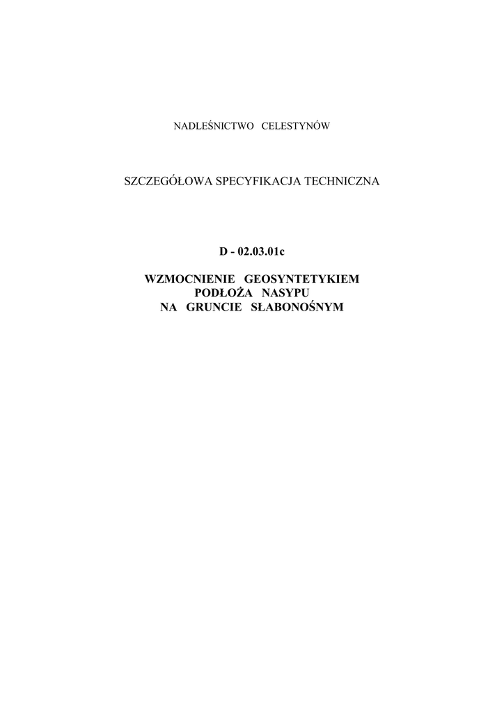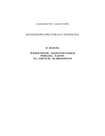 NADLEŚNICTWO CELESTYNÓW SZCZEGÓŁOWA SPECYFIKACJA TECHNICZNA D - 02.03.01c WZMOCNIENIE GEOSYNTETYKIEM PODŁOśA NASYPU NA GRUNCIE SŁABONOŚNYM SPIS TREŚCI 1. WSTĘP............................................................................................................................3 2. MATERIAŁY.................................................................................................................4 3. SPRZĘT ..........................................................................................................................5 4. TRANSPORT .................................................................................................................5 5. WYKONANIE ROBÓT ................................................................................................6 6. KONTROLA JAKOŚCI ROBÓT ................................................................................7 7. OBMIAR ROBÓT .........................................................................................................8 8. ODBIÓR ROBÓT ..........................................................................................................8 9. PODSTAWA PŁATNOŚCI...........................................................................................8 10. PRZEPISY ZWIĄZANE ...............................................................................................9 11. ZAŁĄCZNIKI ..............................................................................................................10 NAJWAśNIEJSZE OZNACZENIA I SKRÓTY OST SST IBDiM GDDP - ogólna specyfikacja techniczna - szczegółowa specyfikacja techniczna - Instytut Badawczy Dróg i Mostów - Generalna Dyrekcja Dróg Publicznych D-02.03.01c Wzmocnienie geosyntetykiem podłoŜa nasypu na gruncie słabonośnym 3 1. WSTĘP 1.1. Przedmiot SST Przedmiotem niniejszej szczegółowej specyfikacji technicznej (SST) są wymagania dotyczące wykonania i odbioru robót związanych z wykonaniem wzmocnienia geosyntetykiem podłoŜa w gruncie słabonośnym. 1.2. Zakres stosowania SST Szczegółowa specyfikacja techniczna (SST) stanowi podstawę jako dokument przetargowy i kontraktowy przy zlecaniu i realizacji robót przy przebudowie. Drogi leśnej Nr 220-00511,,Do Centrum Edukacji Leśnej” 1.3. Zakres robót objętych SST Ustalenia zawarte w niniejszej specyfikacji dotyczą zasad prowadzenia robót związanych z wykonaniem i odbiorem wzmocnienia rowu krytego na gruncie słabonośnym za pomocą geosyntetyku zastosowanego przy przebudowie drogi leśnej − Wykonaniem wzmocnienia podłoŜa słabonośnego km geowłókniną-300g/m2 1.4. Określenia podstawowe 1.4.1. Geosyntetyk - materiał o postaci ciągłej, wytwarzany z wysoko spolimeryzowanych włókien syntetycznych jak polietylen, polipropylen, poliester, charakteryzujący się m.in. duŜą wytrzymałością oraz wodoprzepuszczalnością. Geosyntetyki obejmują: geosiatki, geowłókniny, geotkaniny, geodzianiny, georuszty, geokompozyty, geomembrany. 1.4.2. Geowłóknina - materiał nietkany wykonany z włókien syntetycznych, których spójność jest zapewniona przez igłowanie lub inne procesy łączenia (np. dodatki chemiczne, połączenie termiczne) i który zostaje maszynowo uformowany w postaci maty. 1.4.3. Geotkanina - materiał tkany wytwarzany z włókien syntetycznych przez przeplatanie dwóch lub więcej układów przędz, włókien, filamentów, taśm lub innych elementów. 1.4.4. Geokompozyt - materiał złoŜony z co najmniej dwóch rodzajów połączonych geosyntetyków, np. geowłókniny i geosiatki, uformowanych w postaci maty. 1.4.5. Geosiatka - płaska struktura w postaci siatki, z otworami znacznie większymi niŜ elementy składowe, z oczkami połączonymi (przeplatanymi) w węzłach lub ciągnionymi 1.4.6. Georuszt - siatka wewnętrznie połączonych elementów wytrzymałych na rozciąganie, wykonanych jako ciągnione na gorąco, układane i sklejane lub zgrzewane. 1.4.7. Wzmocnienie geosyntetykiem podłoŜa nasypu - wykorzystanie właściwości geosyntetyku przy rozciąganiu (wytrzymałości, sztywności) do poprawienia właściwości mechanicznych gruntu nasypu. 4 Wzmocnienie geosyntetykiem podłoŜa nasypu na gruncie słabonośnym D-02.03.01c 1.4.8. Nasyp - drogowa budowla ziemna wykonana powyŜej powierzchni terenu w obrębie pasa drogowego. 1.4.9. Słabe podłoŜe (pod nasypem) - warstwy gruntu nie spełniające wymagań, wynikających z warunków nośności lub stateczności albo warunków przydatności do uŜytkowania nasypu. 1.4.10. Pozostałe określenia podstawowe są zgodne z obowiązującymi, odpowiednimi polskimi normami i z definicjami podanymi w OST D-M-00.00.00 „Wymagania ogólne” [1] pkt 1.4. 1.5. Ogólne wymagania dotyczące robót Ogólne wymagania dotyczące robót podano w OST D-M-00.00.00 „Wymagania ogólne” [1] pkt 1.5. 2. MATERIAŁY 2.1. Ogólne wymagania dotyczące materiałów Ogólne wymagania dotyczące materiałów, ich pozyskiwania i składowania, podano w OST D-M-00.00.00 „Wymagania ogólne” [1] pkt 2. 2.2. Materiały do wykonania robót 2.2.1. Zgodność materiałów z dokumentacją projektową i aprobatą techniczną Materiały do wykonania wzmocnienia podłoŜa rowu za pomocą geomembrany i geowłókniny powinny być zgodne z ustaleniami dokumentacji projektowej oraz z aprobatą techniczną IBDiM. , geowłóknina- 210g/m2 2.2.2. Geosyntetyk Rodzaj geosyntetyku i jego właściwości powinny odpowiadać wymaganiom określonym w dokumentacji projektowej ( geowłóknina, ). Przy zastosowaniu geosyntetyku do oddzielenia korpusu nasypu od słabego podłoŜa zaleca się materiały o wytrzymałości co najmniej 8 kN/m oraz duŜej odkształcalności (np. włókniny o wydłuŜeniu przy zerwaniu co najmniej 40%); materiały te powinny zapewnić swobodny przepływ wody. Geosyntetyki powinny być dostarczane w rolkach nawiniętych na tuleje lub rury. Wymiary (szerokość, długość) mogą być standardowe lub dostosow