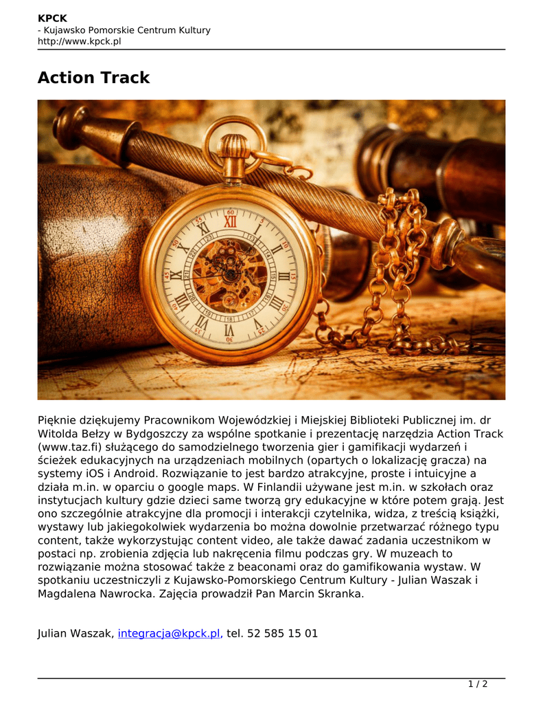 KPCK - Kujawsko Pomorskie Centrum Kultury http://www.kpck.pl Action Track Pięknie dziękujemy Pracownikom Wojewódzkiej i Miejskiej Biblioteki Publicznej im. dr Witolda Bełzy w Bydgoszczy za wspólne spotkanie i prezentację narzędzia Action Track (www.taz.fi) służącego do samodzielnego tworzenia gier i gamifikacji wydarzeń i ścieżek edukacyjnych na urządzeniach mobilnych (opartych o lokalizację gracza) na systemy iOS i Android. Rozwiązanie to jest bardzo atrakcyjne, proste i intuicyjne a działa m.in. w oparciu o google maps. W Finlandii używane jest m.in. w szkołach oraz instytucjach kultury gdzie dzieci same tworzą gry edukacyjne w które potem grają. Jest ono szczególnie atrakcyjne dla promocji i interakcji czytelnika, widza, z treścią książki, wystawy lub jakiegokolwiek wydarzenia bo można dowolnie przetwarzać różnego typu content, także wykorzystując content video, ale także dawać zadania uczestnikom w postaci np. zrobienia zdjęcia lub nakręcenia filmu podczas gry. W muzeach to rozwiązanie można stosować także z beaconami oraz do gamifikowania wystaw. W spotkaniu uczestniczyli z Kujawsko-Pomorskiego Centrum Kultury - Julian Waszak i Magdalena Nawrocka. Zajęcia prowadził Pan Marcin Skranka. Julian Waszak, [email protected], tel. 52 585 15 01 1/2 KPCK - Kujawsko Pomorskie Centrum Kultury http://www.kpck.pl Zapraszamy do polubienia PIMu na Facebooku! 2/2 Powered by TCPDF (www.tcpdf.org)