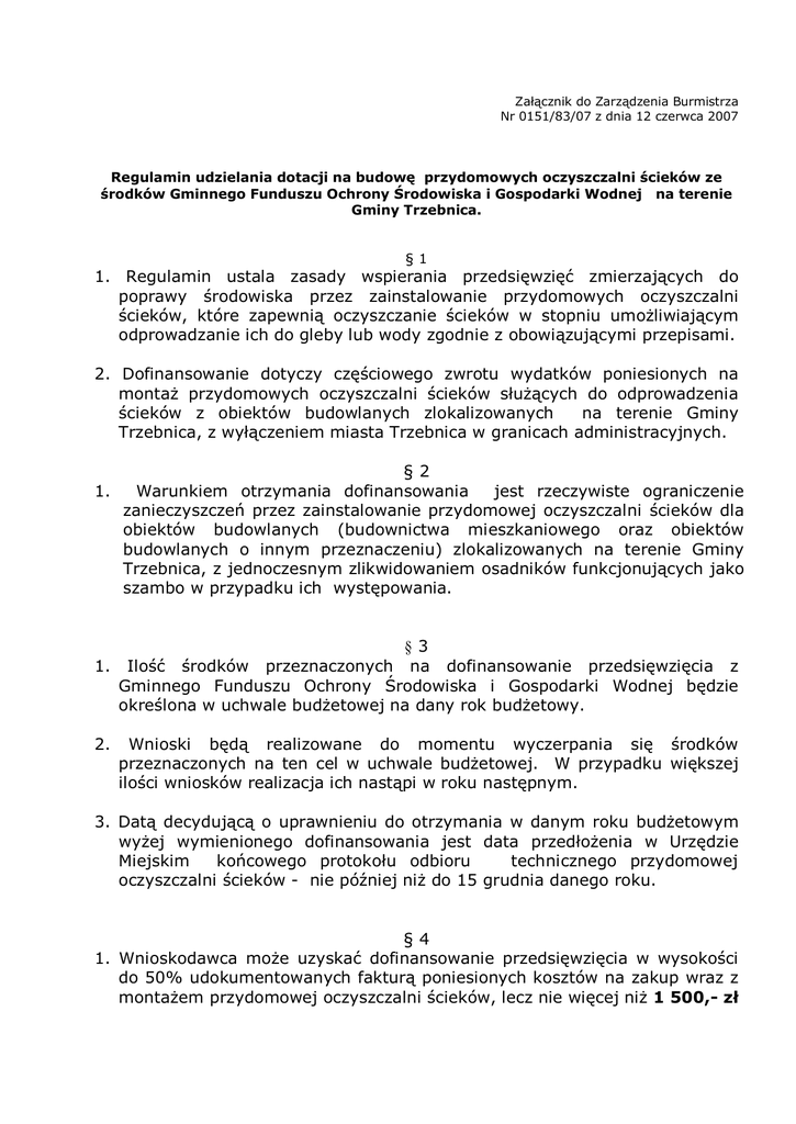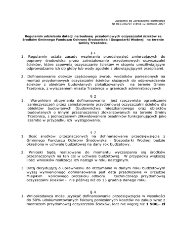 Załącznik do Zarządzenia Burmistrza Nr 0151/83/07 z dnia 12 czerwca 2007 Regulamin udzielania dotacji na budowę przydomowych oczyszczalni ścieków ze środków Gminnego Funduszu Ochrony Środowiska i Gospodarki Wodnej na terenie Gminy Trzebnica. §1 1. Regulamin ustala zasady wspierania przedsięwzięć zmierzających do poprawy środowiska przez zainstalowanie przydomowych oczyszczalni ścieków, które zapewnią oczyszczanie ścieków w stopniu umożliwiającym odprowadzanie ich do gleby lub wody zgodnie z obowiązującymi przepisami. 2. Dofinansowanie dotyczy częściowego zwrotu wydatków poniesionych na montaż przydomowych oczyszczalni ścieków służących do odprowadzenia ścieków z obiektów budowlanych zlokalizowanych na terenie Gminy Trzebnica, z wyłączeniem miasta Trzebnica w granicach administracyjnych. §2 1. Warunkiem otrzymania dofinansowania jest rzeczywiste ograniczenie zanieczyszczeń przez zainstalowanie przydomowej oczyszczalni ścieków dla obiektów budowlanych (budownictwa mieszkaniowego oraz obiektów budowlanych o innym przeznaczeniu) zlokalizowanych na terenie Gminy Trzebnica, z jednoczesnym zlikwidowaniem osadników funkcjonujących jako szambo w przypadku ich występowania. 1. 2. §3 Ilość środków przeznaczonych na dofinansowanie przedsięwzięcia z Gminnego Funduszu Ochrony Środowiska i Gospodarki Wodnej będzie określona w uchwale budżetowej na dany rok budżetowy. Wnioski będą realizowane do momentu wyczerpania się środków przeznaczonych na ten cel w uchwale budżetowej. W przypadku większej ilości wniosków realizacja ich nastąpi w roku następnym. 3. Datą decydującą o uprawnieniu do otrzymania w danym roku budżetowym wyżej wymienionego dofinansowania jest data przedłożenia w Urzędzie Miejskim końcowego protokołu odbioru technicznego przydomowej oczyszczalni ścieków - nie później niż do 15 grudnia danego roku. §4 1. Wnioskodawca może uzyskać dofinansowanie przedsięwzięcia w wysokości do 50% udokumentowanych fakturą poniesionych kosztów na zakup wraz z montażem przydomowej oczyszczalni ścieków, lecz nie więcej niż 1 500,- zł 2 ( słownie: tysiąc pięćset złotych) dla mieszkańców budynków jednorodzinnych, nie więcej niż 4500,-zł (słownie: cztery tysiące pięćset złotych) dla budynków wielorodzinnych. 2. Wnioskodawca tylko jednokrotnie może ubiegać się o otrzymanie dofinansowania ze środków Gminnego Funduszu Ochrony Środowiska i Gospodarki Wodnej. 3. Dotacją mogą być objęte wyłącznie systemy oczyszczania ścieków pochodzących z gospodarstw domowych lub rolnych, których przepustowość nie przekracza 5 m3 / dobę. §5 Procedura przyznawania pomocy 1. Wnioski o przyznanie dotacji należy składać po uchwaleniu przez Radę Miejską w Trzebnicy budżetu na rok, w którym dotacja ma zostać udzielona 2. Pisemny wniosek o przyznanie dotacji wraz z załącznikami należy złożyć na formularzu dostępnym Wydziale Rolnictwa i Ochrony Środowiska Urzędu Miejskiego w Trzebnicy lub na stronie internetowej BIP Urzędu Miejskiego w Trzebnicy. 3. Zakres złożonego wniosku o udzielenie dotacji nie może obejmować przedsięwzięć zrealizowanych przed złożeniem wniosku. 4. Weryfikację wniosków pod względem merytorycznym prowadzi Wydział Rolnictwa i Ochrony Środowiska. 5. O kolejności udzielania dotacji decyduje kolejność wpływu kompletnych wniosków. 6. Po dokonaniu weryfikacji wniosku, w terminie 30 dni od daty wpływu kompletnego wniosku, pomiędzy wnioskodawcą a gminą zawarta zostaje urnowa o udzielenie dotacji. 7. Po zrealizowaniu przedsięwzięcia wnioskodawca dostarcza do Urzędu Miejskiego w Trzebnicy dokumenty stwierdzające jego wykonanie, przewidziane umową. 8. W przypadku wykonania wszystkich zobowiązań, gmina wypłaca wnioskodawcy przyznaną dotację w terminie przewidzianym umową. 9. Wypłata dotacji nastąpi pod warunkiem: 1) dostarczenia przez wnioskodawcę: a) dokumentu świadczącego o dokonaniu zgłoszenia Staroście Trzebnickiemu budowy przydomowej oczyszczalni ścieków, b) kopii faktur/rachunków wraz z oryginałami, potwierdzających poniesienie nakładów; c) certyfikatu lub aprobaty technicznej, potwierdzających zgodność zakupionych urządzeń z obowiązującymi normami . 2) pisemnego potwierdzenia nie wniesienia sprzeciwu przez Starostwo Powiatowe w Trzebnicy, co do zgłoszenia budowy przydomowej oczyszczalni ścieków; 3) pisemnego potwierdzenia przez upoważnionego pracownika Urzędu Miejskiego uzyskania efektu rzeczowego przedsięwzięcia, w tym likwidacji starego szamba. 10.W przypadku niespełnienia któregokolwiek z warunków, o których mowa w ust. 8 i 9 wnioskodawca traci prawo do dotacji. 3 §6 4. Dofinansowaniu nie podlegają: 1) przydomowe oczyszczalnie ścieków zlokalizowane na obszarach gdzie istnieje możliwość przyłączenia posesji do istniejącej sieci kanalizacji sanitarnej, 2) koszty zakupu pojedynczych elementów (urządzeń) przydomowych oczyszczalni ścieków, 3) koszty robocizny wykonane we własnym zakresie przez wnioskodawcę. 4) koszty sporządzonej dokumentacji.
