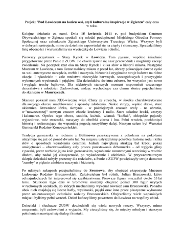 Projekt "Pod Łowiczem na końcu wsi, czyli kulturalne inspiracje w Zgierzu" cały czas w toku. Kolejne działanie za nami. Dnia 15 kwietnia 2011 r. pod budynkiem Centrum Obywatelskiego w Zgierzu spotkali się młodzi podopieczni Miejskiego Ośrodka Pomocy Społecznej oraz członkowie Zgierskiego Uniwersytetu Trzeciego Wieku. Wszyscy byli w dobrych nastrojach, mimo że dzień nie zapowiadał się na ciepły i słoneczny. Sprawdziliśmy listę obecności i wyruszyliśmy na wycieczkę do Łowicza i okolic. Pierwszy przystanek – Stary Rynek w Łowiczu. Tam pyszne, wspólne śniadanie przygotowane przez Panie z ZU3W. Po chwili zjawił się nasz przewodnik i mogliśmy zacząć zwiedzanie. Na początek rzut oka na Stary Rynek i kilka słów o historii miasta. Następnie Muzeum w Łowiczu, a tam liczne makiety miasta z przed lat, obrazy pokazujące dawne życie na wsi; autentyczne narzędzia, meble i naczynia, biżuteria i oryginalne stroje ludowe na różne okazje. I rękodzieło – całe mnóstwo niezwykle barwnych, szczegółowych i precyzyjnie wykonanych wycinanek i pająków. Dla dzieciaków świetna zabawa, bo wszystko jest nowe i wygląda trochę bajkowo. Dla niektórych starszych moment wspomnień wczesnego dzieciństwa i młodości. Zadowoleni, widząc wychodzące zza chmur słońce pojechaliśmy do skansenu w Maurzycach. Skansen pokazał nam XIX-wieczną wieś. Chaty ze strzechą, w środku charakterystyczne dla swojego okresu umeblowanie i sposoby zdobienia. Niskie stropy, wąskie drzwi, stare okiennice. Drewniane łóżka, skrzynie - w późniejszych czasach szafy - na ubrania, w "nowoczesnej" tamtym czasom chacie kredensy i radio. Stare szkolne ławki, zeszyty i kałamarze. Oprócz tego obora, stodoła, kuźnia, wiatrak "koźlak", chłopskie pojazdy wyjazdowe, wóz strażacki, maszyny do obróbki ziarna i lnu. Pełni wrażeń, pochłonięci historią i rozkoszujący się wspaniałą pogodą ruszyliśmy dalej. Naszym celem był Warsztat Garncarski Rodziny Konopczyńskich. Tradycja garncarska w rodzinie z Bolimowa przekazywana z pokolenia na pokolenie utrzymuje się już od ponad dwustu lat. Na miejscu usłyszeliśmy pokrótce historię rodu i kilka słów o sposobach wyrabiania ceramiki. Jednak największą atrakcją był krótki pokaz umiejętności – obserwowaliśmy cały proces powstawania dzbanuszka – od wyjęcia gliny z paczki, przez rozbicie jej na kole garncarskim, wyrabianie zanurzonymi wcześniej w wodzie dłońmi, aby nadać jej elastyczność, po wykańczanie i zdobienie. W przywarsztatowym sklepie dzieciaki nabyły prezenty dla rodziców, a Panie z ZU3W powiększyły swoje domowe "zasoby" o pięknie zdobione naczynia i biżuterię. Po udanych zakupach przejechaliśmy do Sromowa, aby obejrzeć ekspozycję Muzeum Ludowego Rodziny Brzozowskich. Założycielem był rolnik, Julian Brzozowski, który od najmłodszych lat interesował się rzeźbiarstwem. Pierwsze figury wyrzeźbił około 55 lat temu. Skutkiem tego dziś w Sromowie możemy obejrzeć ponad 300 figur użytych w ruchomych scenkach, do których mechanizmy wykonał również sam Brzozowski. Ponadto obok nich znajdują się liczne hafty, wycinanki, pająki oraz inne prace plastyczne wykonane przez utalentowanych członków rodziny Brzozowskich. Obejrzeliśmy wiele wspaniałych miejsc i byliśmy pełni wrażeń. Dzień kończyliśmy powrotem do Łowicza na wspólny obiad. Dzieciaki i słuchacze ZU3W dowiedzieli się wielu nowych rzeczy. Wszyscy, mimo zmęczenia, byli zadowoleni z wyjazdu. My cieszyliśmy się, że między młodym i starszym pokoleniem nawiązał się dialog i kontakt. - "Jesteśmy bardzo zadowoleni i miło zaskoczeni postawą dzieci. Wiadomo, że nie zawsze młodzi chcą spędzać czas ze starszymi od siebie, ale mieliśmy kilku młodych "kompanów" chętnych do rozmowy." - mówiła jedna ze słuchaczek U3W. - "Dla mnie muzea są raczej mało ciekawe, ale w skansenach było fajnie, bo można było wszystko zobaczyć z bliska i wyobrazić sobie jak kiedyś żyli ludzie." - powiedziała podopieczna MOPS. Cieszymy się, że uczestnicy byli zadowoleni i wyrazili chęć dalszej współpracy i integracji międzypokoleniowej. Dziękujemy również Panu Maćkowi Malangiewiczowi za pomoc i zaangażowanie w organizację wycieczki! Zapraszamy do śledzenia strony projektu i udziału w naszych kolejnych działaniach! Paula Baranowska