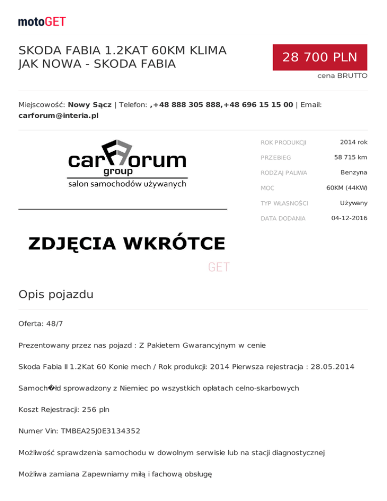 SKODA FABIA 1.2KAT 60KM KLIMA JAK NOWA - SKODA FABIA 28 700 PLN cena BRUTTO Miejscowość: Nowy Sącz | Telefon: ,+48 888 305 888,+48 696 15 15 00 | Email: [email protected] 2014 rok 58 715 km Benzyna 60KM (44KW) Używany 04-12-2016 Opis pojazdu Oferta: 48/7 Prezentowany przez nas pojazd : Z Pakietem Gwarancyjnym w cenie Skoda Fabia II 1.2Kat 60 Konie mech / Rok produkcji: 2014 Pierwsza rejestracja : 28.05.2014 Samoch�łd sprowadzony z Niemiec po wszystkich opłatach celno-skarbowych Koszt Rejestracji: 256 pln Numer Vin: TMBEA25J0E3134352 Możliwość sprawdzenia samochodu w dowolnym serwisie lub na stacji diagnostycznej Możliwa zamiana Zapewniamy miłą i fachową obsługę WYPOSAŻENIE SAMOCHODU: - wspomaganie kierownicy - 5-biegowa skrzynia bieg�łw - klimatyzacja - ABS / ESP - el. szyby x 2 - lusterka regulowane manualnie - radio CD z AUX - opony 185/60 R14 lato Continental bdb - 4 x airbag (poduszki powietrzne) - tylna szyba podgrzewana - zderzaki w kolorze nadwozia - tapicerka czarno-szara - system isofix - podgrzewane fotele prz�łd - ilość kluczyk�łw : x 2 HISTORIA SAMOCHODU: - Sprowadzony z Niemiec - przebieg w/g wskazań licznika zweryfikowany przez importera - serwisowany - bezwypadkowy - samoch�łd nie wymaga wkładu finansowego - KUPUJĄCY ZWOLNIONY Z OPŁATY SKARBOWEJ 2%(oszczędzasz ok.600 zł) - WYSTAWIAMY FAKTURĘ VAT-MARŻA lub FAKTURĘ VAT 23% (na życzenie klienta Firma CarForum TO DOBRY WYBÓR Działamy od 15 lat Gwarancja legalności pojazd�łw Umożliwiamy państwu kompleksowe sprawdzenie pojazdu Kredyty: - dla os�łb zatrudnionych na umowę o pracę, - prowadzących działalność gospodarczą, rolnik�łw, - emeryt�łw, rencist�łw itp. - oferty kilku bank�łw Decyzja kredytowa na telefon Możliwość zakupu samochodu w kredycie/leasingu Przyjmujemy auta w rozliczeniu NASZ ADRES 33-300 Nowy Sącz ul. Piłsudskiego 1 (naprzeciw restauracji McDonald s) Godziny otwarcia: Poniedziałek - Piątek: 08:00 - 18:00 oraz po uzgodnieniu telefonicznym Sobota - Niedziela: 08:00 - 16:00 oraz po uzgodnieniu telefonicznym -"Oświadczam, że opis aukcji oraz zdjęcia w niej wykorzystane są mojego autorstwa. Kopiowanie, przetwarzanie i rozpowszechnianie tych materiał�łw w całości lub w części bez mojej zgody jest zabronione i stanowi naruszenie praw autorskich. Podstawa prawna: Dz. U. 94 nr 24 poz. 83, sprost.: Dz. U. 94 nr 43 poz. 170. " Niniejsze ogłoszenie jest wyłącznie informacją handlową i nie stanowi oferty w myśl art. 66, § 1. Kodeksu Cywilnego. Sprzedający nie odpowiada za ewentualne błędy lub nieaktualność ogłoszenia. - Zapis ten został zawarty ze względu na możliwość drobnych, ludzkich pomyłek. Jeżeli zauważysz nieścisłości, błędy napisz lub zadzwoń do nas a niezwłocznie je poprawimy. - bezwypadkowy - ASR - welurowa tapicerka - podgrzewane fotele - ESP - ABS - centr. zamek - el. szyby - immobiliser - klimatyzacja automatyczna - komputer - poduszki - radio z CD - wsp. kierownicy
