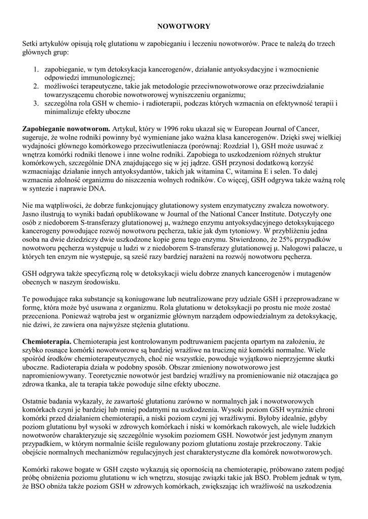 NOWOTWORY Setki artykułów opisują rolę glutationu w zapobieganiu i leczeniu nowotworów. Prace te należą do trzech głównych grup: 1. zapobieganie, w tym detoksykacja kancerogenów, działanie antyoksydacyjne i wzmocnienie odpowiedzi immunologicznej; 2. możliwości terapeutyczne, takie jak metodologie przeciwnowotworowe oraz przeciwdziałanie towarzyszącemu chorobie nowotworowej wyniszczeniu organizmu; 3. szczególna rola GSH w chemio- i radioterapii, podczas których wzmacnia on efektywność terapii i minimalizuje efekty uboczne Zapobieganie nowotworom. Artykuł, który w 1996 roku ukazał się w European Journal of Cancer, sugeruje, że wolne rodniki powinny być wymieniane jako ważna klasa kancerogenów. Dzięki swej wielkiej wydajności głównego komórkowego przeciwutleniacza (porównaj: Rozdział 1), GSH może usuwać z wnętrza komórki rodniki tlenowe i inne wolne rodniki. Zapobiega to uszkodzeniom różnych struktur komórkowych, szczególnie DNA znajdującego się w jej jądrze. GSH przynosi dodatkową korzyść wzmacniając działanie innych antyoksydantów, takich jak witamina C, witamina E i selen. To dalej wzmacnia zdolność organizmu do niszczenia wolnych rodników. Co więcej, GSH odgrywa także ważną rolę w syntezie i naprawie DNA. Nie ma wątpliwości, że dobrze funkcjonujący glutationowy system enzymatyczny zwalcza nowotwory. Jasno ilustrują to wyniki badań opublikowane w Journal of the National Cancer Institute. Dotyczyły one osób z niedoborem S-transferazy glutationowej μ, ważnego enzymu antyoksydacyjnego detoksykującego kancerogeny powodujące rozwój nowotworu pęcherza, takie jak dym tytoniowy. W przybliżeniu jedna osoba na dwie dziedziczy dwie uszkodzone kopie genu tego enzymu. Stwierdzono, że 25% przypadków nowotworu pęcherza występuje u ludzi w z niedoborem S-transferazy glutationowej μ. Nałogowi palacze, u których ten enzym nie występuje, są sześć razy bardziej narażeni na rozwój nowotworu pęcherza. GSH odgrywa także specyficzną rolę w detoksykacji wielu dobrze znanych kancerogenów i mutagenów obecnych w naszym środowisku. Te powodujące raka substancje są koniugowane lub neutralizowane przy udziale GSH i przeprowadzane w formę, która może być usuwana z organizmu. Rola glutationu w detoksykacji po prostu nie może zostać przeceniona. Ponieważ wątroba jest w organizmie głównym narządem odpowiedzialnym za detoksykację, nie dziwi, że zawiera ona najwyższe stężenia glutationu. Chemioterapia. Chemioterapia jest kontrolowanym podtruwaniem pacjenta opartym na założeniu, że szybko rosnące komórki nowotworowe są bardziej wrażliwe na truciznę niż komórki normalne. Wiele spośród środków chemioterapeutycznych, choć nie wszystkie, powoduje wyjątkowo nieprzyjemne skutki uboczne. Radioterapia działa w podobny sposób. Obszar zmieniony nowotworowo jest napromieniowywany. Teoretycznie nowotwór jest bardziej wrażliwy na promieniowanie niż otaczająca go zdrowa tkanka, ale ta terapia także powoduje silne efekty uboczne. Ostatnie badania wykazały, że zawartość glutationu zarówno w normalnych jak i nowotworowych komórkach czyni je bardziej lub mniej podatnymi na uszkodzenia. Wysoki poziom GSH wyraźnie chroni komórki przed działaniem chemioterapii, a niski poziom czyni jej wrażliwymi. Byłoby idealnie, gdyby poziom glutationu był wysoki w zdrowych komórkach i niski w komórkach rakowych, ale wiele ludzkich nowotworów charakteryzuje się szczególnie wysokim poziomem GSH. Nowotwór jest jedynym znanym przypadkiem, w którym normalnie ściśle regulowany poziom glutationu zostaje przekroczony. Takie obejście normalnych mechanizmów regulacyjnych jest charakterystyczne dla komórek nowotworowych. Komórki rakowe bogate w GSH często wykazują się opornością na chemioterapię, próbowano zatem podjąć próbę obniżenia poziomu glutationu w ich wnętrzu, stosując związki takie jak BSO. Problem jednak w tym, że BSO obniża także poziom GSH w zdrowych komórkach, zwiększając ich wrażliwość na uszkodzenia spowodowane przez chemioterapię. Takie rozwiązanie jest więc niepraktyczne. Niemniej jednak, mogą istnieć sposoby wybiórczego obniżania poziomu GSH w komórkach nowotworowych. Paradoksalnie, prekursory, które podnoszą poziom glutationu w zdrowych komórkach, wywierają przeciwny efekt w komórkach nowotworowych. Gdy produkcja GSH jest nadmiernie wystymulowana w komórkach nowotworowych, dochodzi do zjawiska zwanego ujemnym sprzężeniem zwrotnym, które czyni je bardziej podatnymi na destrukcję. W tym samym czasie normalne komórki używają prekursorów do produkcji glutatuionu, dostarczając sobie lepszej obrony. Paradoks ten został opisany w Journal of Cancer Research już w 1986 roku przez zespół kierowany przez A. Russo. Gdy OTZ (związek podnoszący poziom GSH) podawano ludzkim komórkom nowotworowym, poziom GSH w ich wnętrzu nie wzrastał, mimo iż działo się tak w otaczających je normalnych komórkach. Naukowcy z McGill University, S. Baruchel, G. Batist i ich zespół, wykazali, że OTZ może obniżać poziom GSH w komórkach raka piersi, jednocześnie podwyższając go w normalnych komórkach. Później zespół ten współpracował z G. Bounousem i opublikował w Journal of Cancer Research podobne wyniki dotyczące Immunocalu, izolatu z białka serwatki. Badania z wykorzystaniem tego samego produktu przeprowadzono także na pacjentach z nowotworem złośliwym z przerzutami. Byli oni karmieni Immunocalem przez sześć miesięcy. Chociaż nie wyleczyło to nowotworu, nastąpiła znacząca regresja lub stabilizacja rozwoju guza. U wielu osób nastąpiła także normalizacja poziomu hemoglobiny i liczby białych krwinek. Ci sami badacze wykazali, że zwiększenie poziomu GSH może wzmacniać przeciwnowotworowe działanie czynników chemioterapeutycznych. Chemio- i radioterapia prowadzi do ogromnego wzrostu wytwarzania wolnych rodników i toksycznych metabo